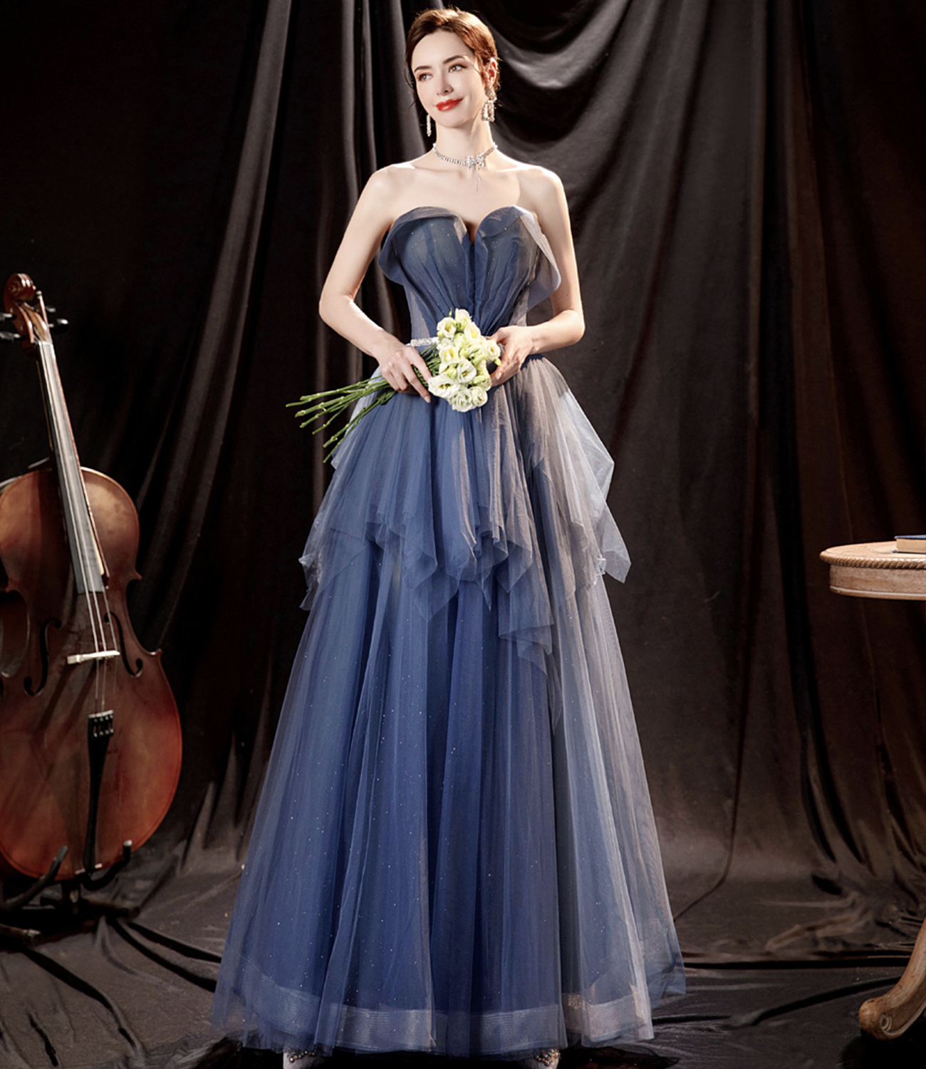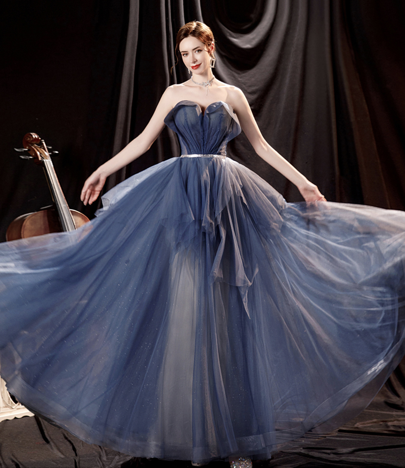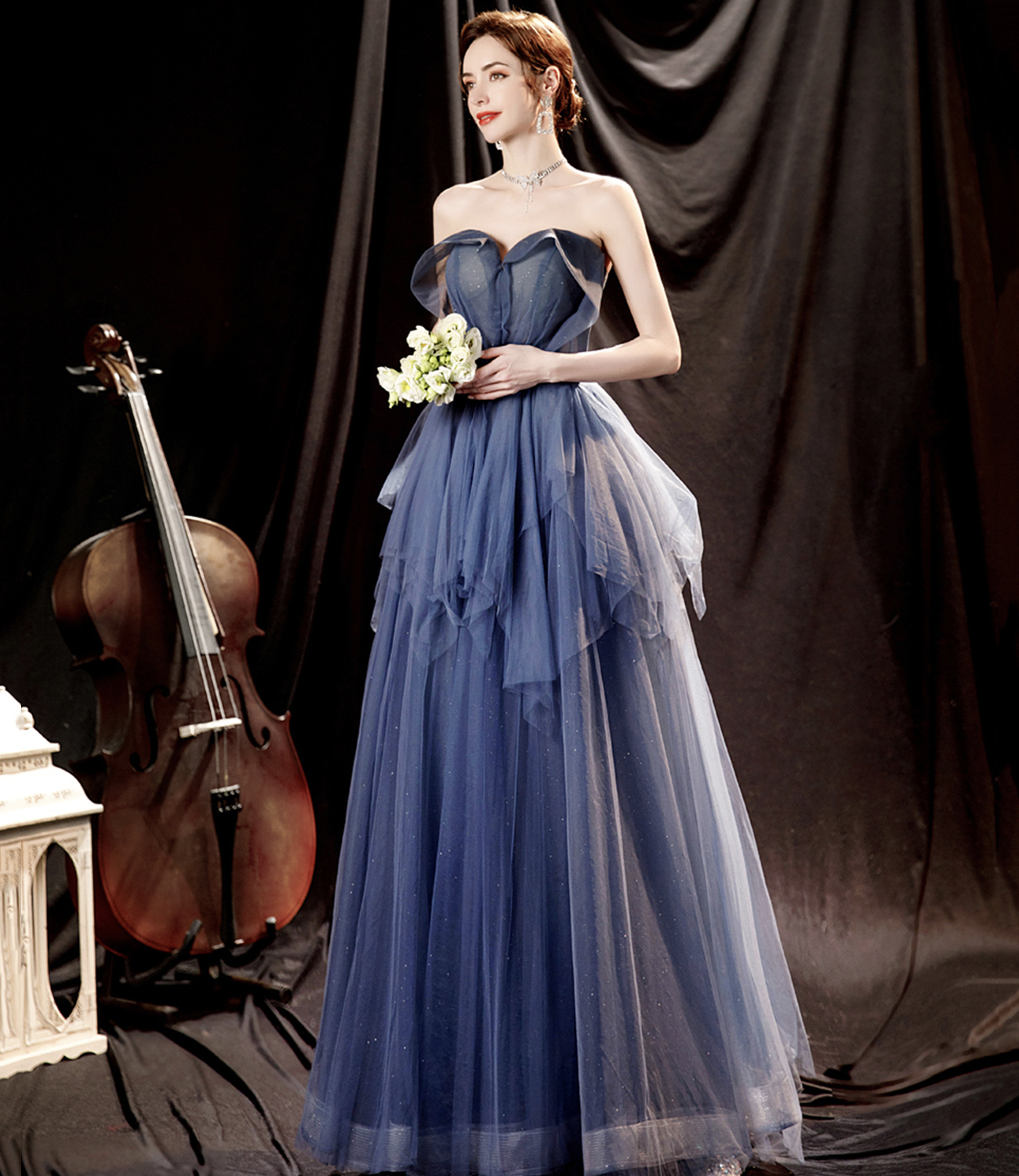 - Blue tulle long A line prom dress blue evening dress -