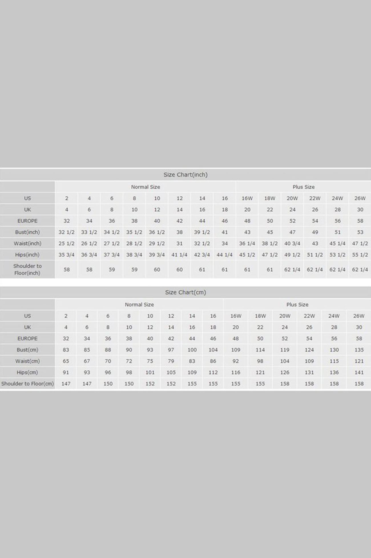 US 8 Bust(inch)35 1/2 Waist(inch)28 1/2 Hips(inch)38 3/4 Shoulder to Floor(inch)59