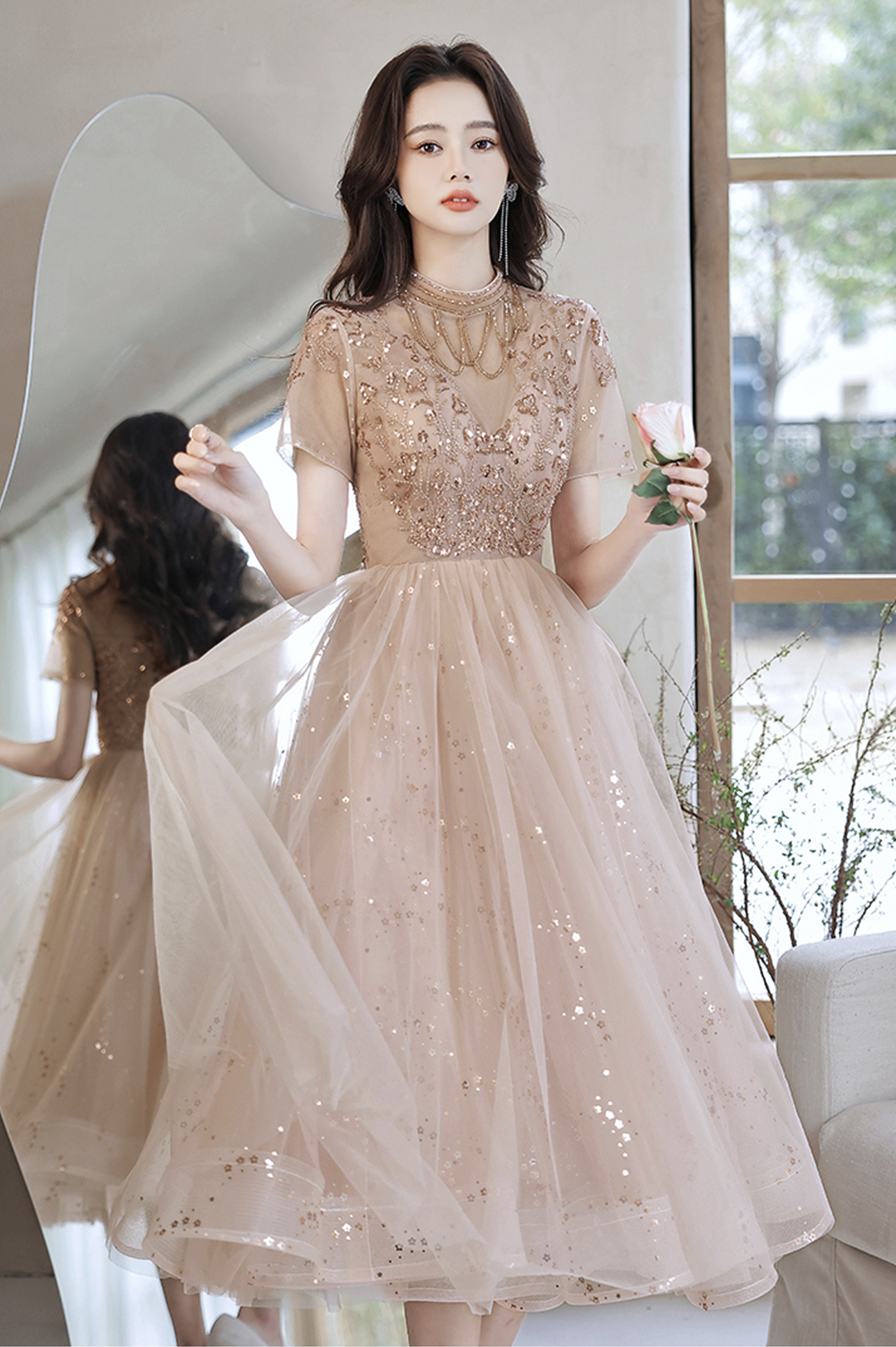 - Cute tulle beads short prom dress A line party dress -