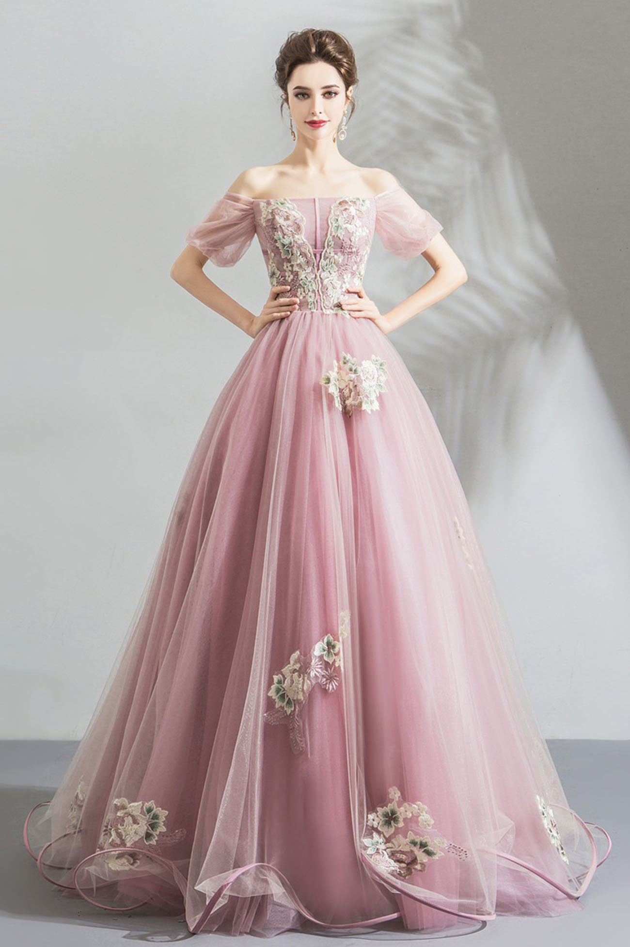 - Pink tulle lace long prom dress evening dress -