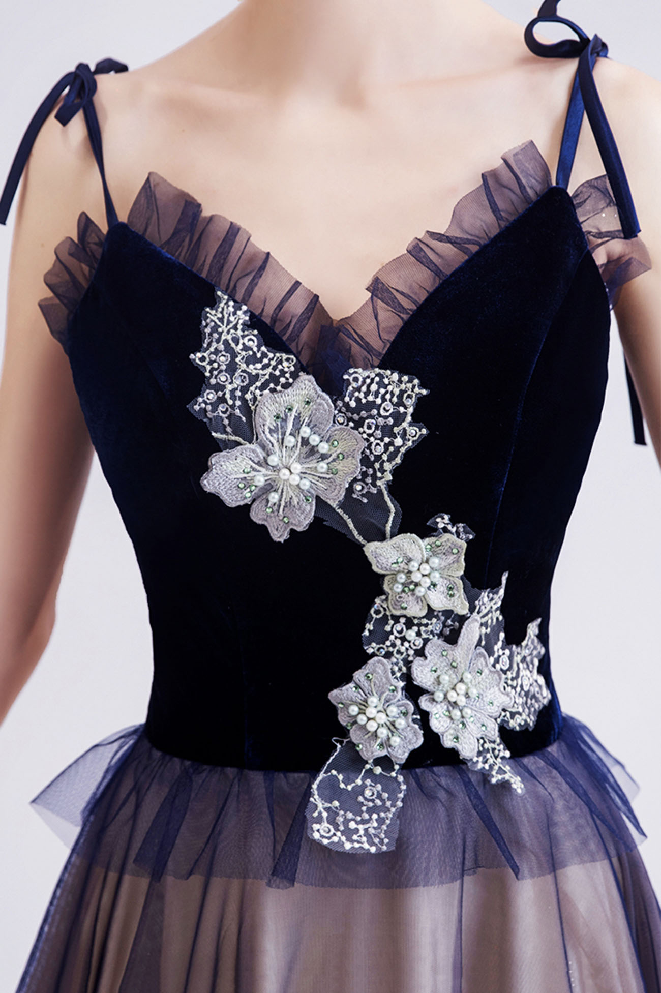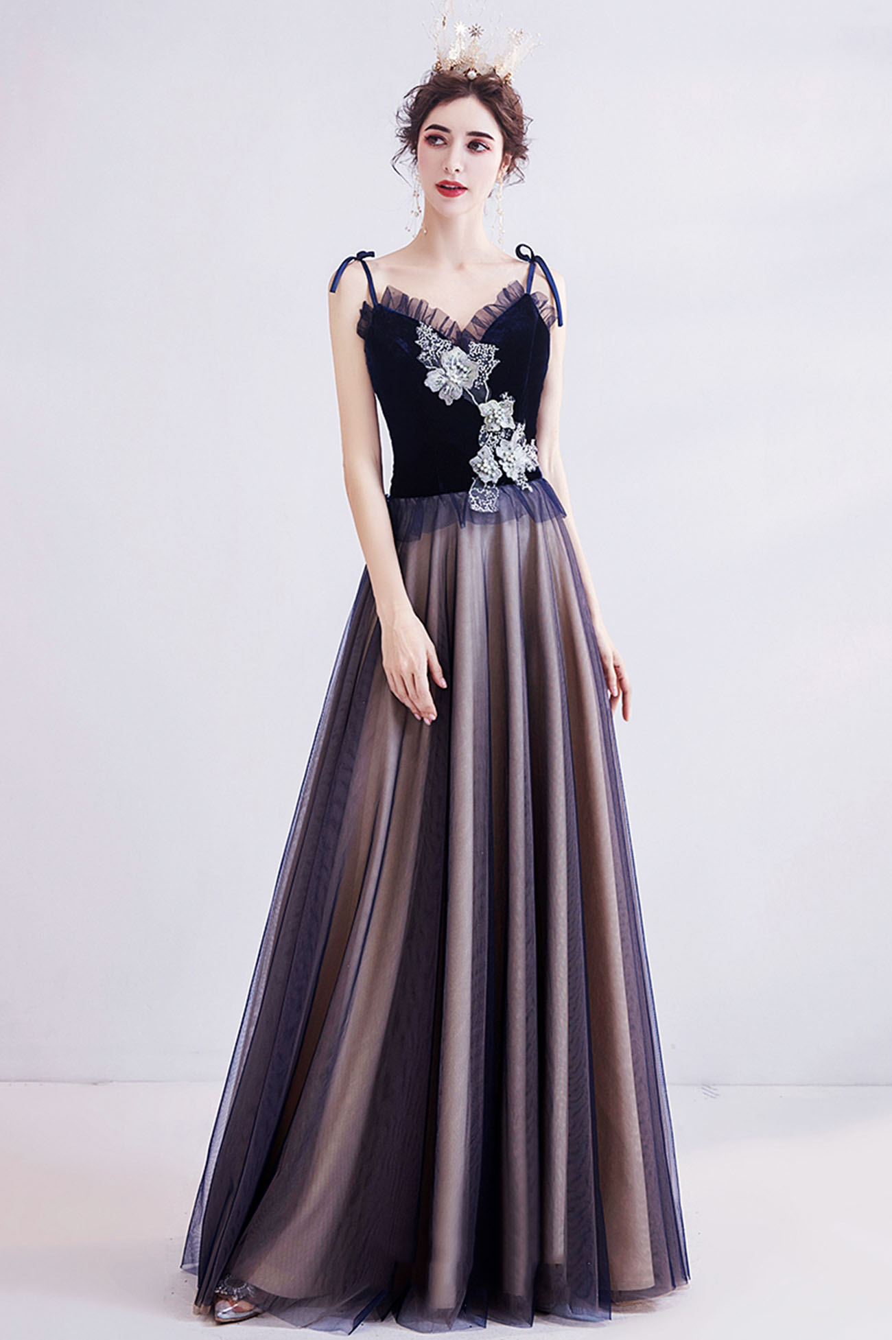 - Blue tulle lace long prom dress blue evening dress -
