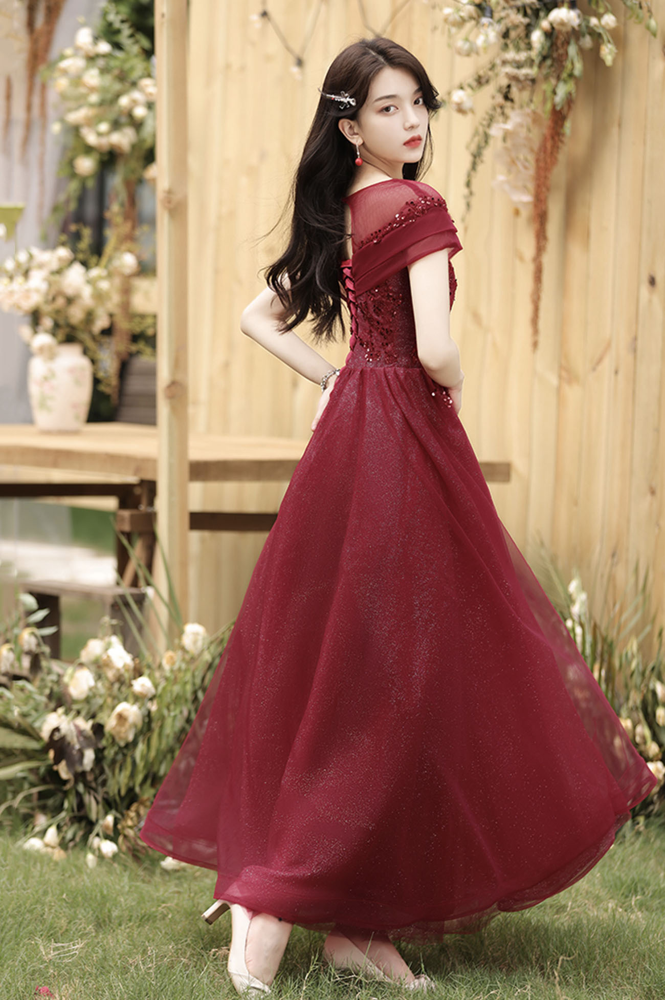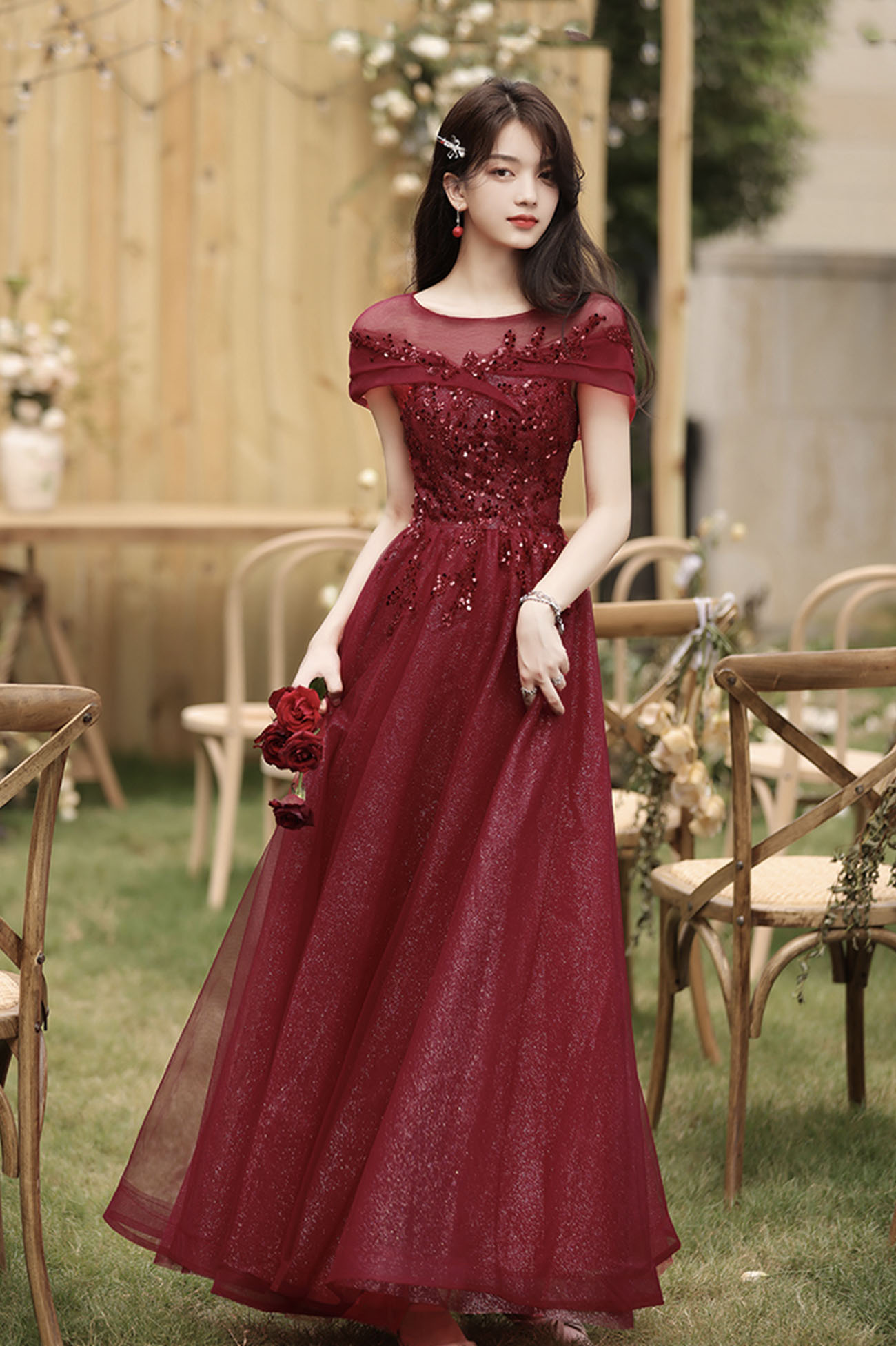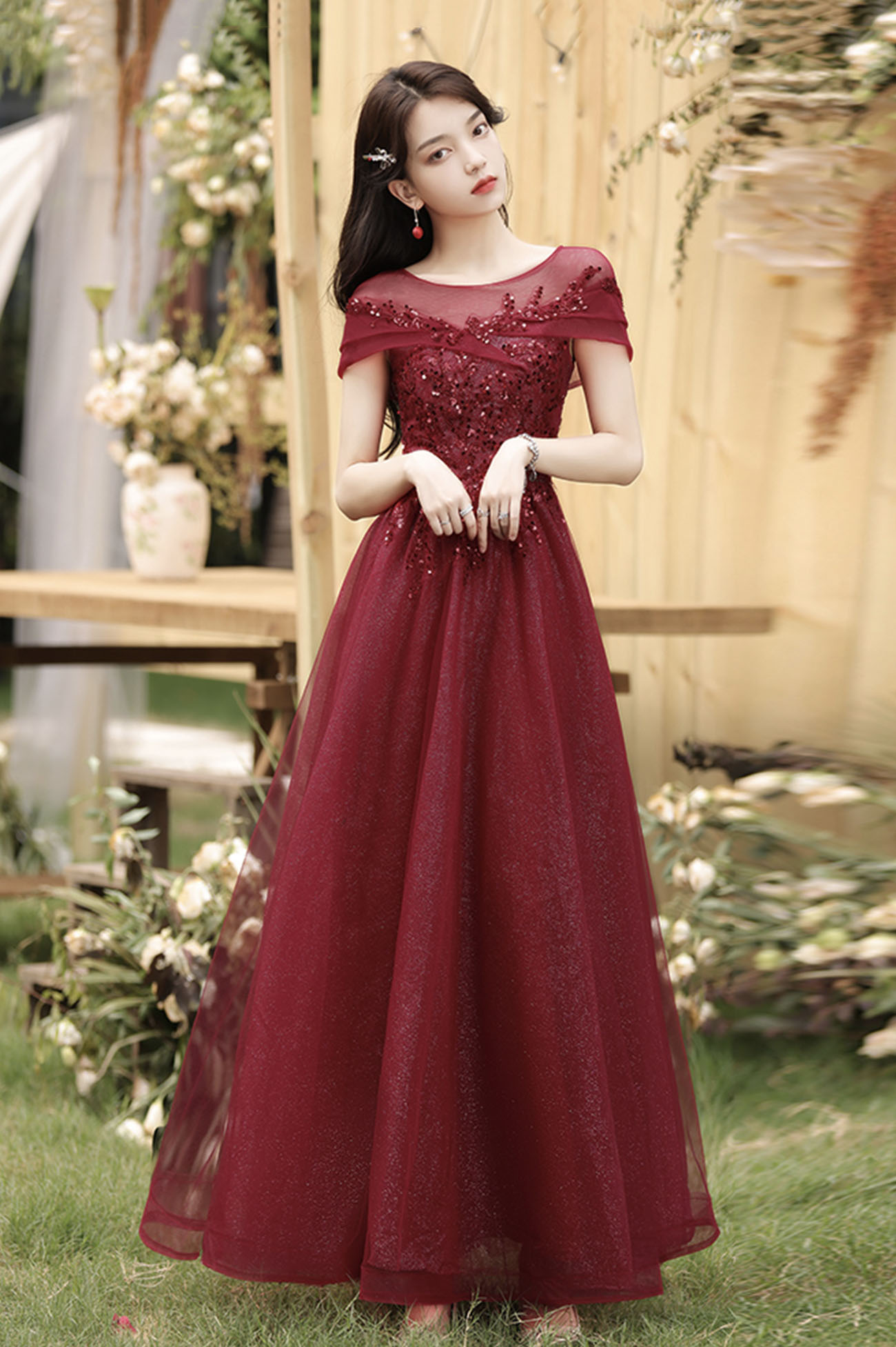 - Burgundy tulle sequins long prom dress A line evening dress -