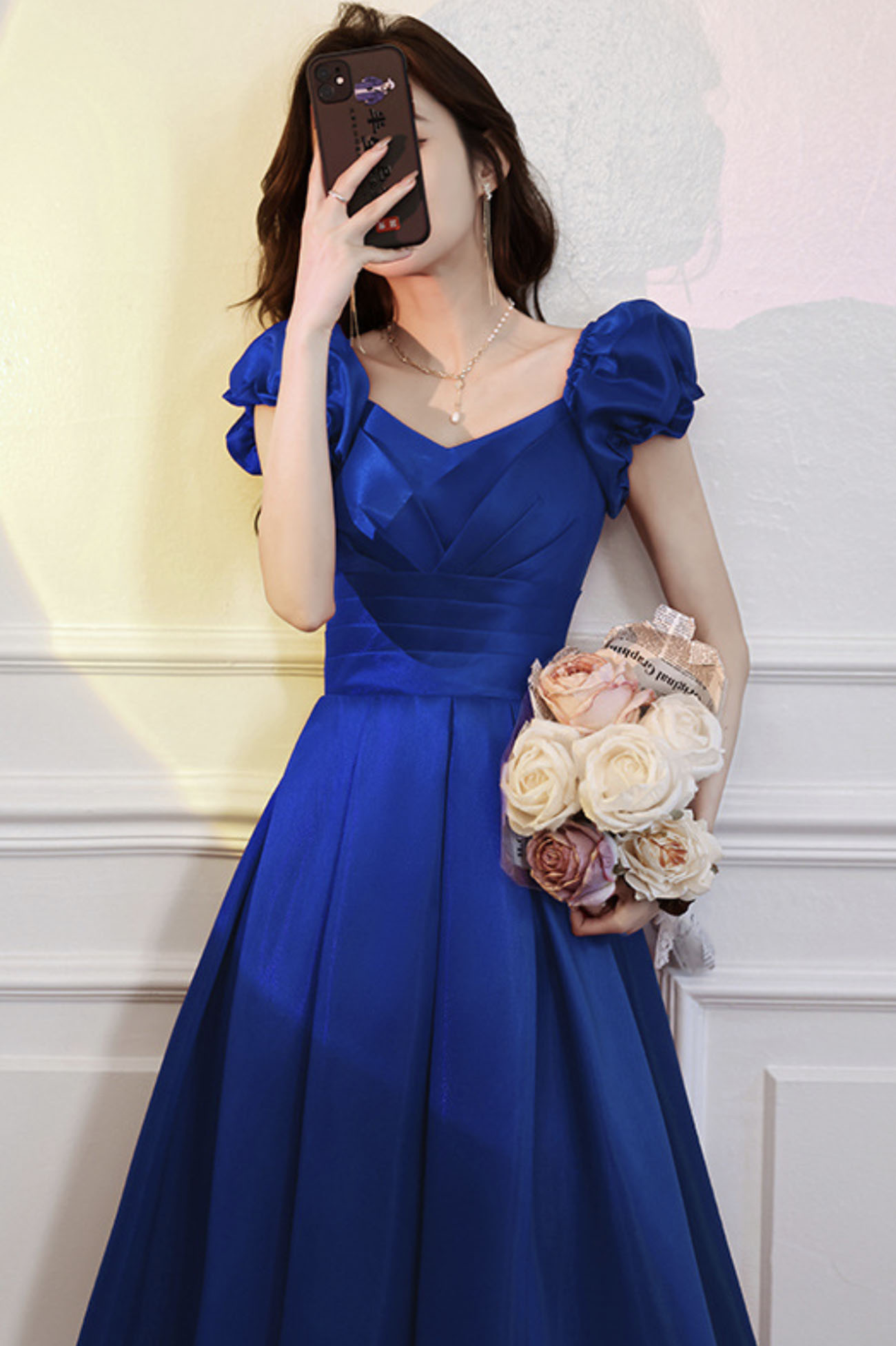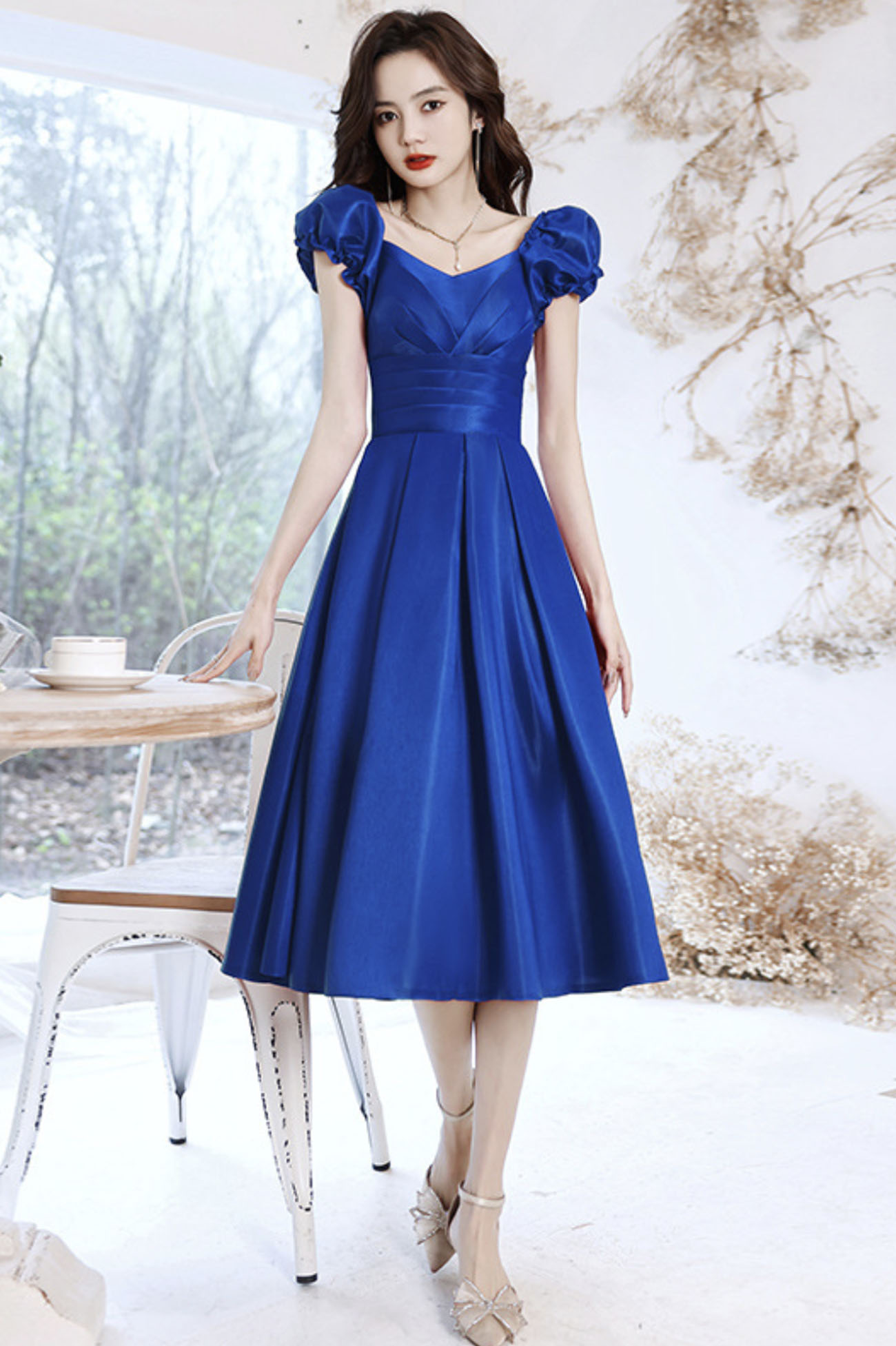 - Blue satin short A line prom dress homecoming dress -