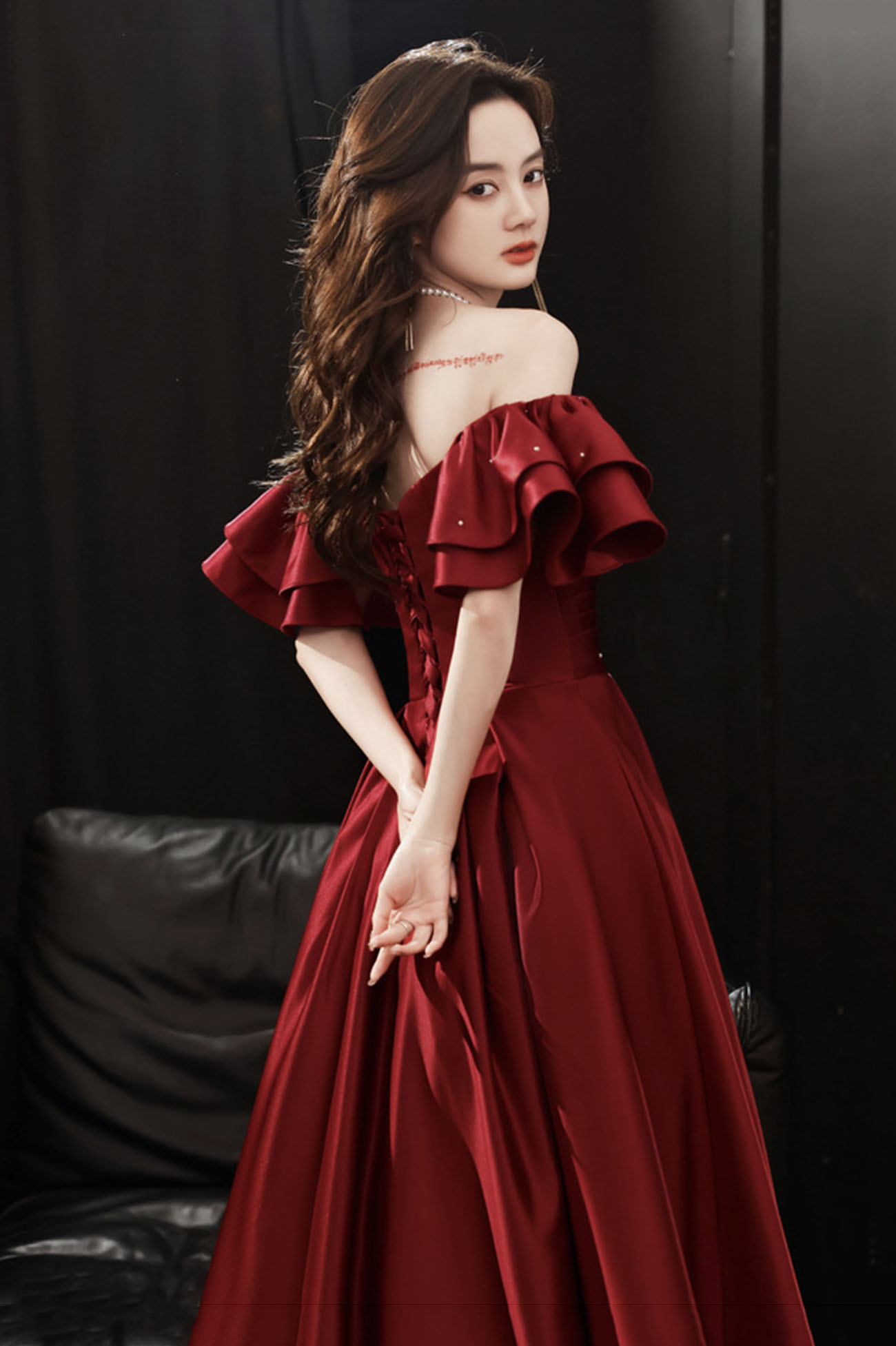 - Burgundy satin long prom dress A line evening dress -