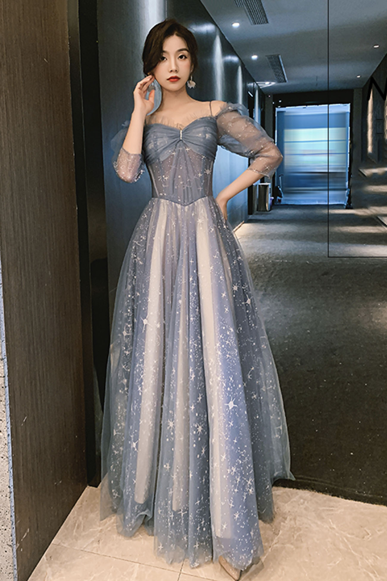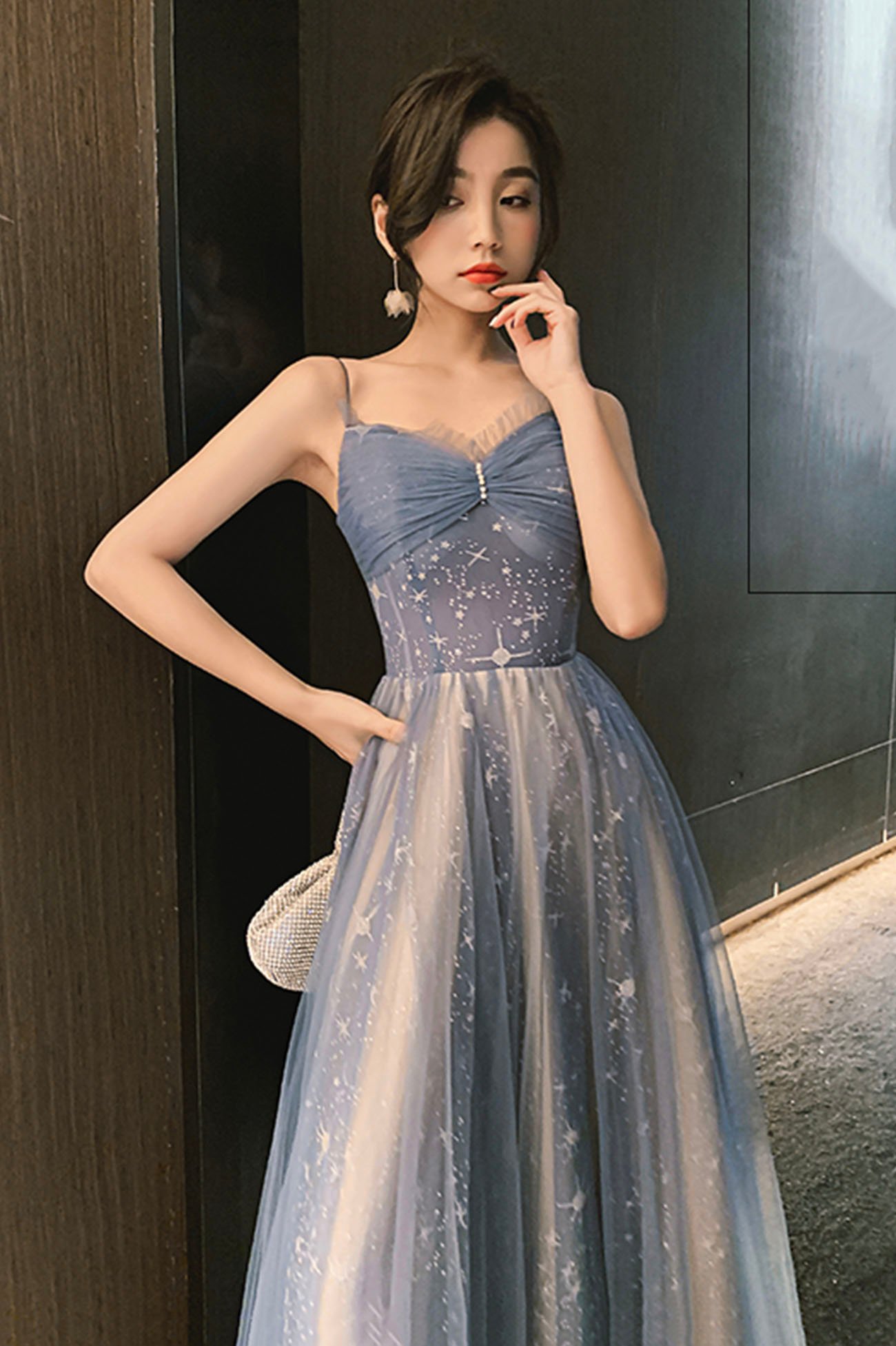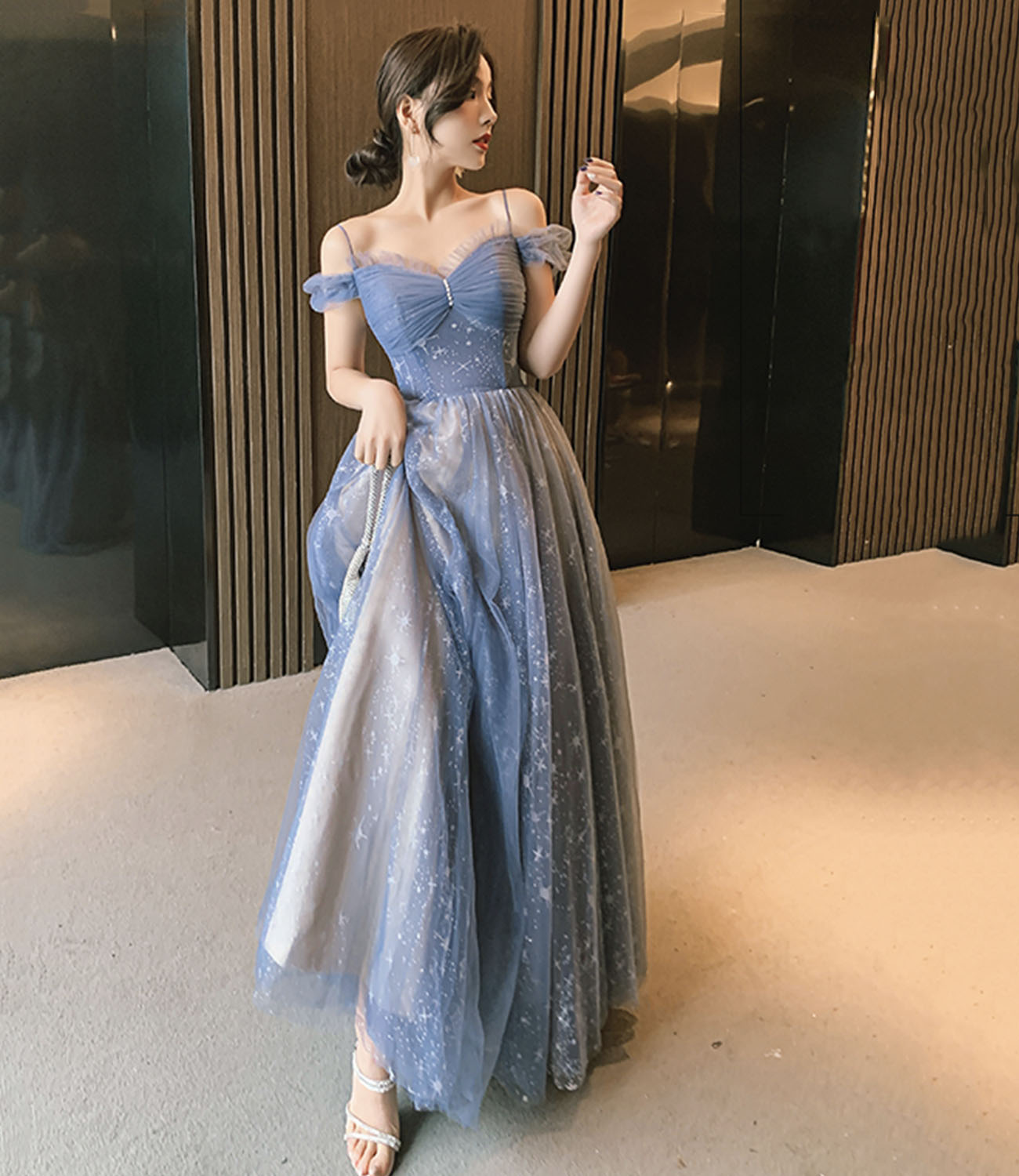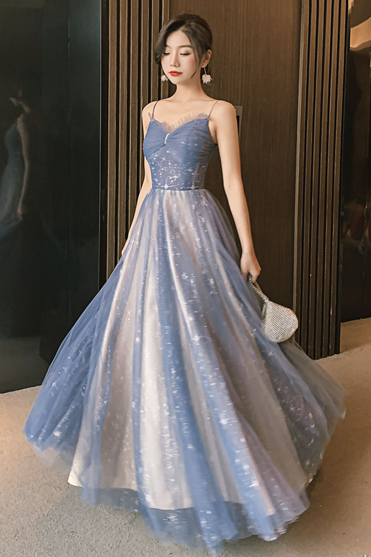 - Blue tulle long prom dress blue evening dress -