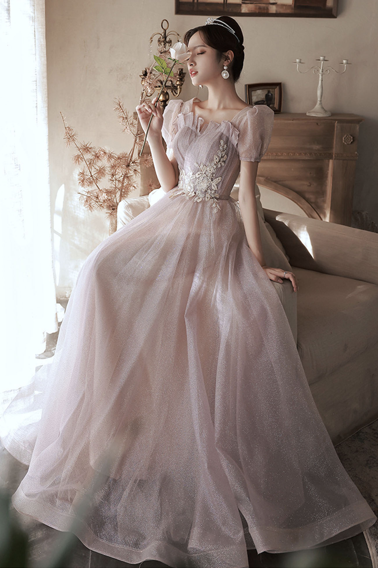 - Pink tulle lace long prom dress pink evening dress -