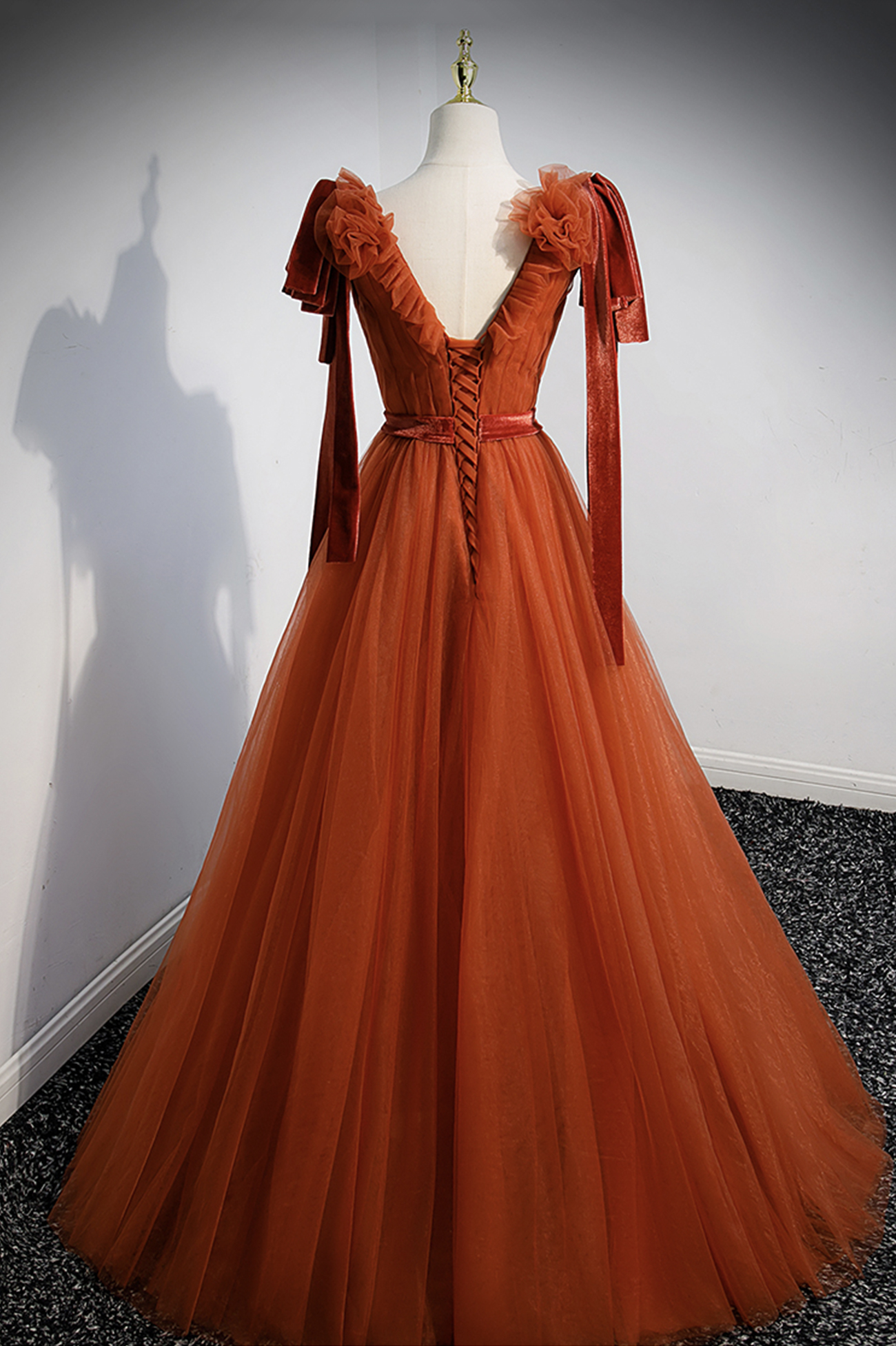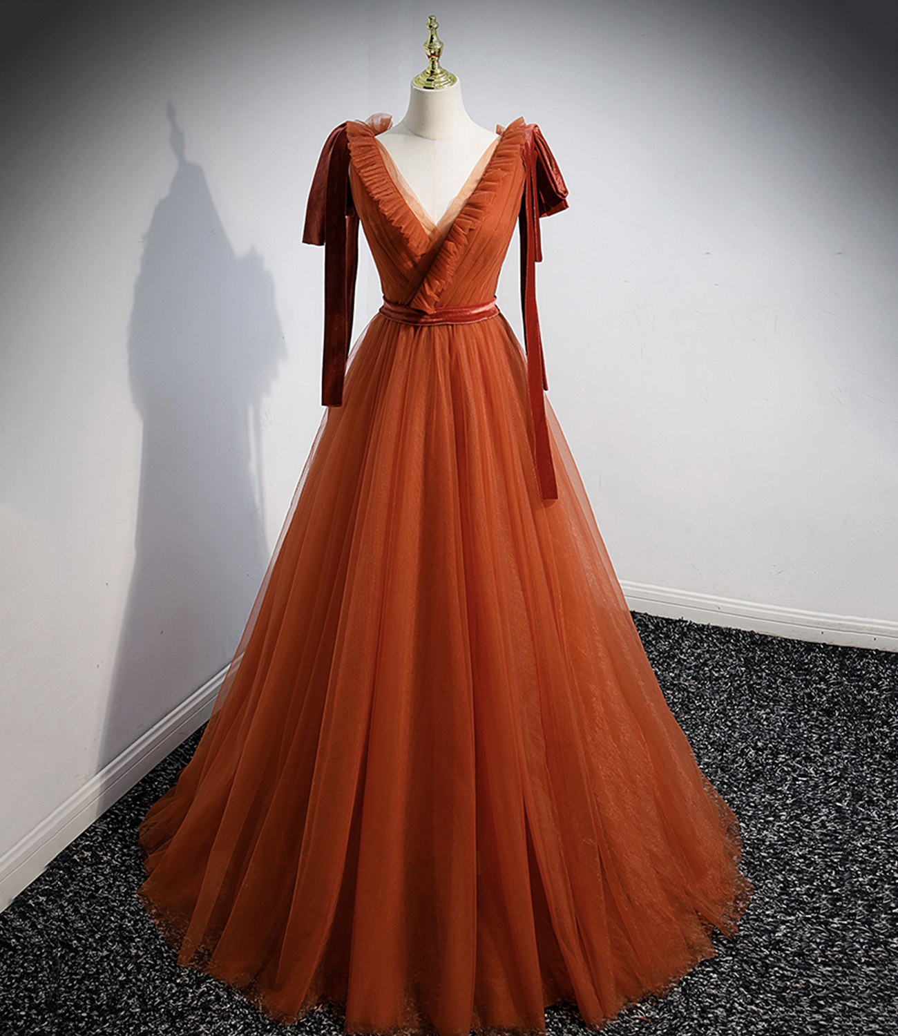 - Simple v neck tulle long prom dress A line evening dress -