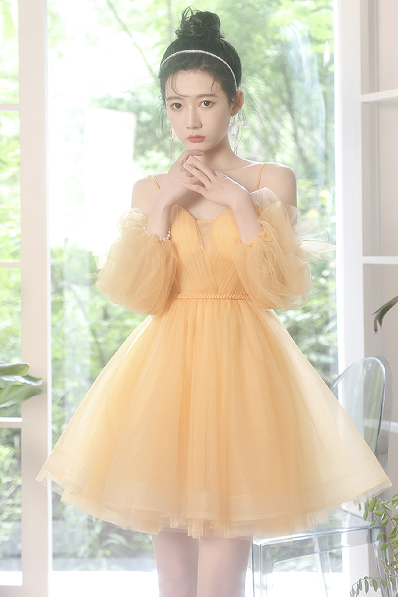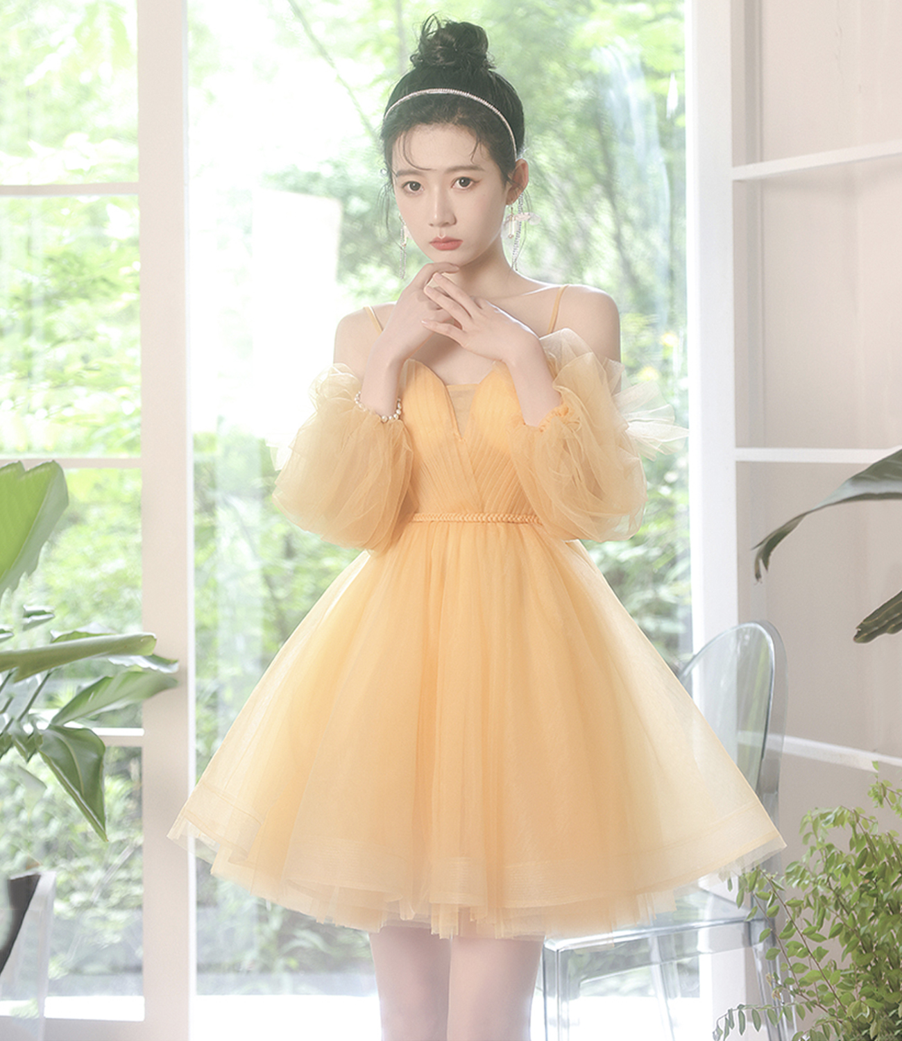 - Yellow tulle short prom dress A line homecoming dress -