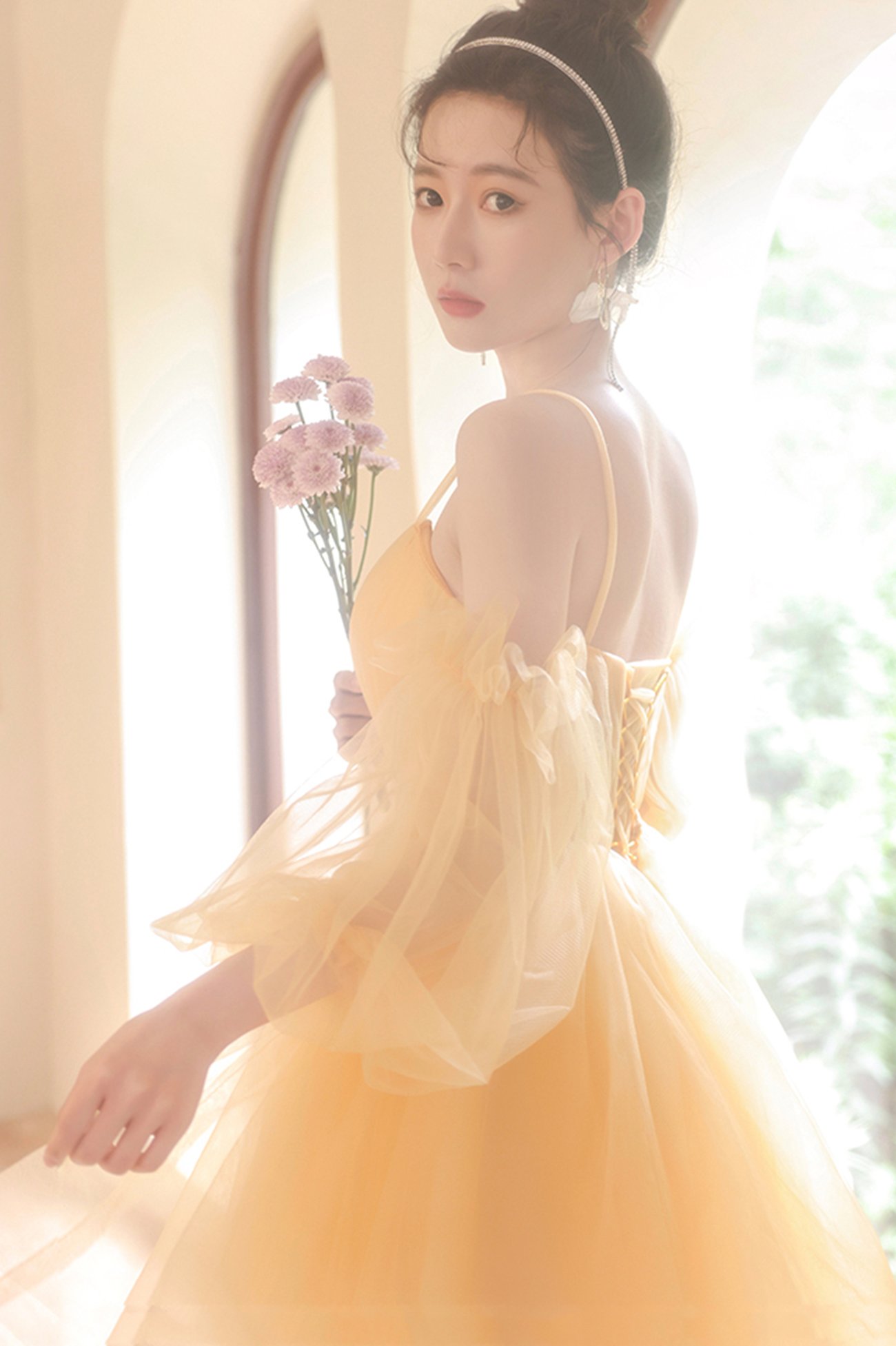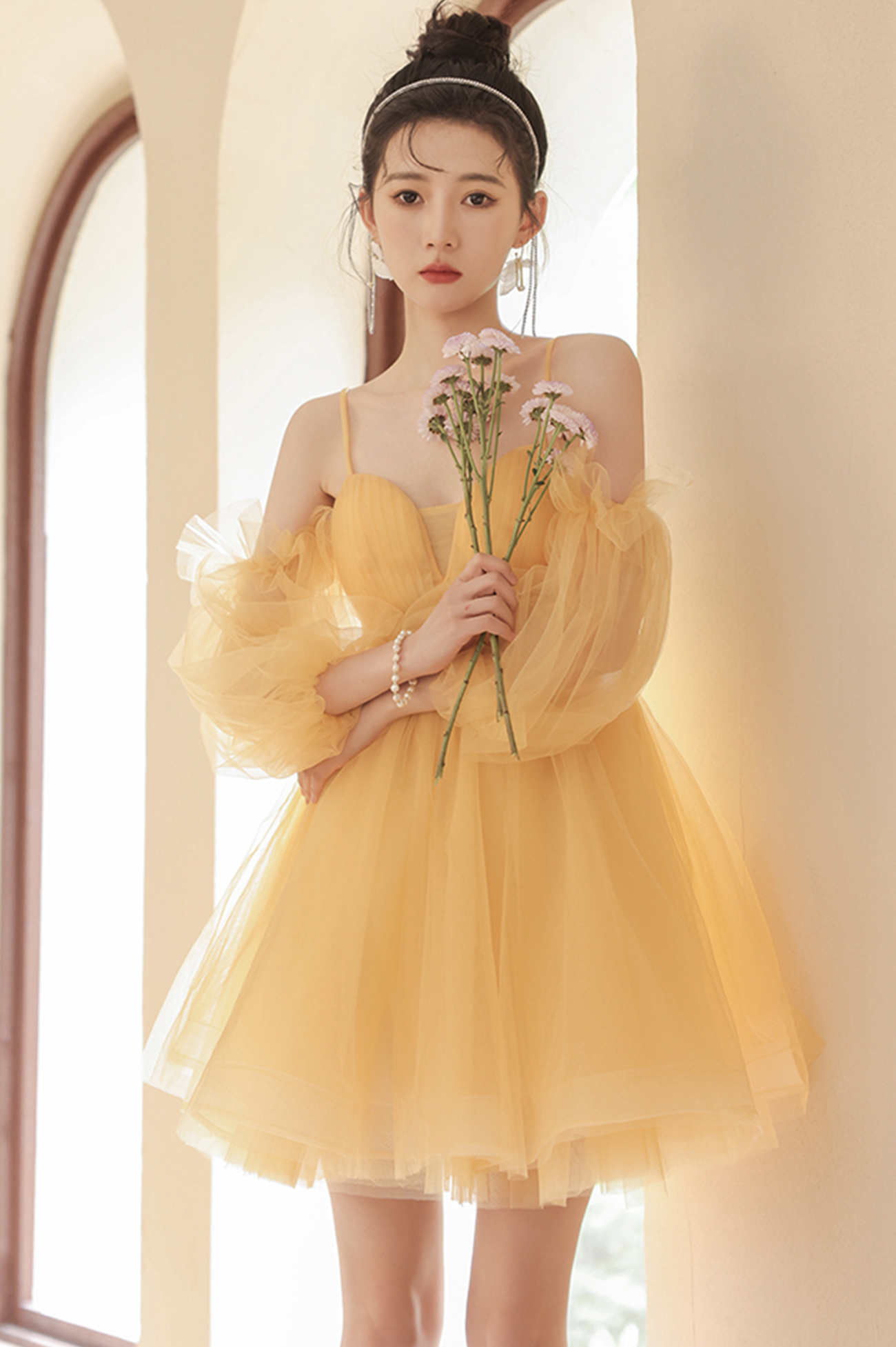 Yellow tulle short prom dress A line homecoming dress