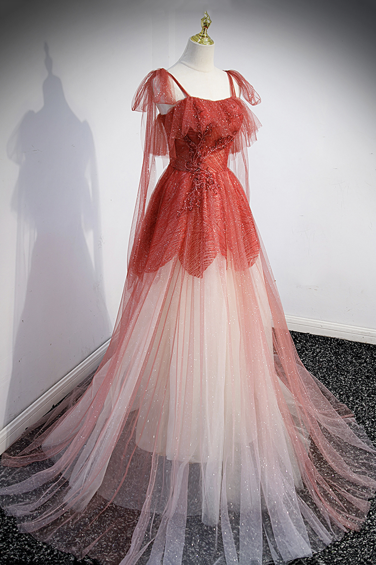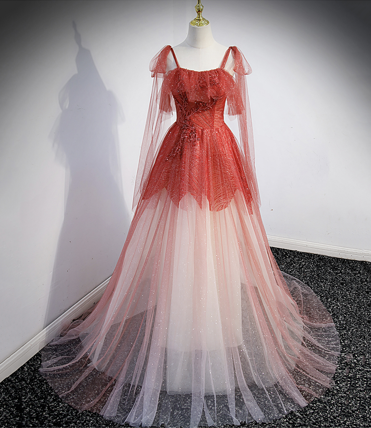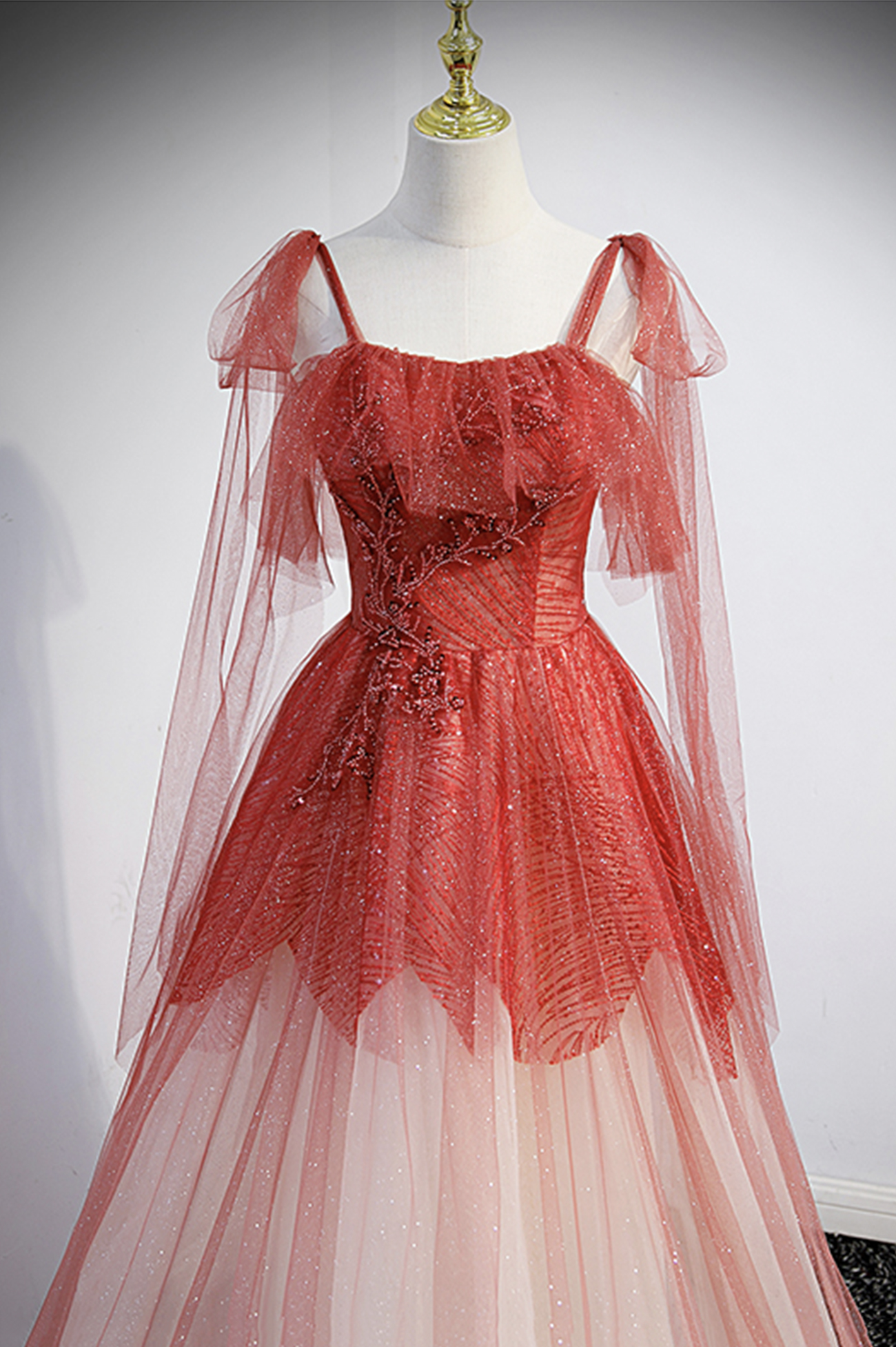 - Burgundy tulle sequins long prom dress A line evening dress -
