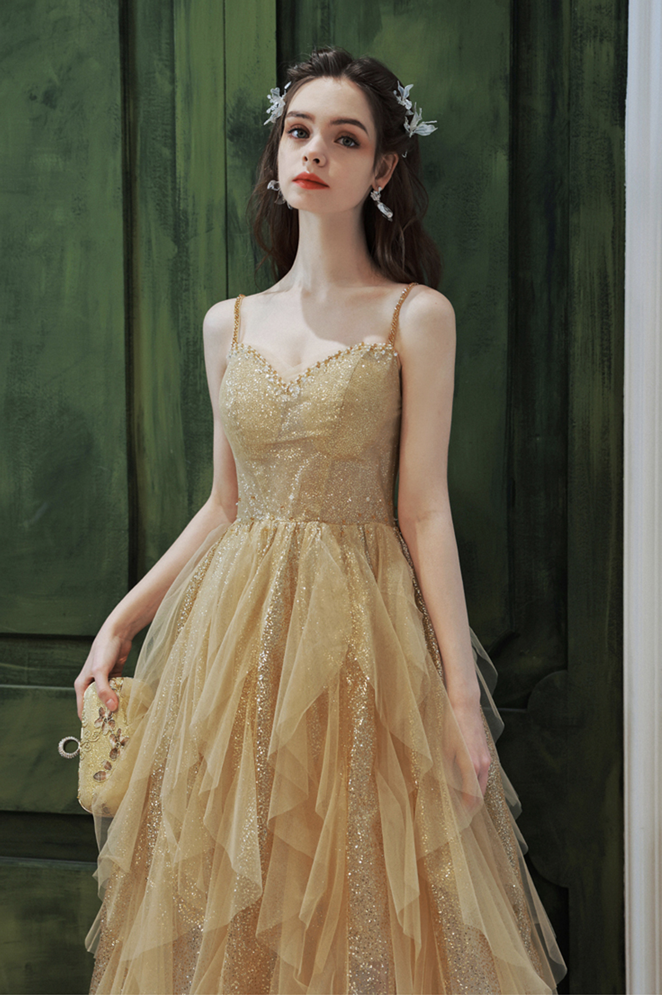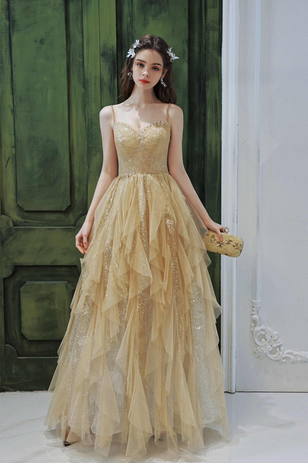 - Gold tulle sequins long prom dress A line evening dress -