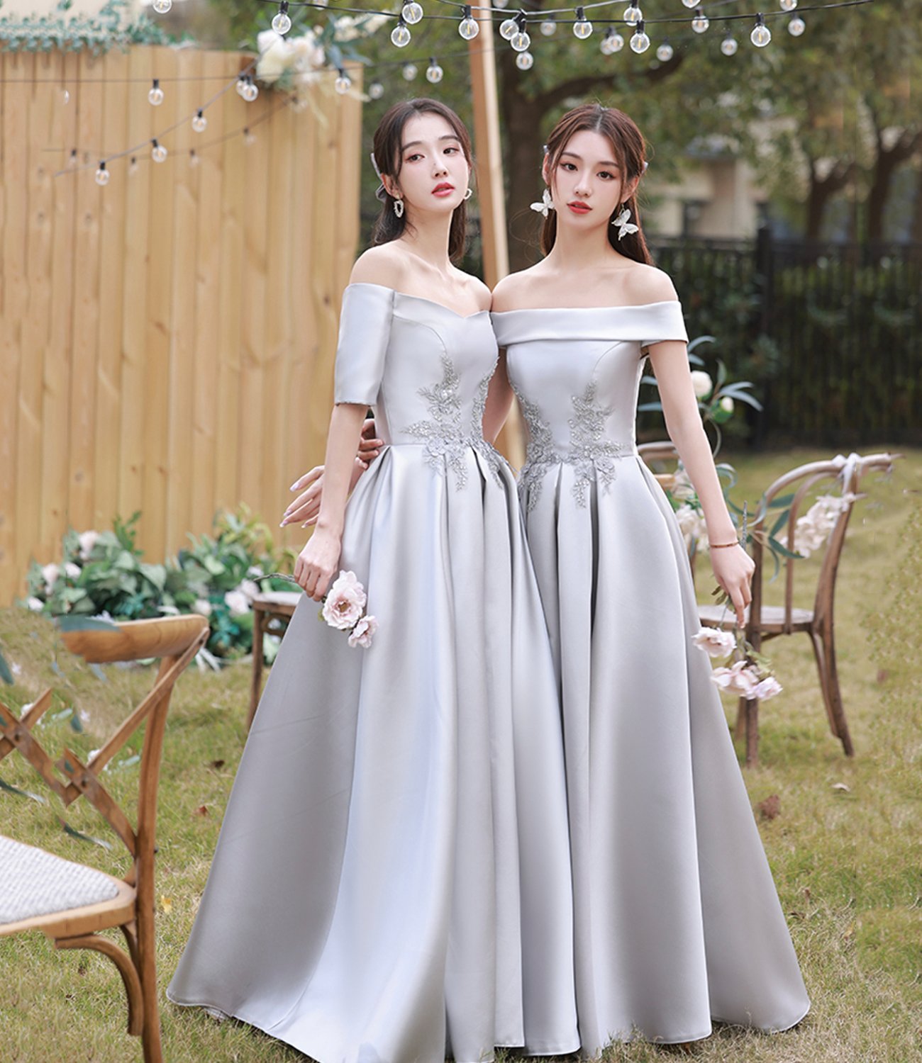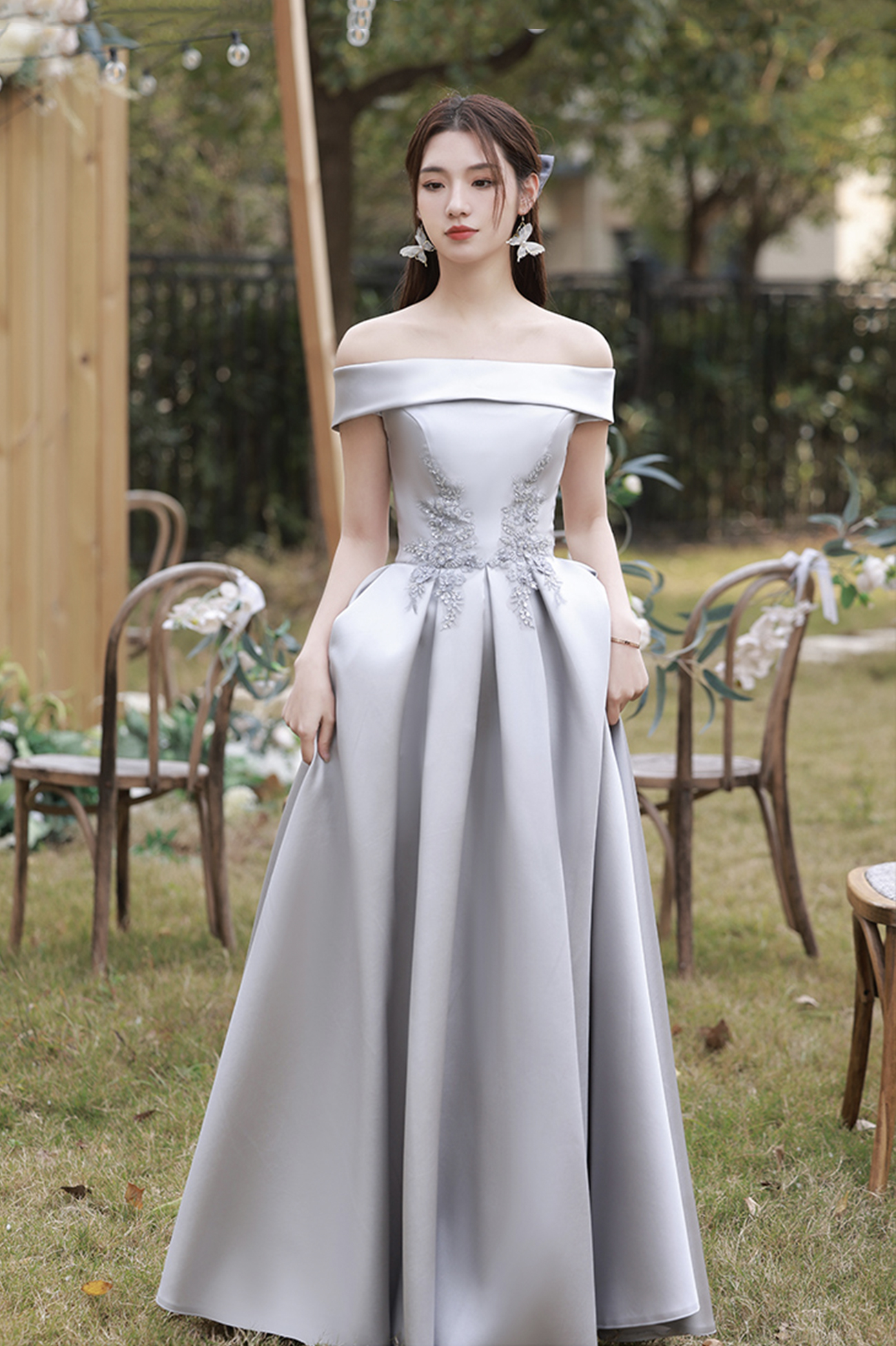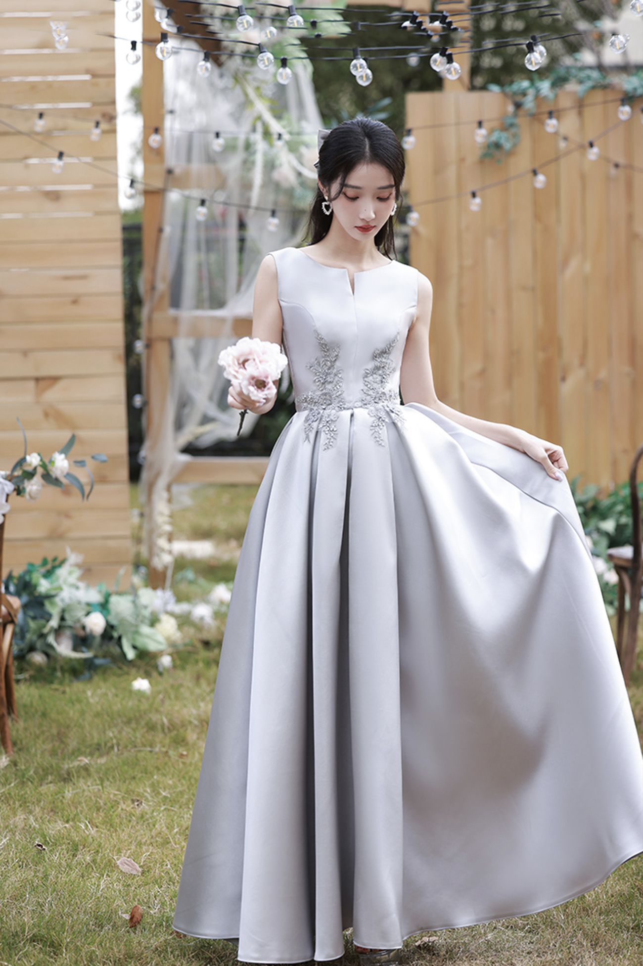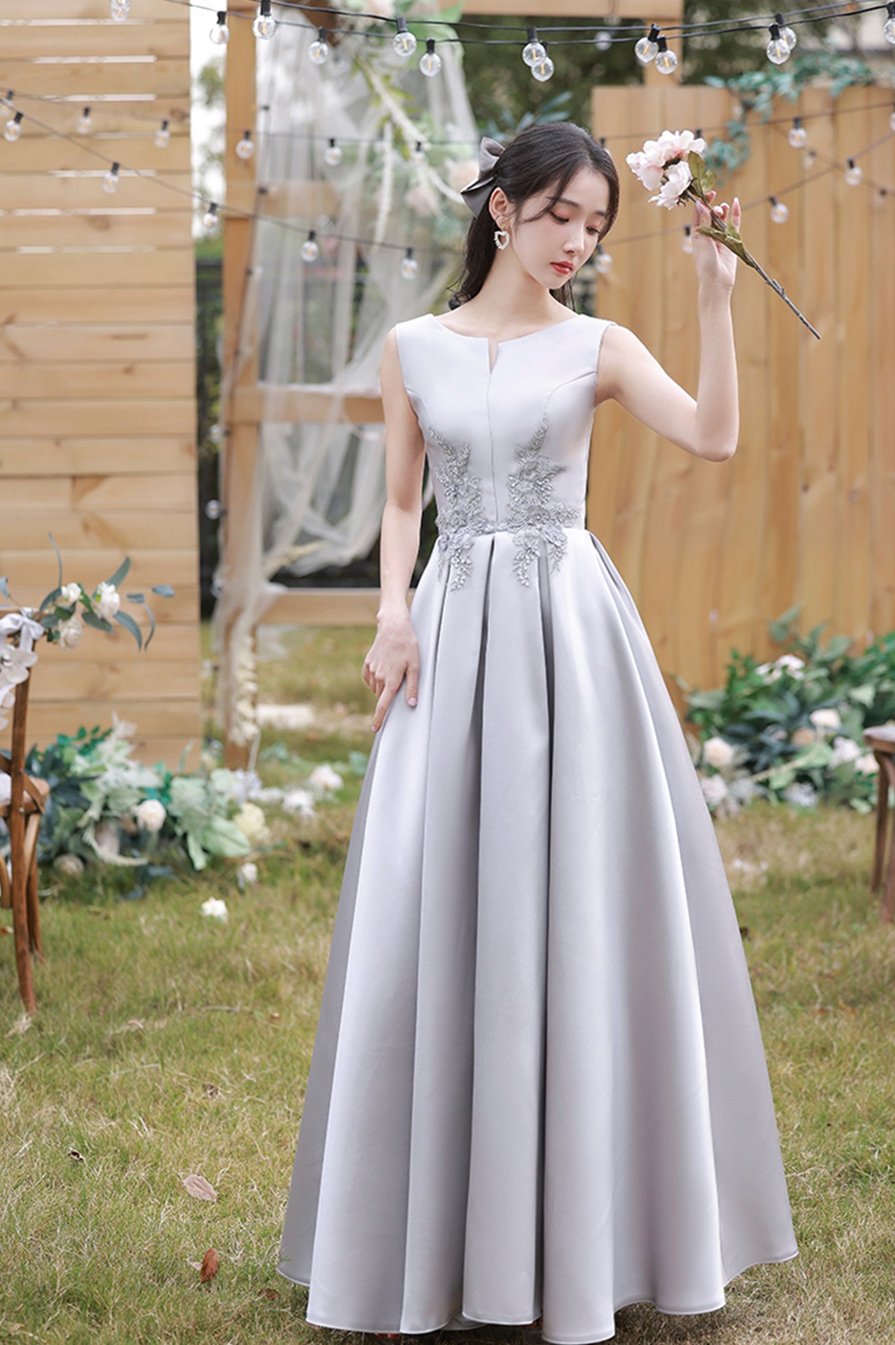 - Gray satin lace long prom dress A line evening dress -