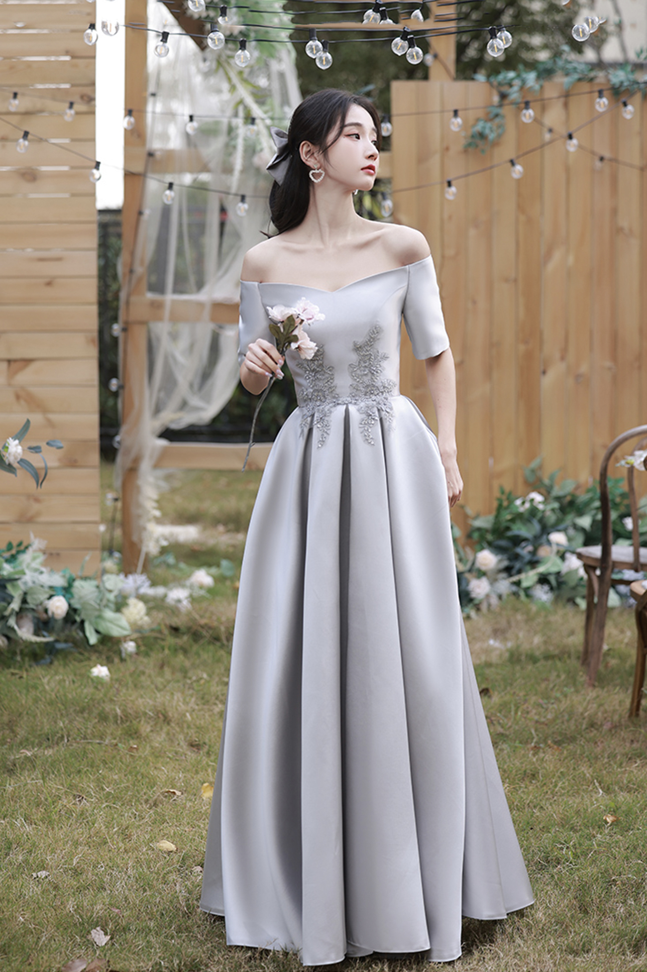 Gray satin lace long prom dress A line evening dress