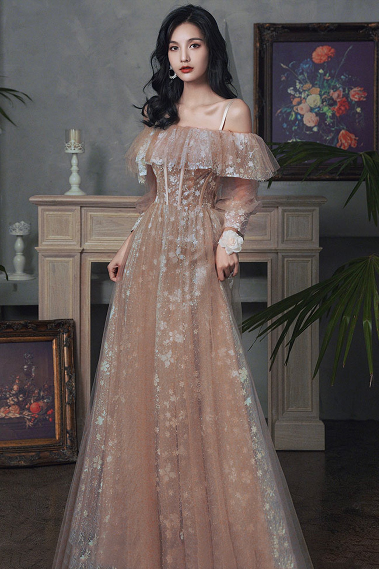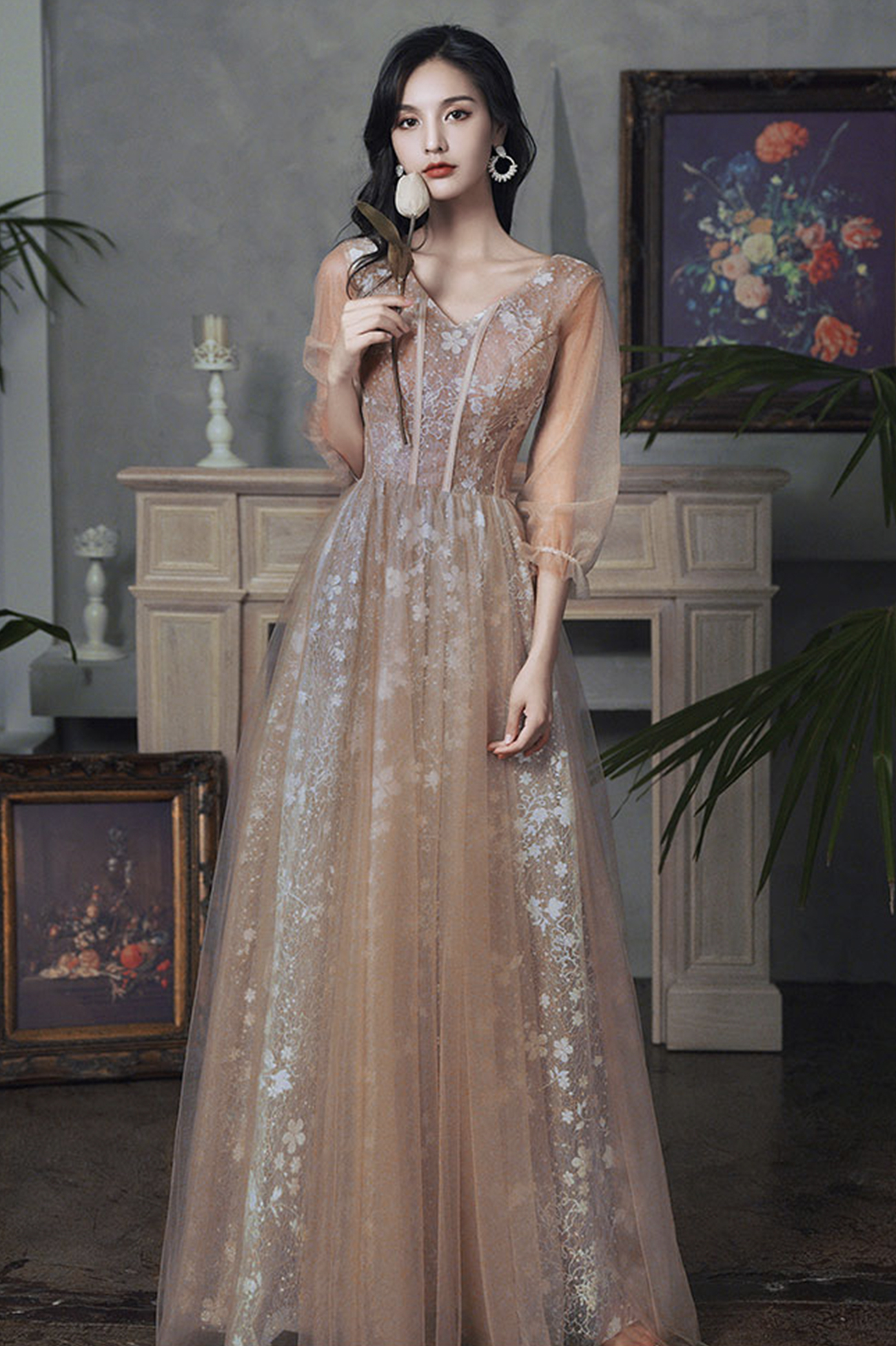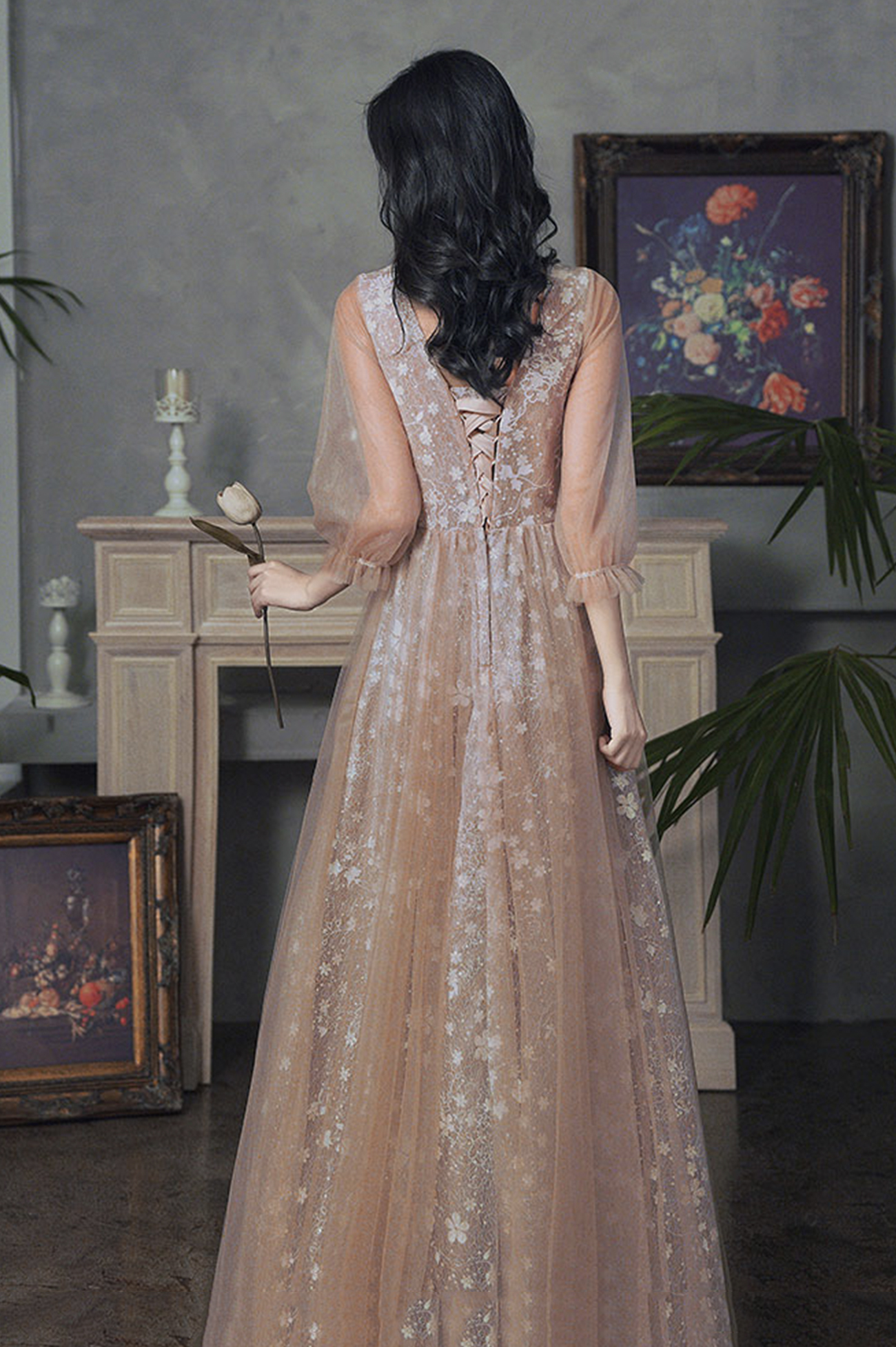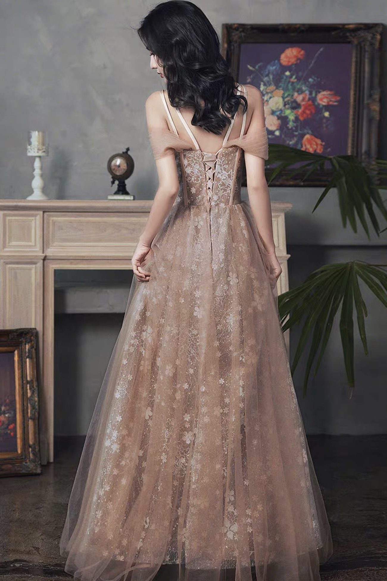 - Cute tulle lace long prom dress A line evening dress -