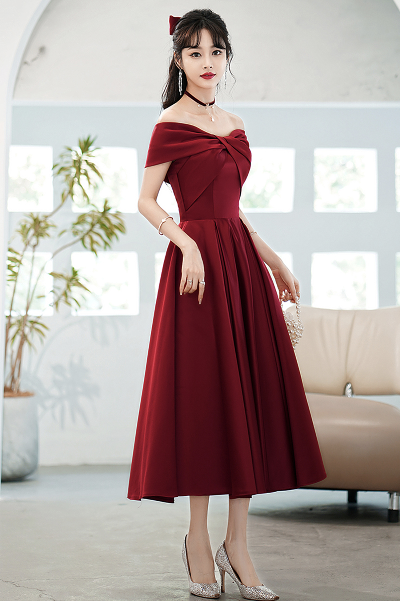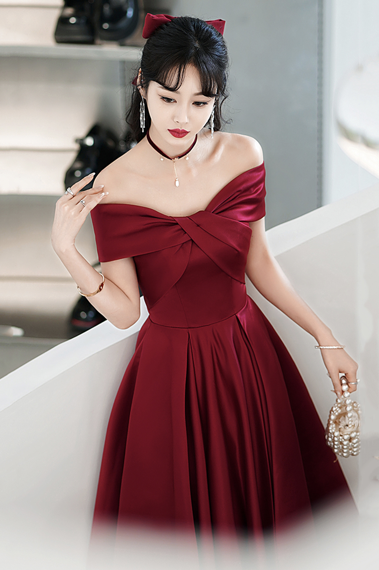 - Cute satin short prom dress burgundy evening dress -