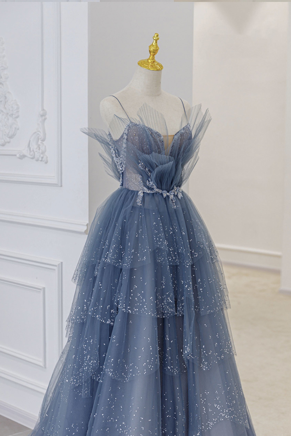 - Blue Tulle Beads Long Ball Gown Dress Blue Formal Dress -