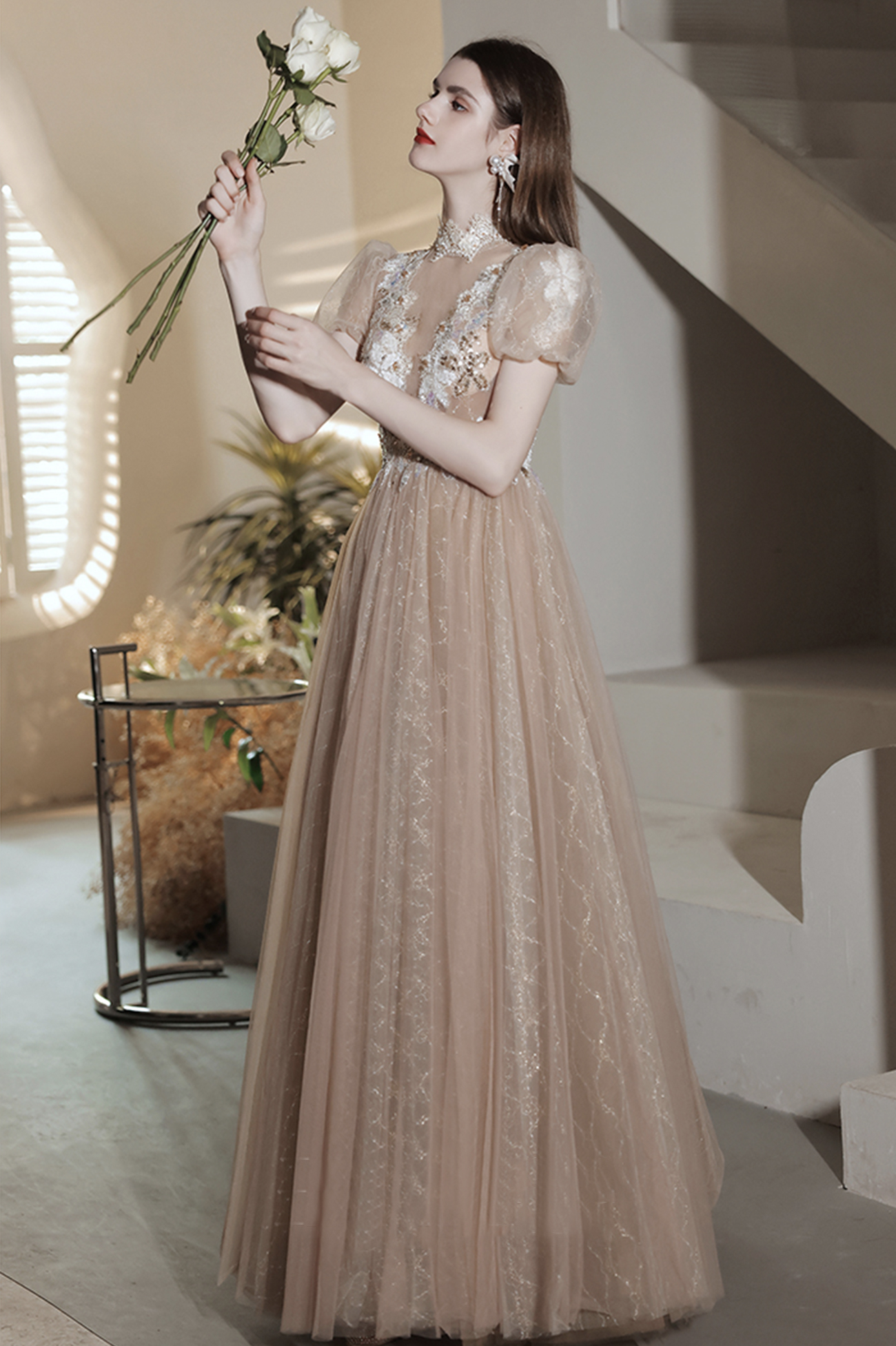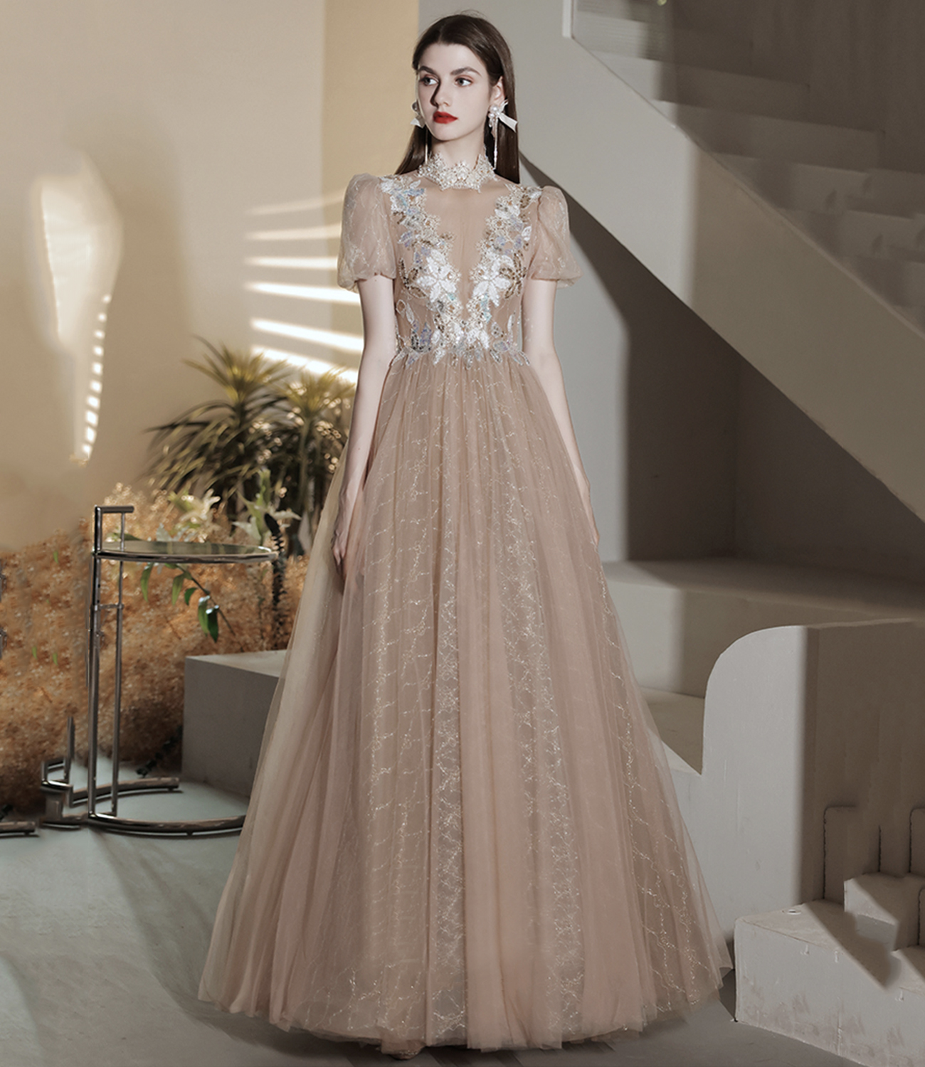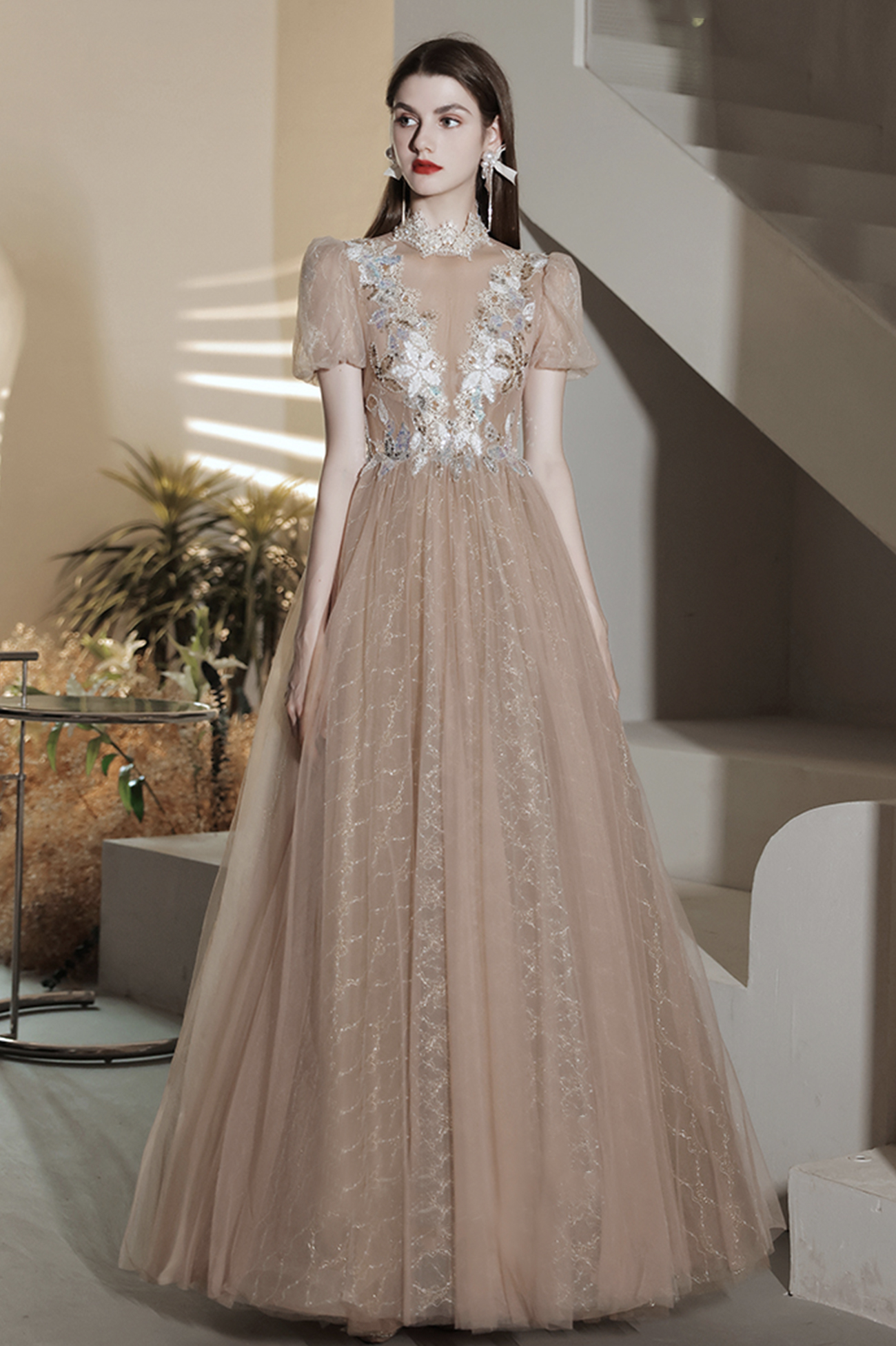 - Elegant tulle lace long prom dress A line evening gown -
