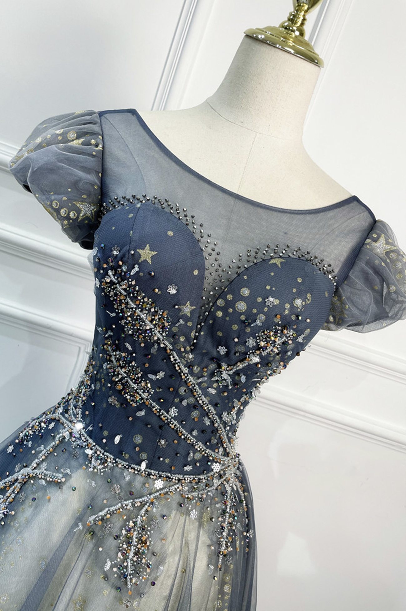 - Blue tulle sequins long senior prom dress blue evening dress -
