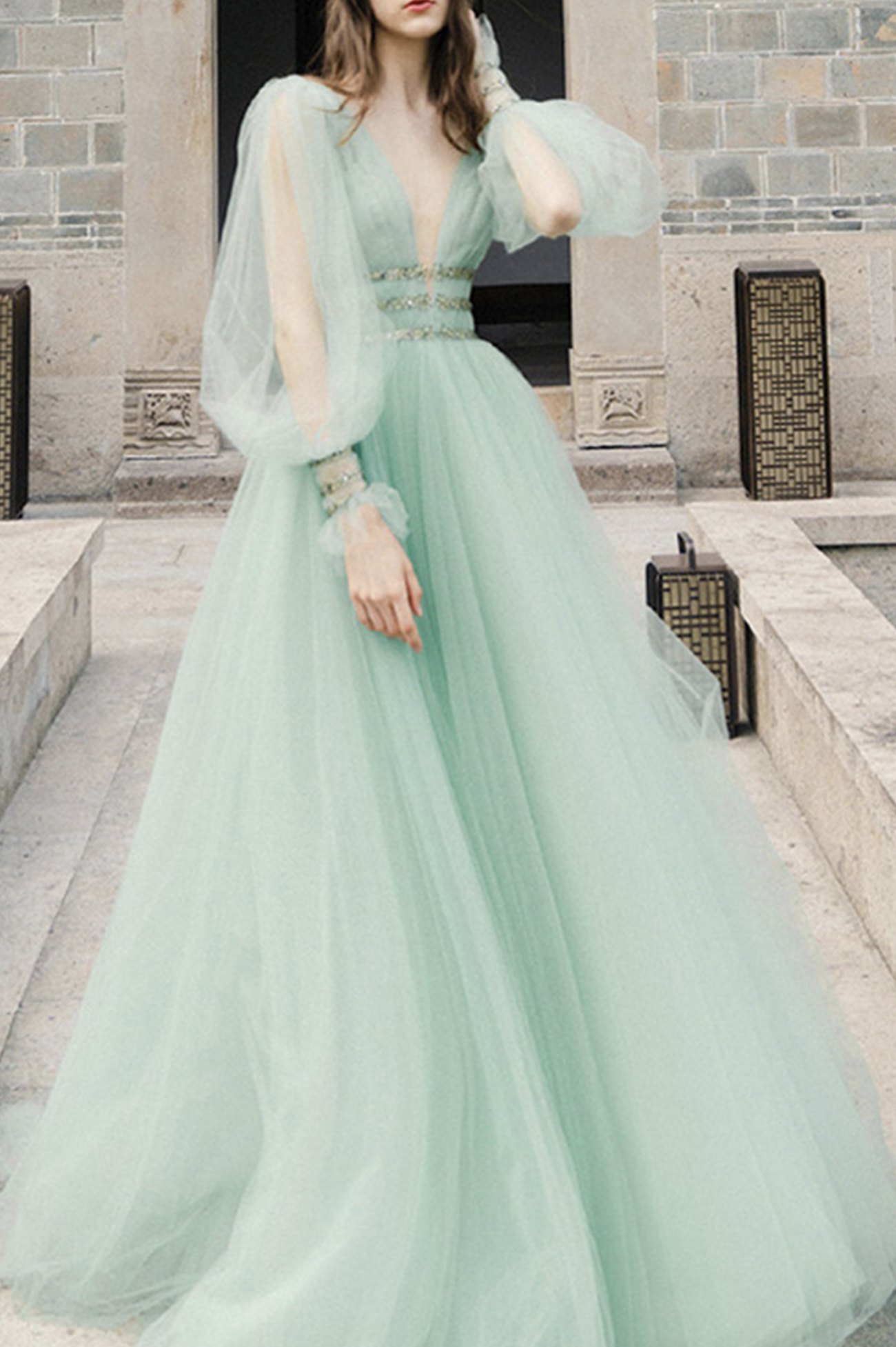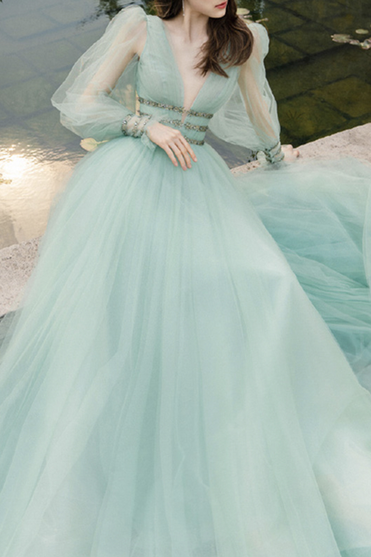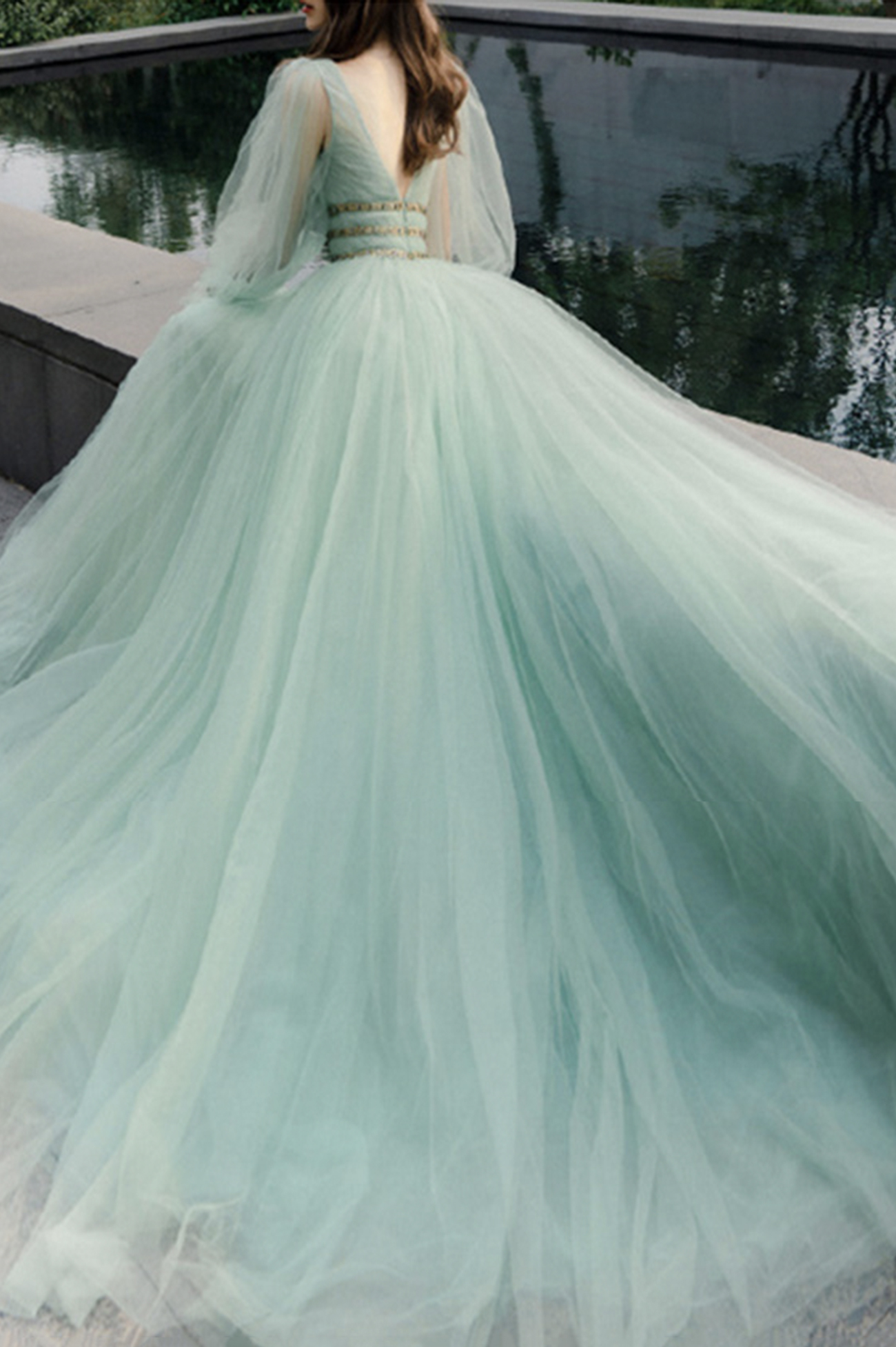 - Green tulle sequins long prom dress green evening dress -