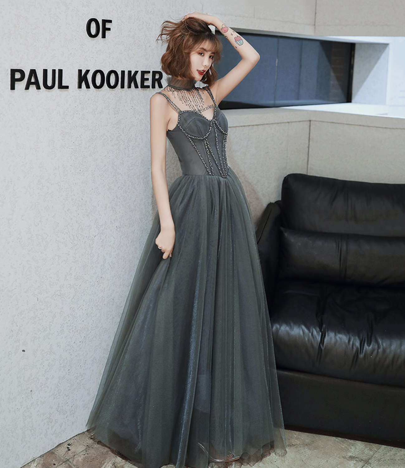 - Gray tulle beads long prom dress A line evening dress -