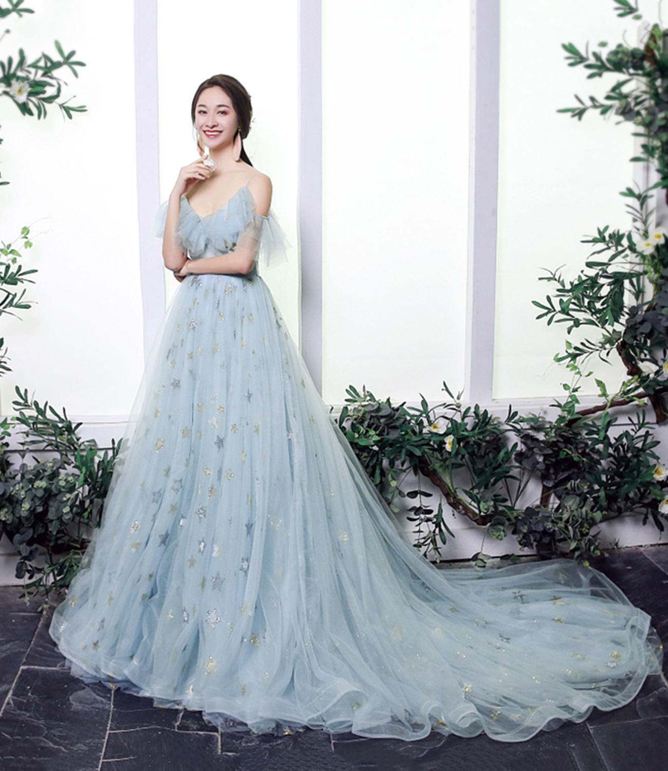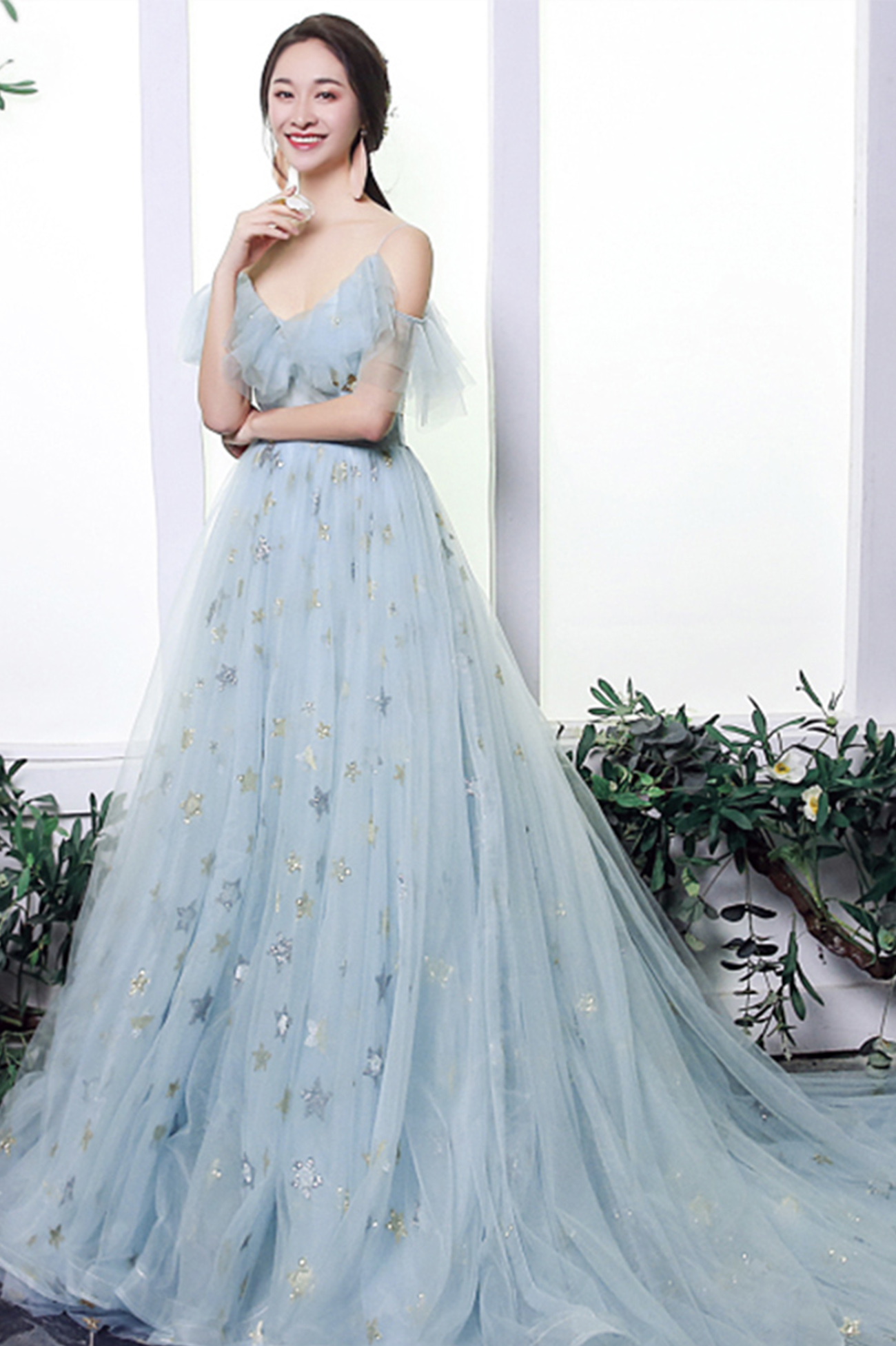 - Blue tulle sequins long prom dress blue evening dress -