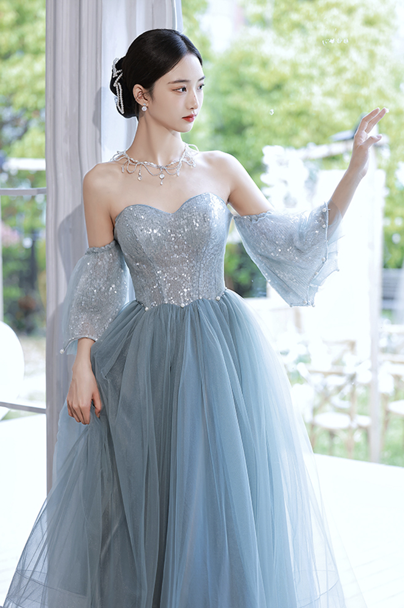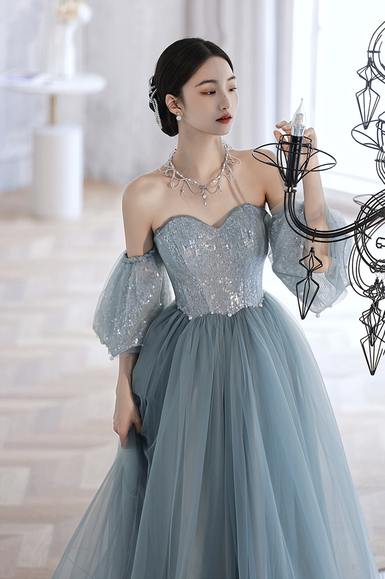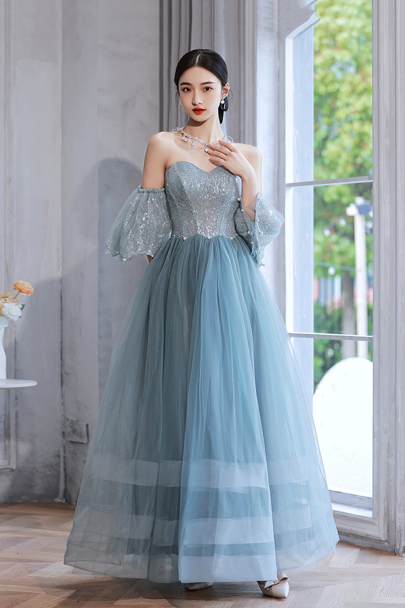 - Blue tulle sequins long prom dress blue evening dress -