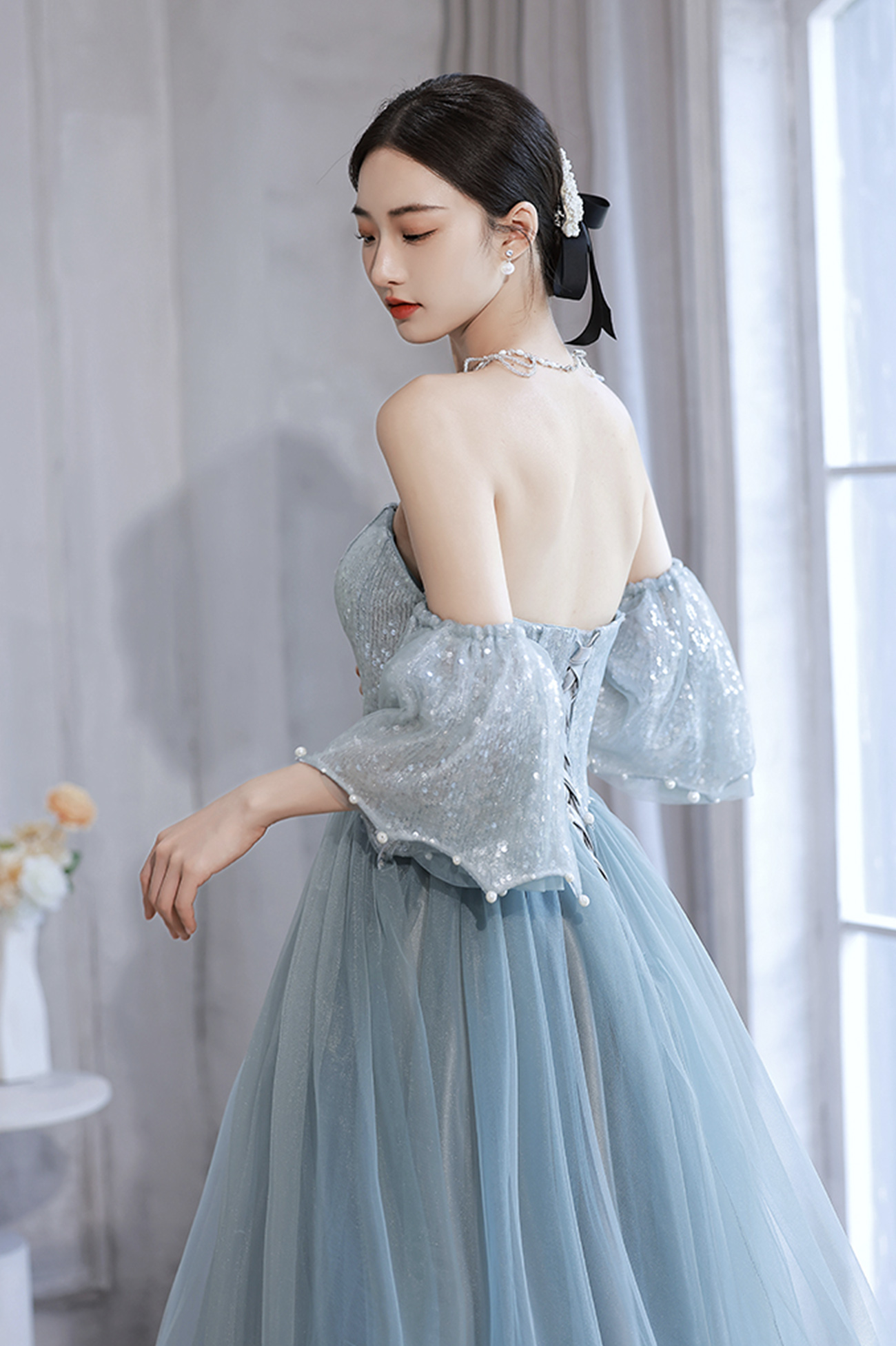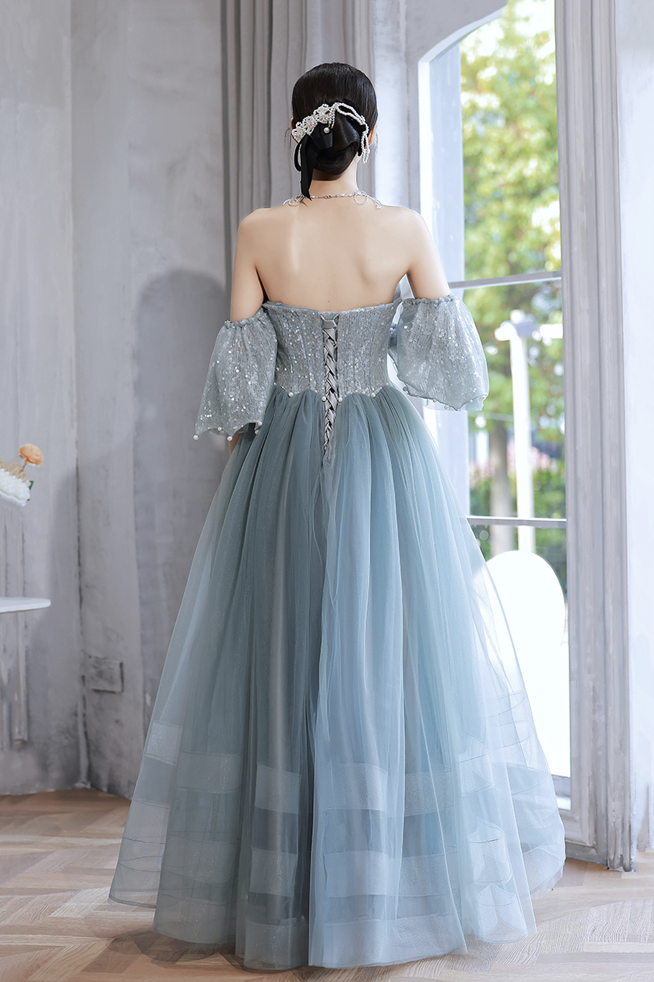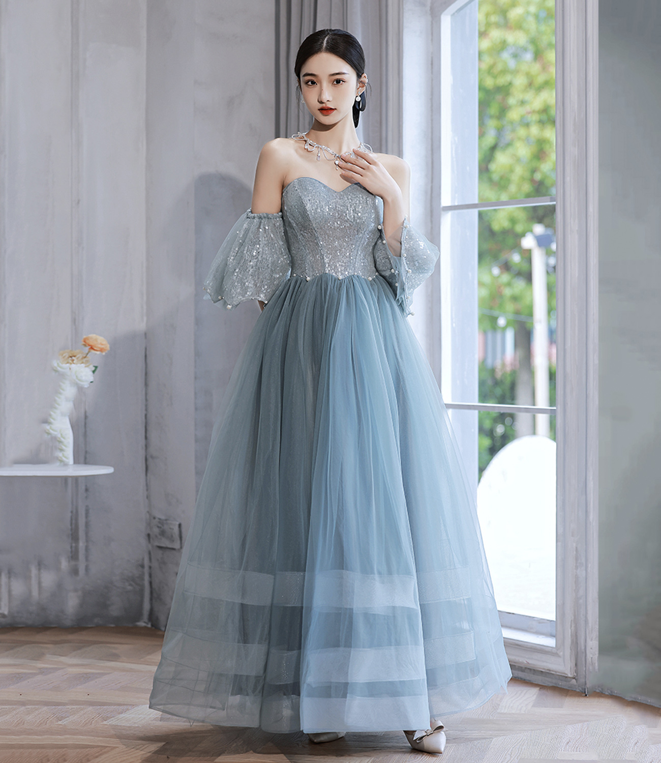 - Blue tulle sequins long prom dress blue evening dress -