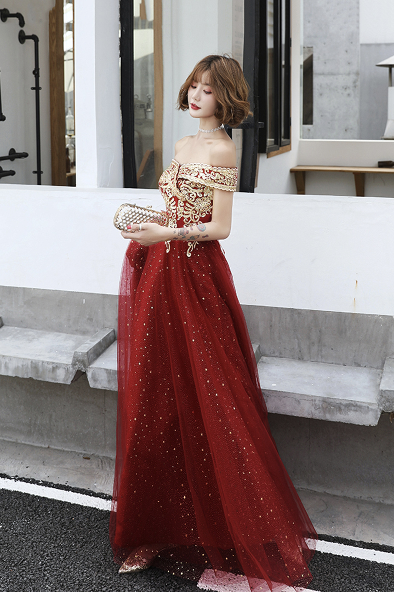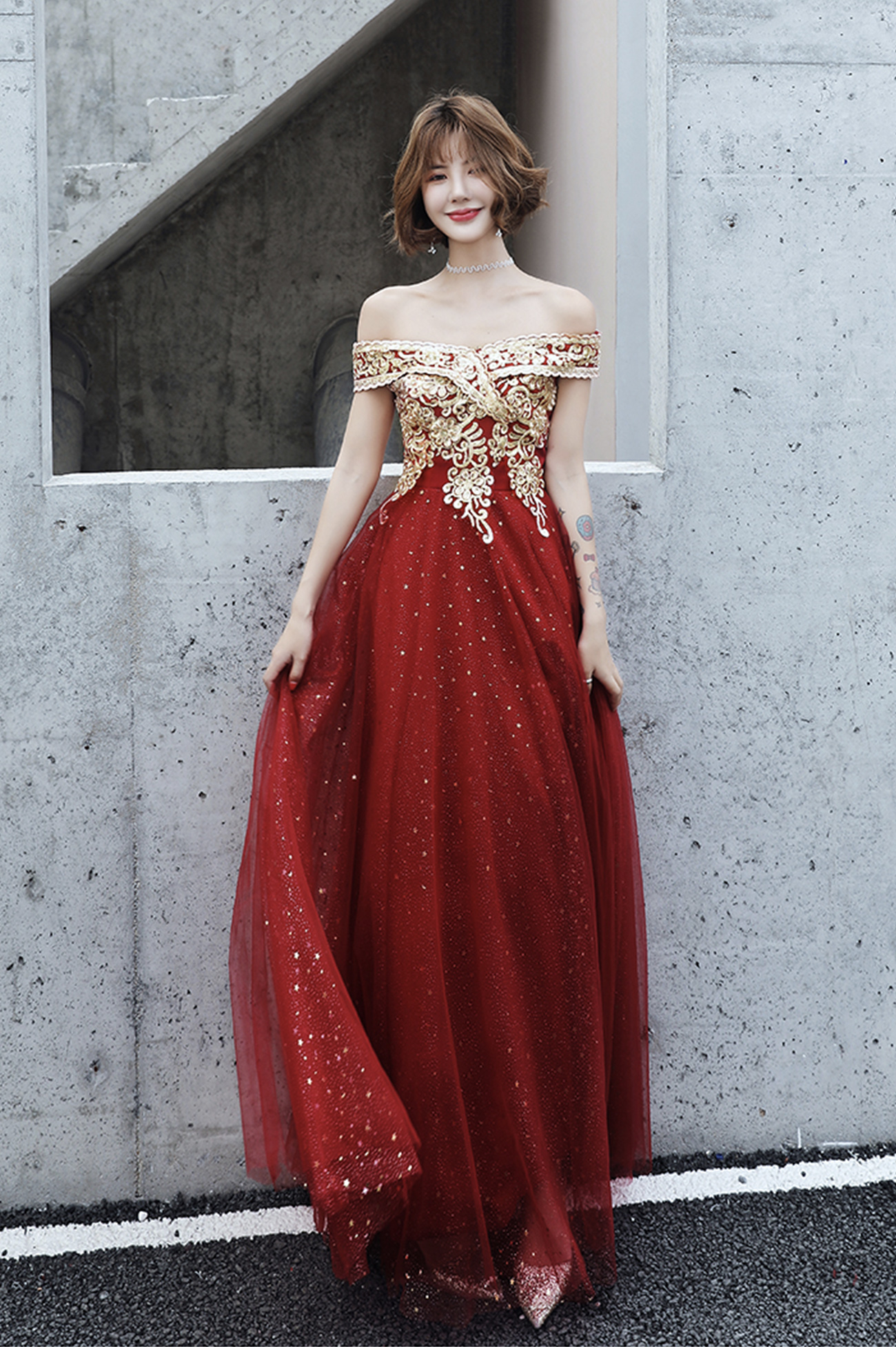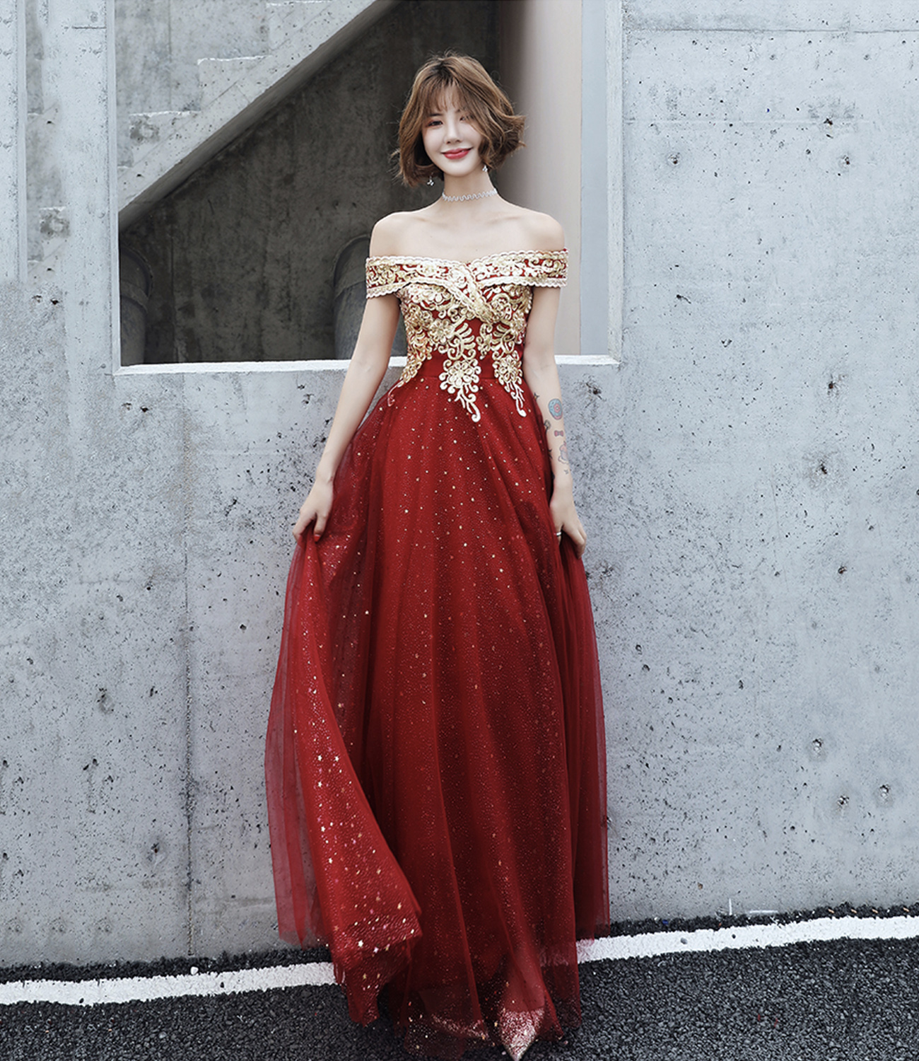 - Burgundy tulle lace long prom dress A line evening dress -