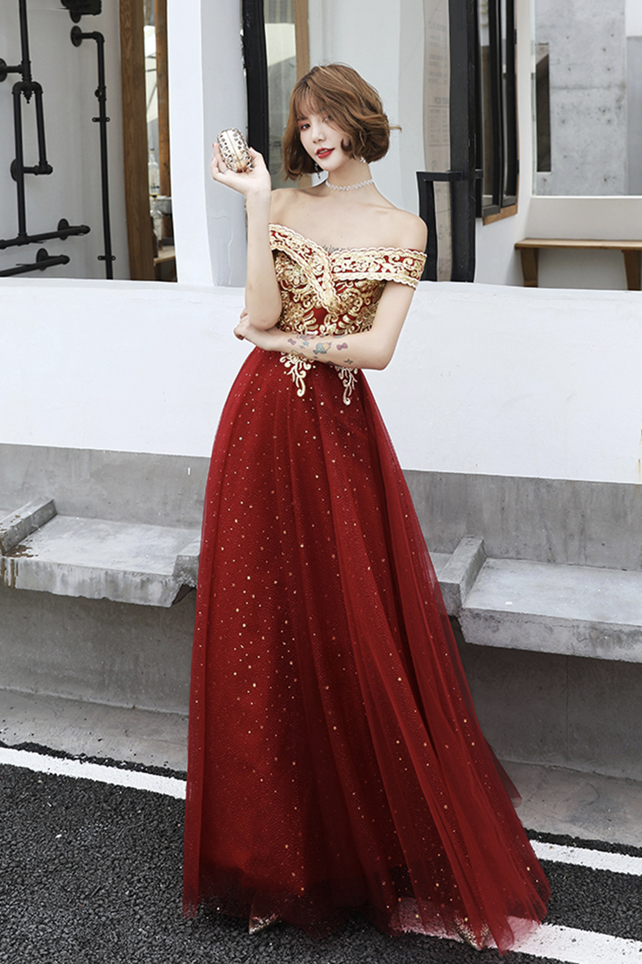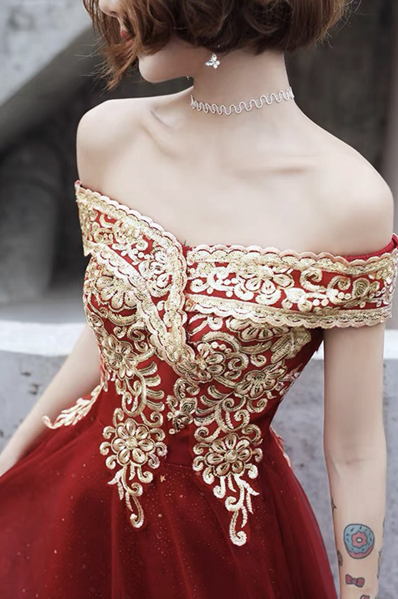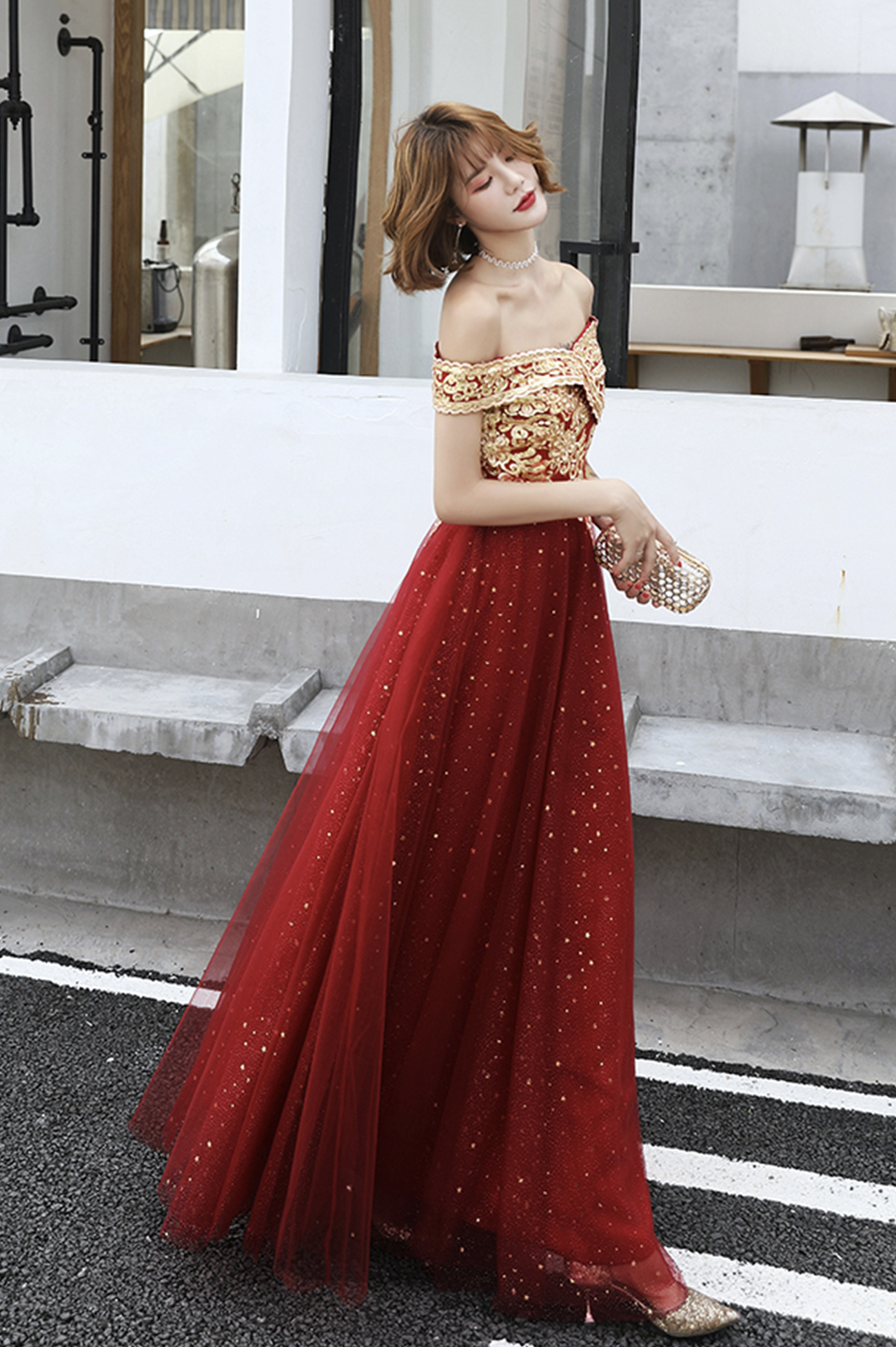 - Burgundy tulle lace long prom dress A line evening dress -