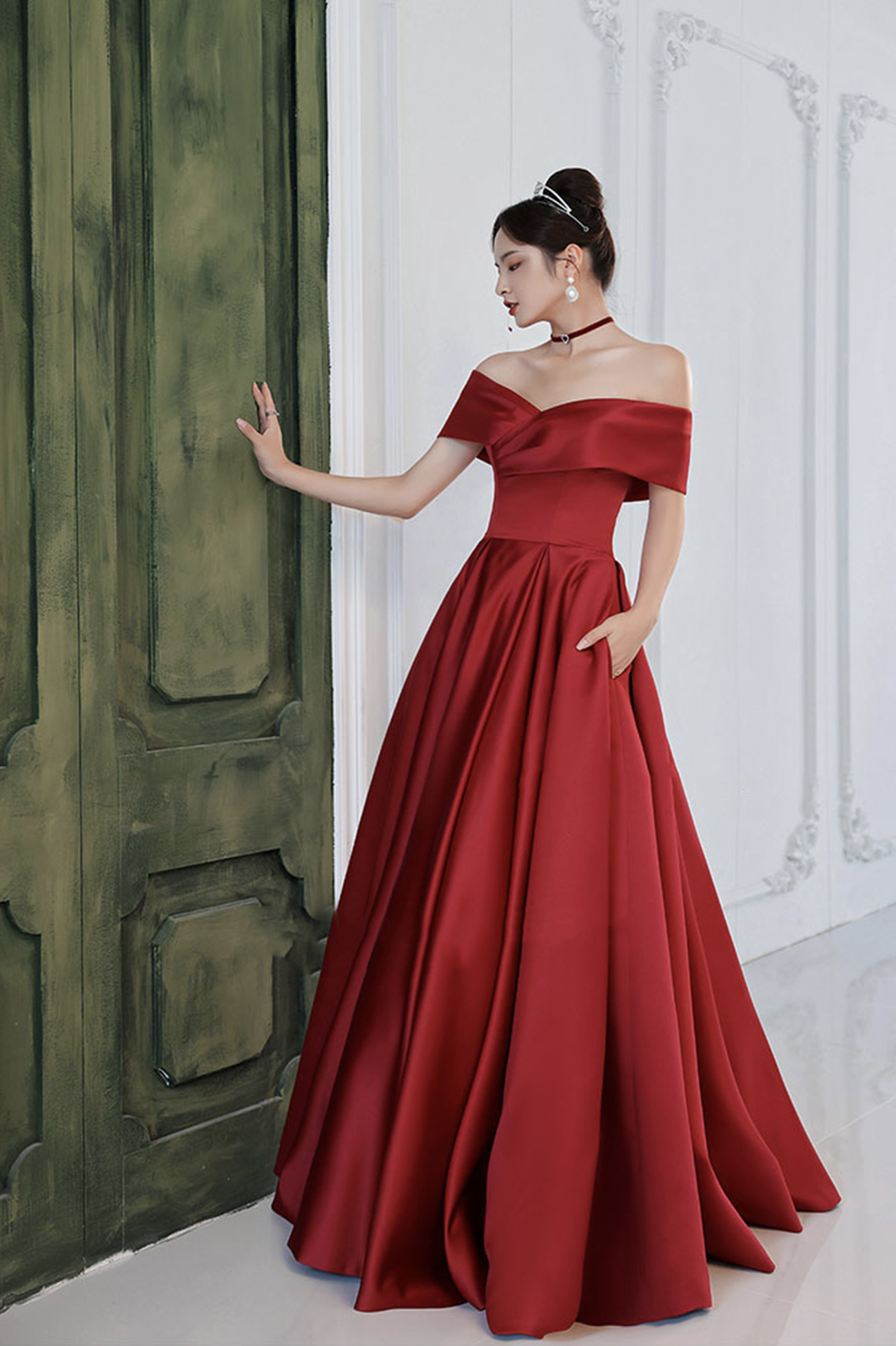 - Burgundy satin long prom dress A line evening dress -