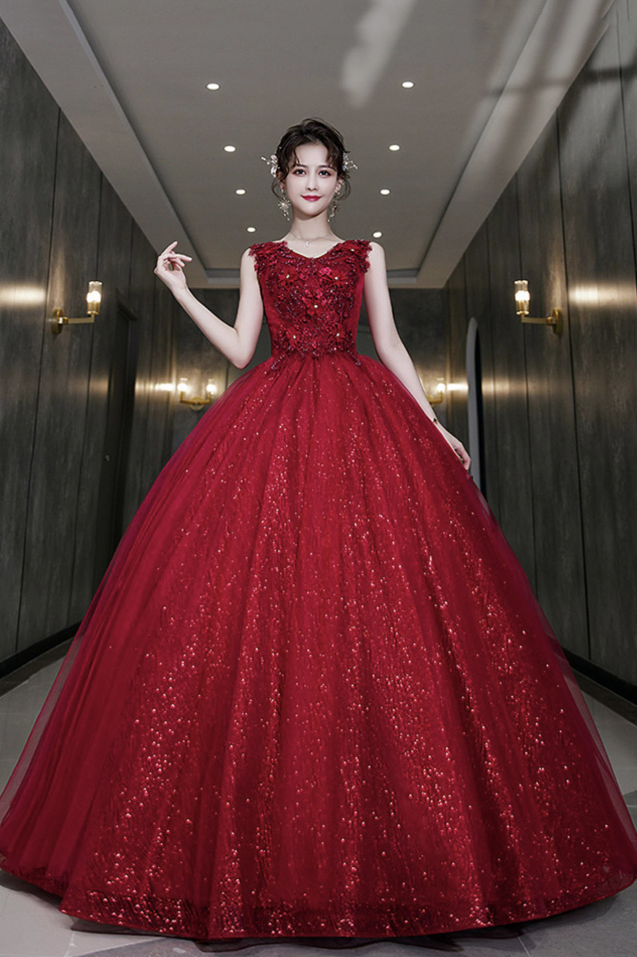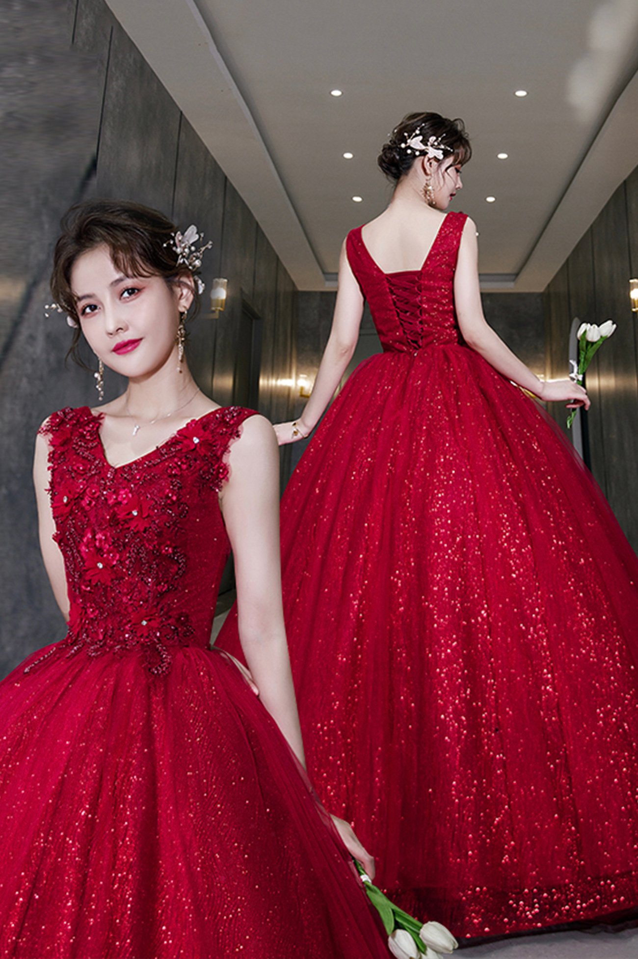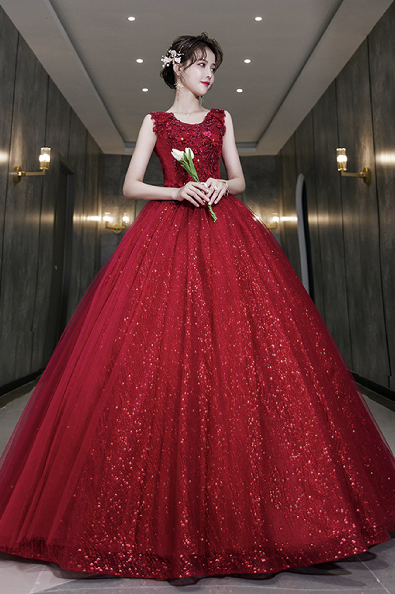 - Burgundy tulle sequins long prom dress A line evening dress -
