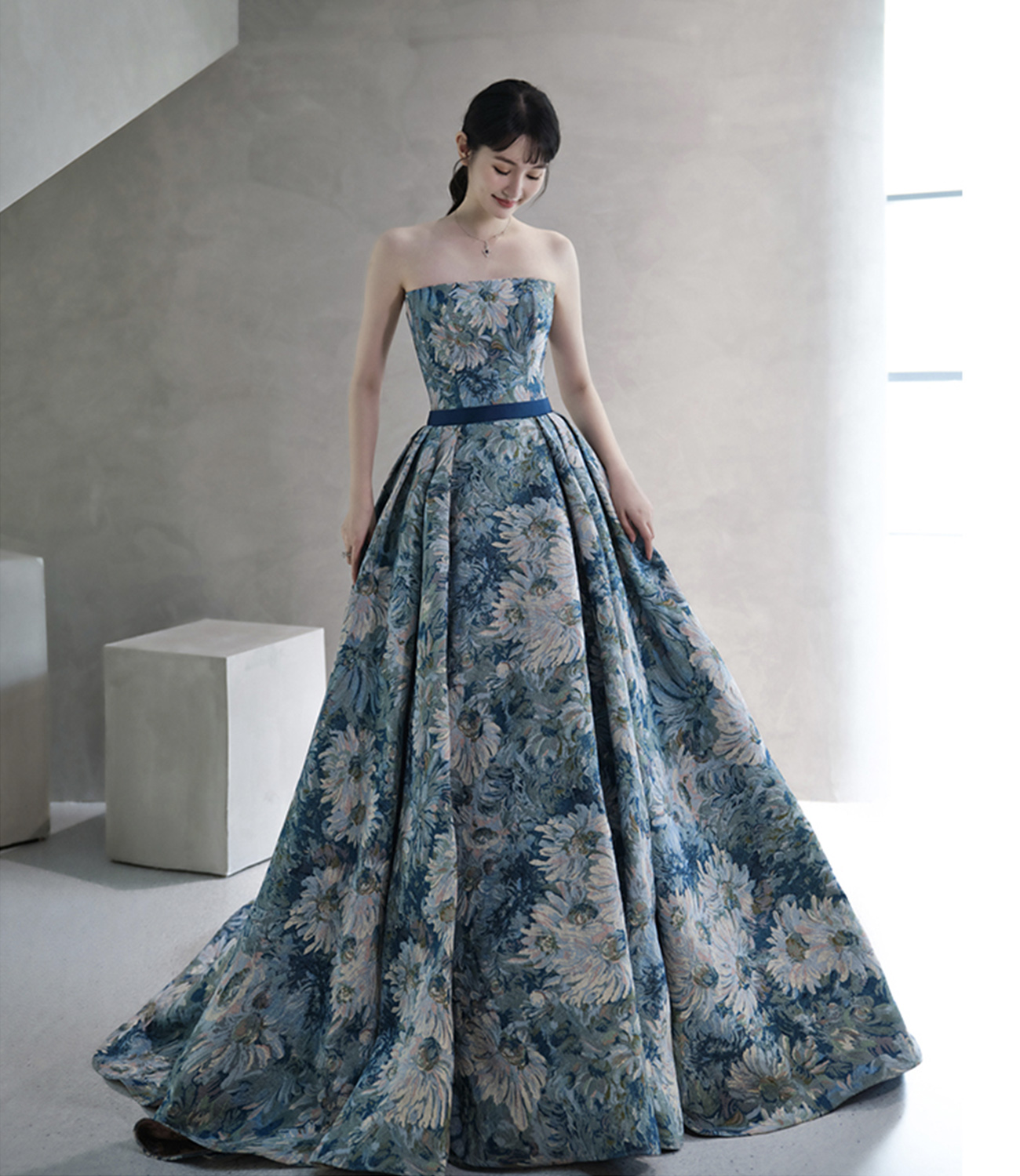 - Blue Printed Strapless Ball Gown Formal Dress -