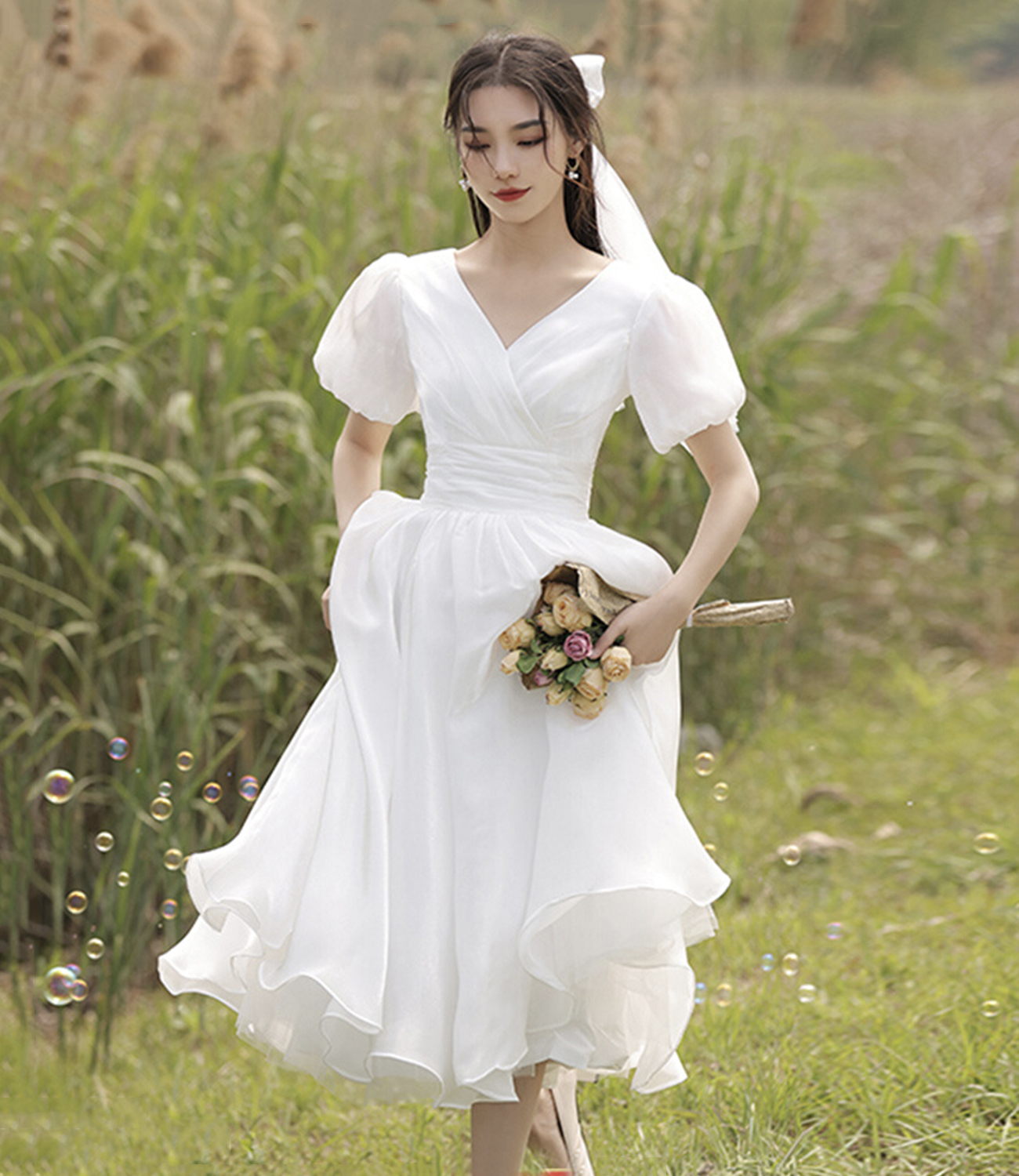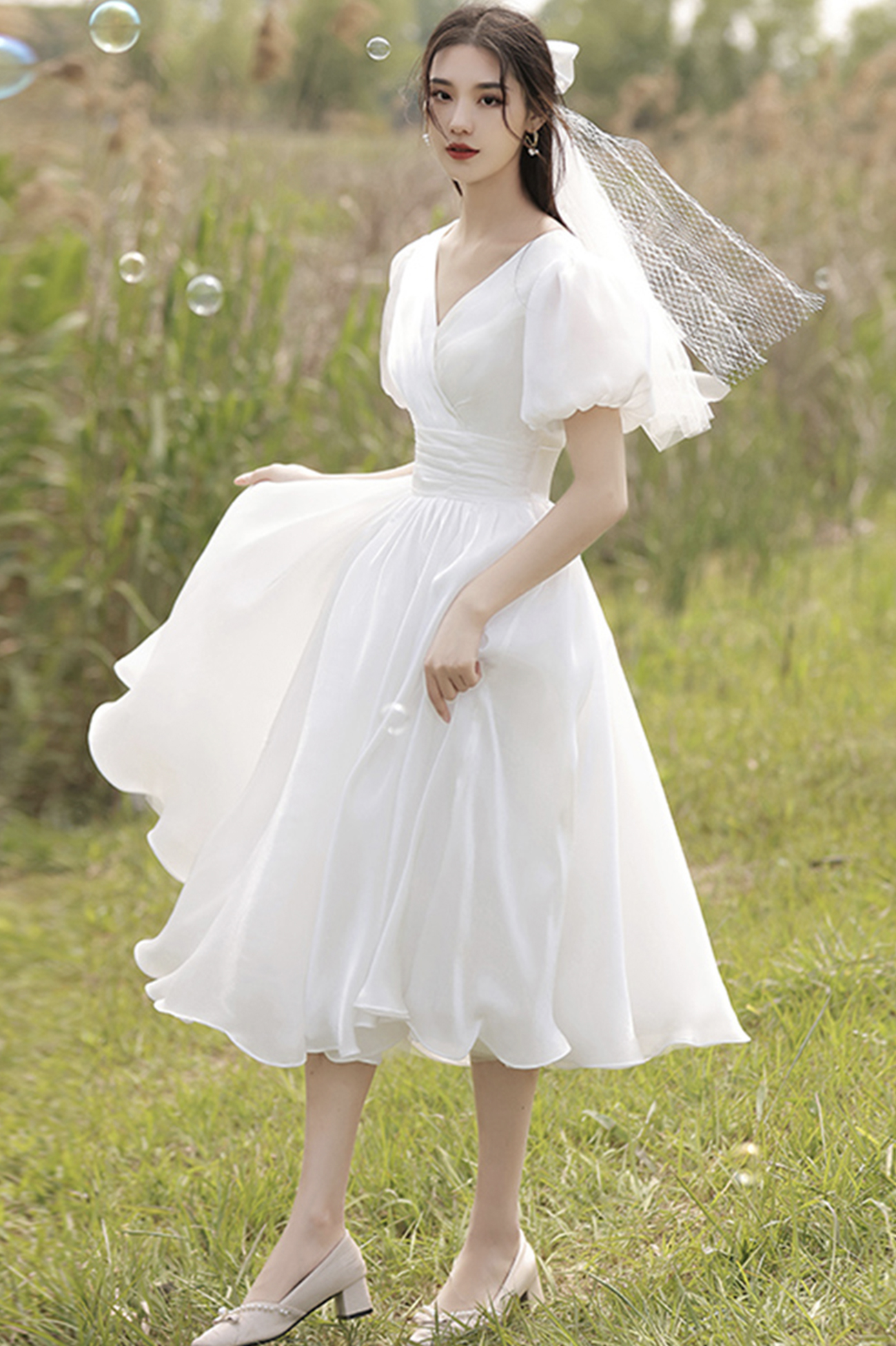 - Wihte v neck tulle short prom dress homecoming dress -