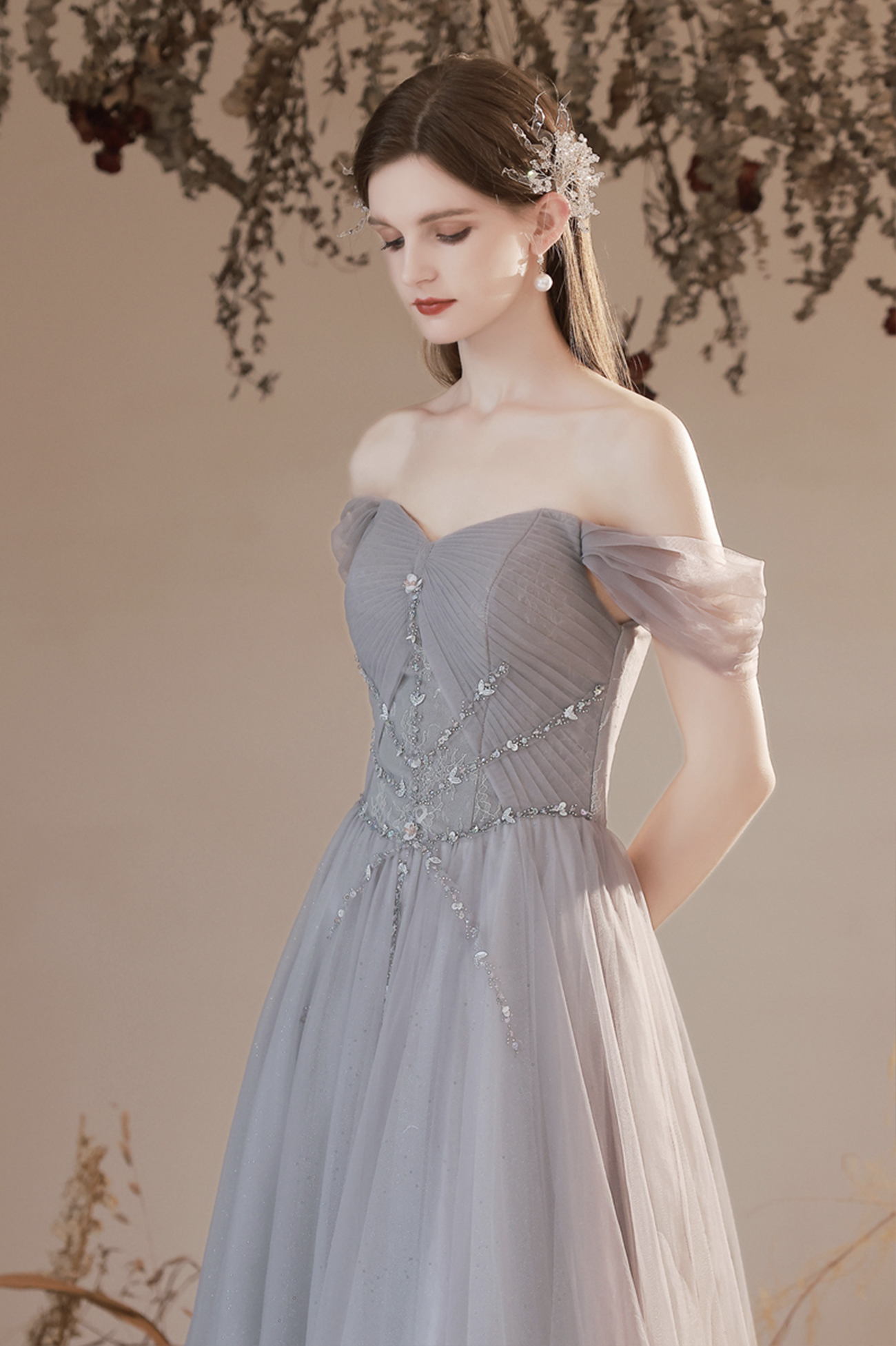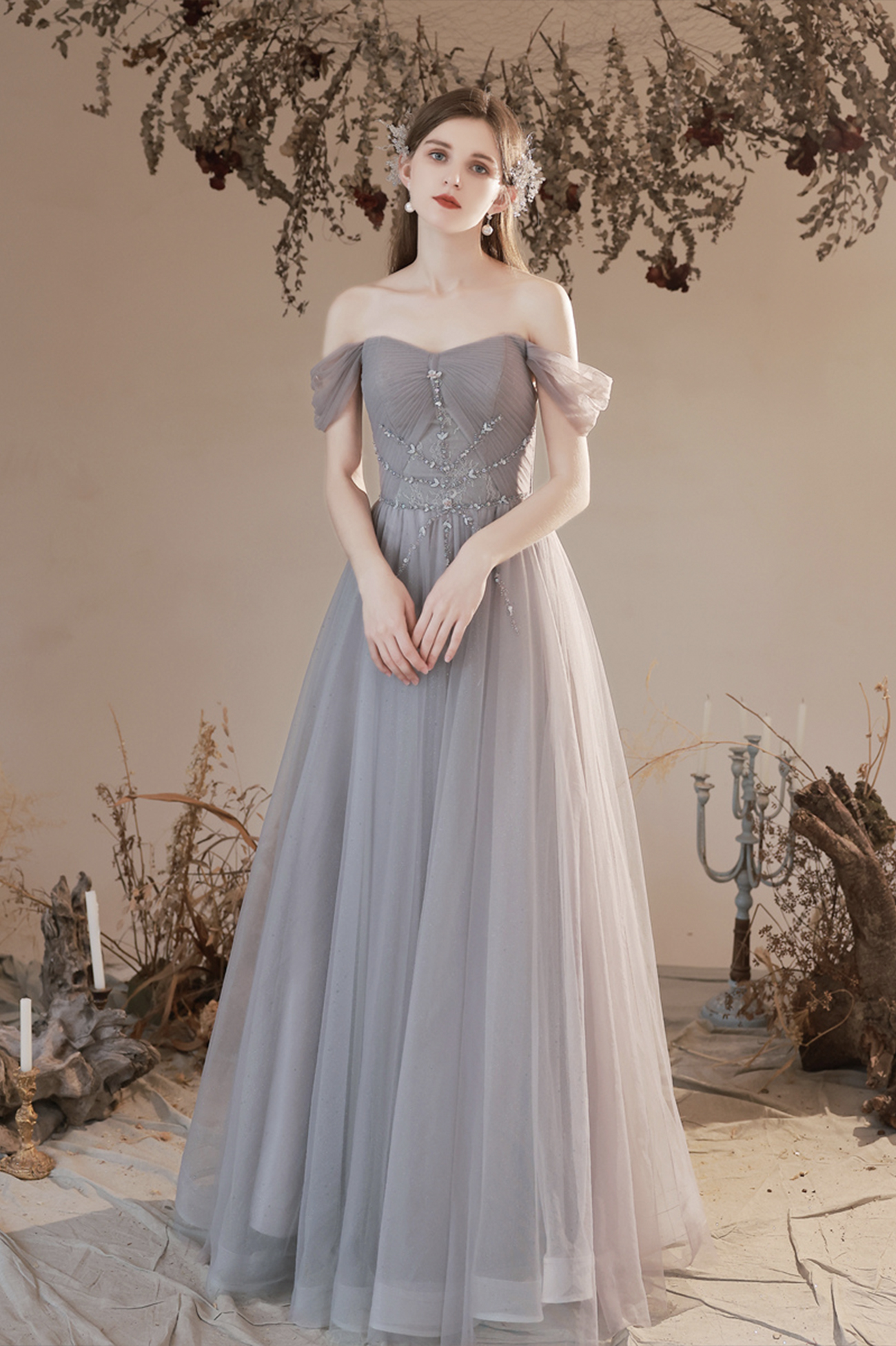 - Gray tulle beads long prom dress A line evening dress -