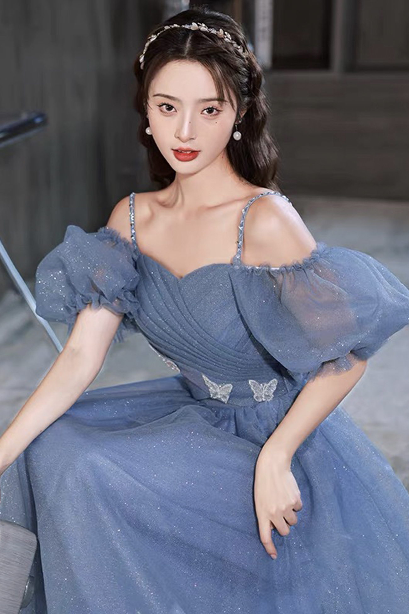 - Blue tulle long prom dress A lin evening dress -
