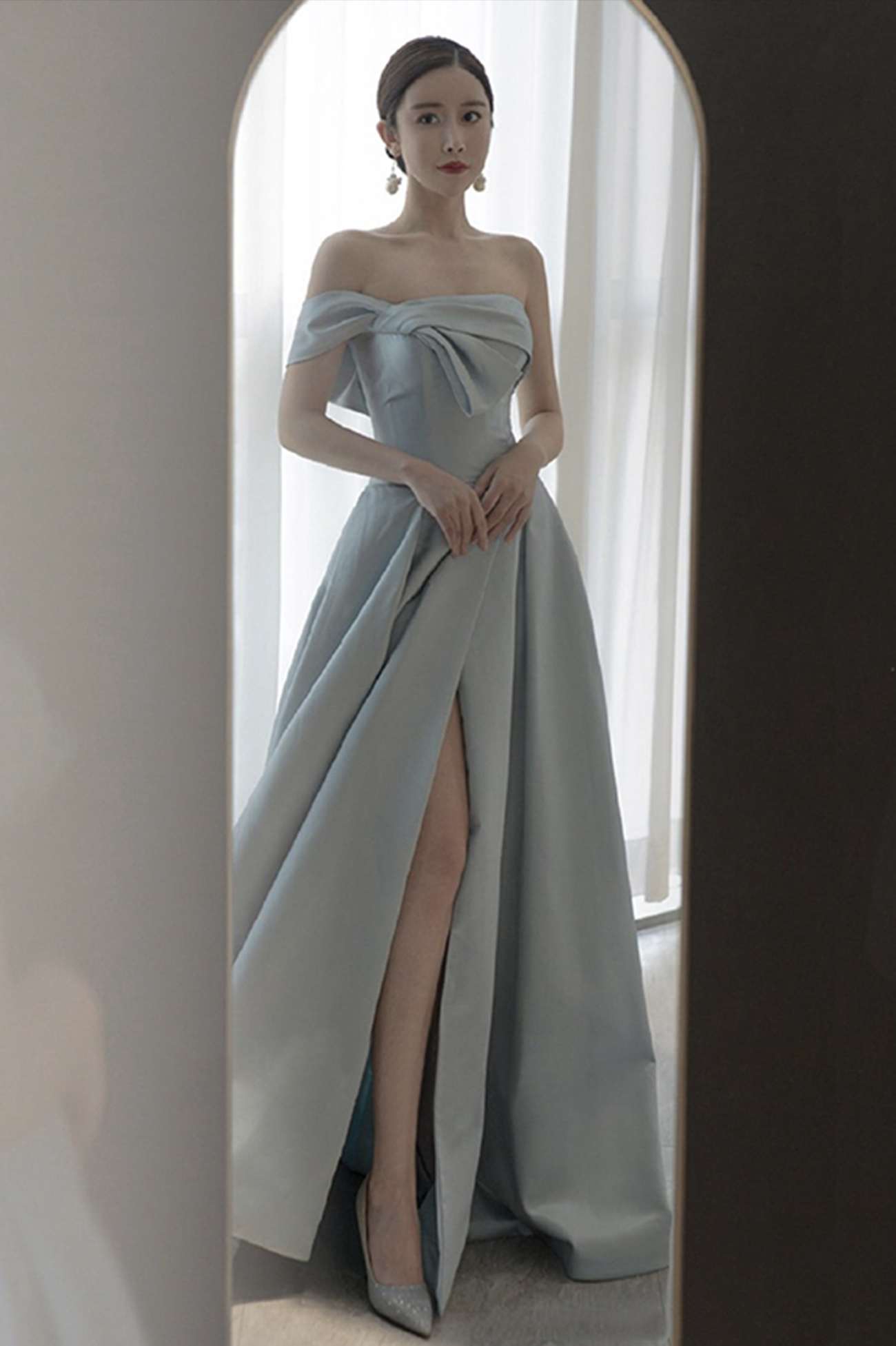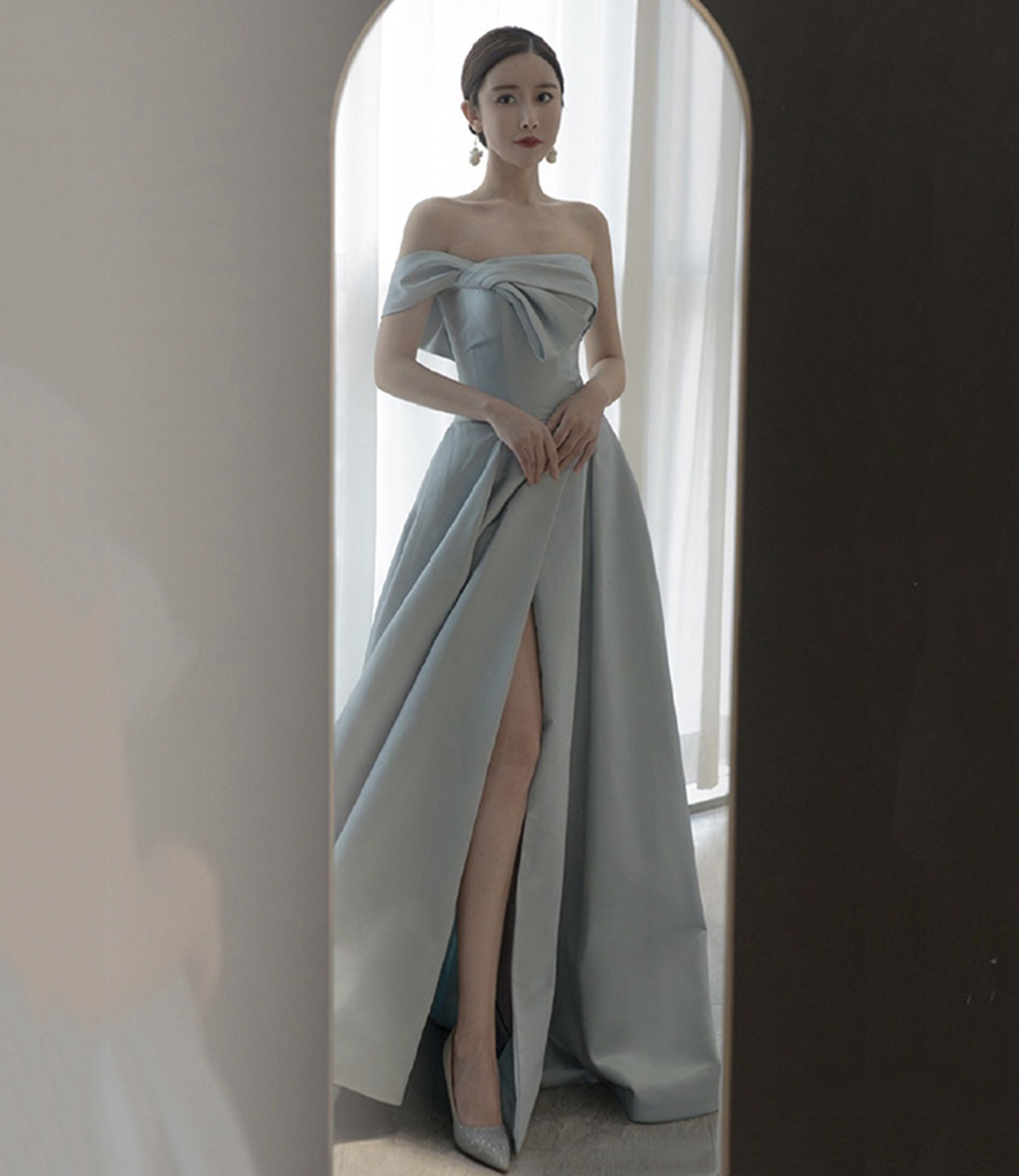 - Blue satin long prom dress A line evening dress -