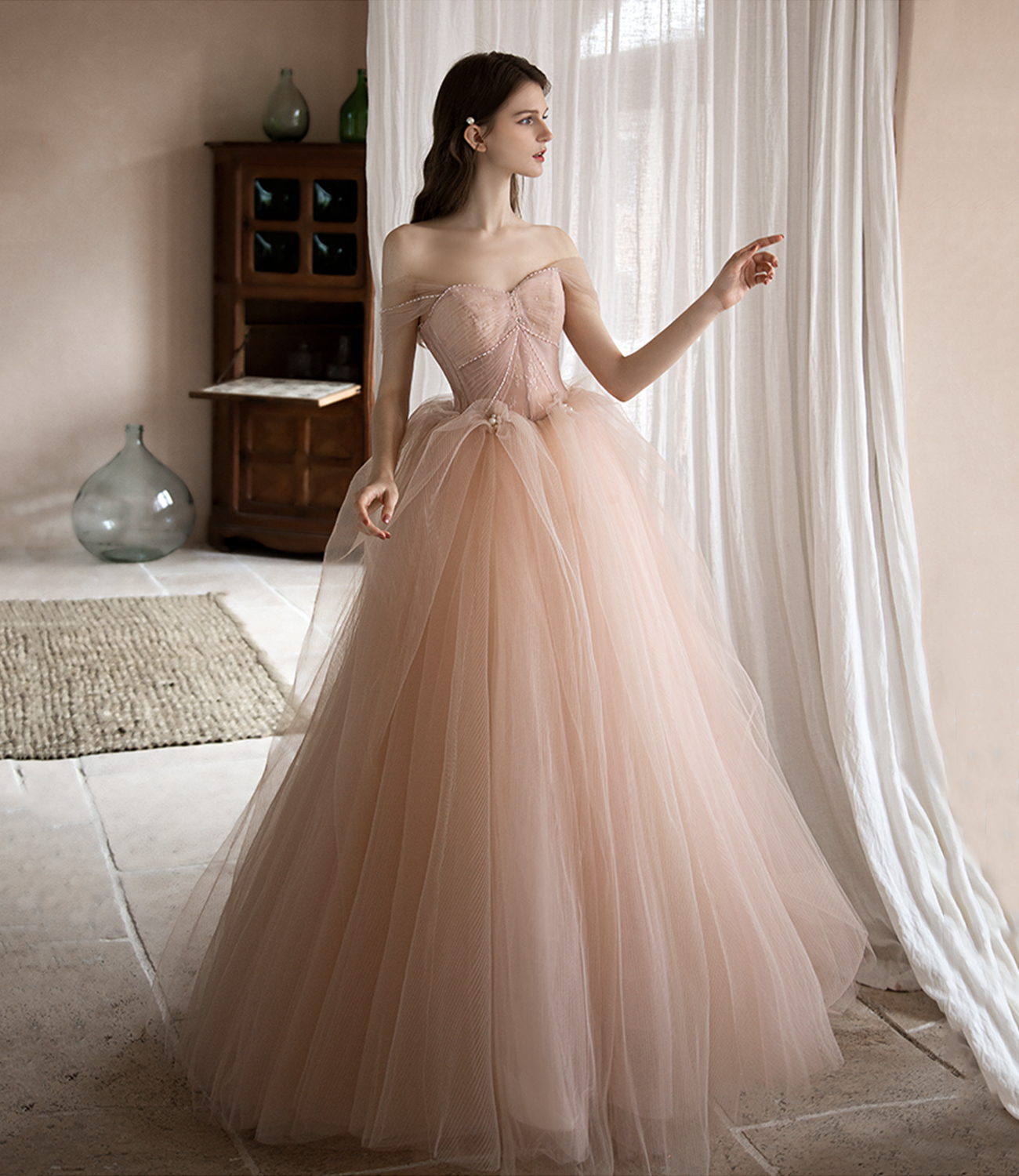 - Pink tulle long prom gown A line evening gown -