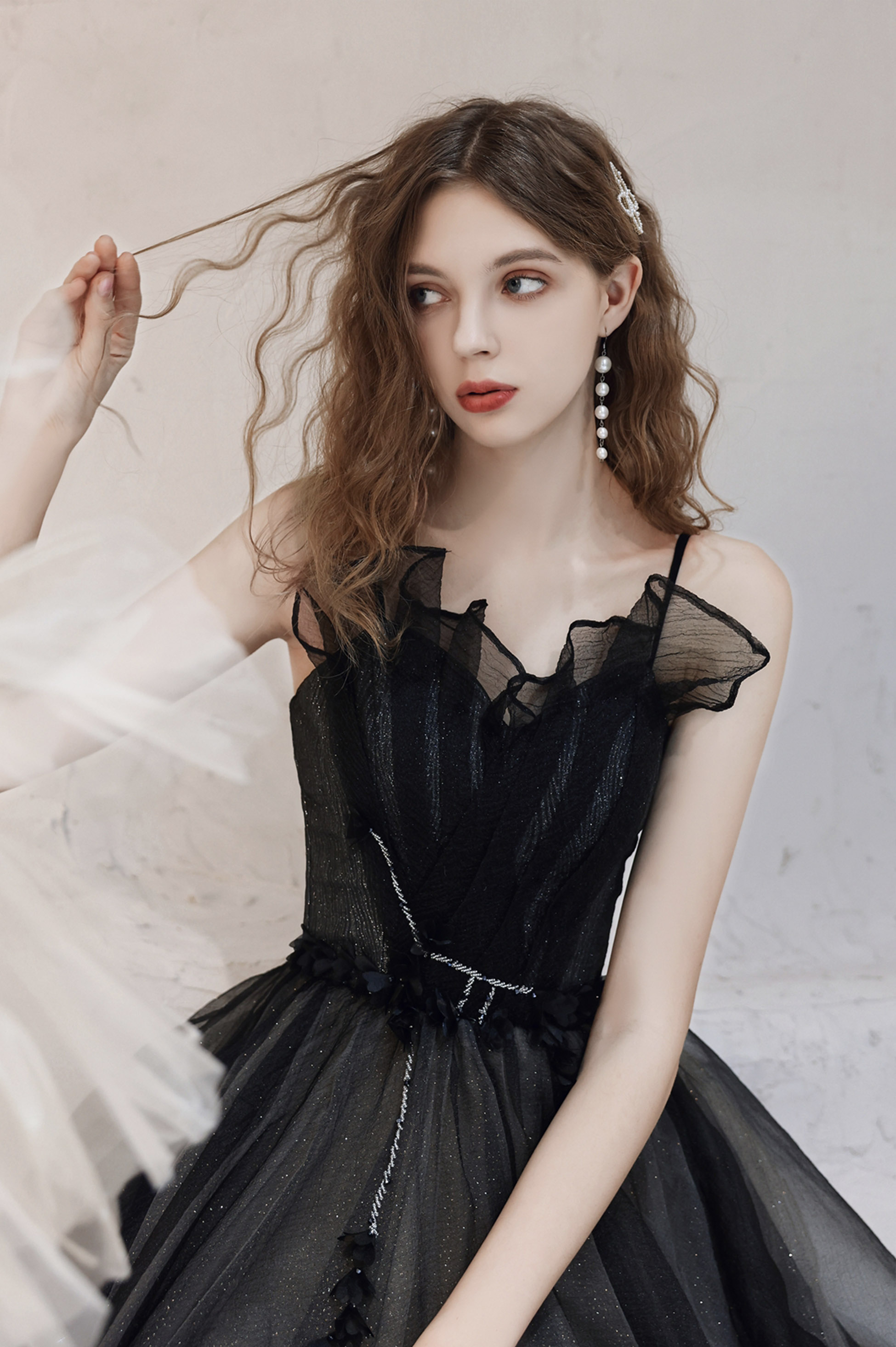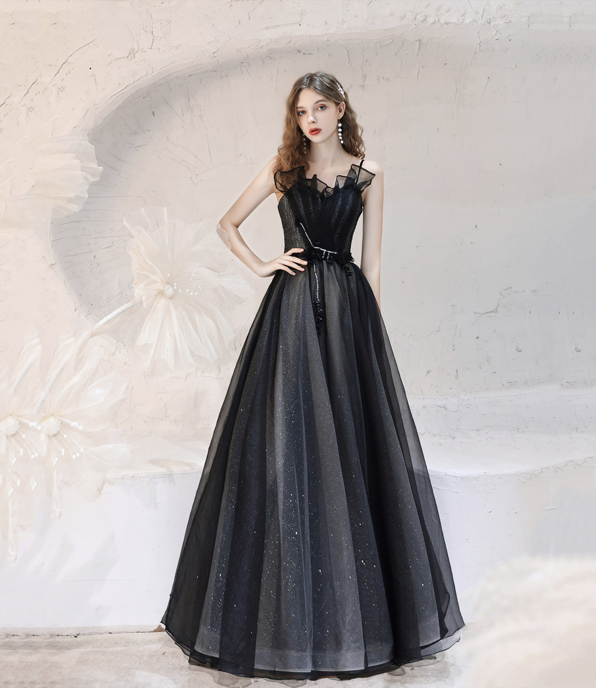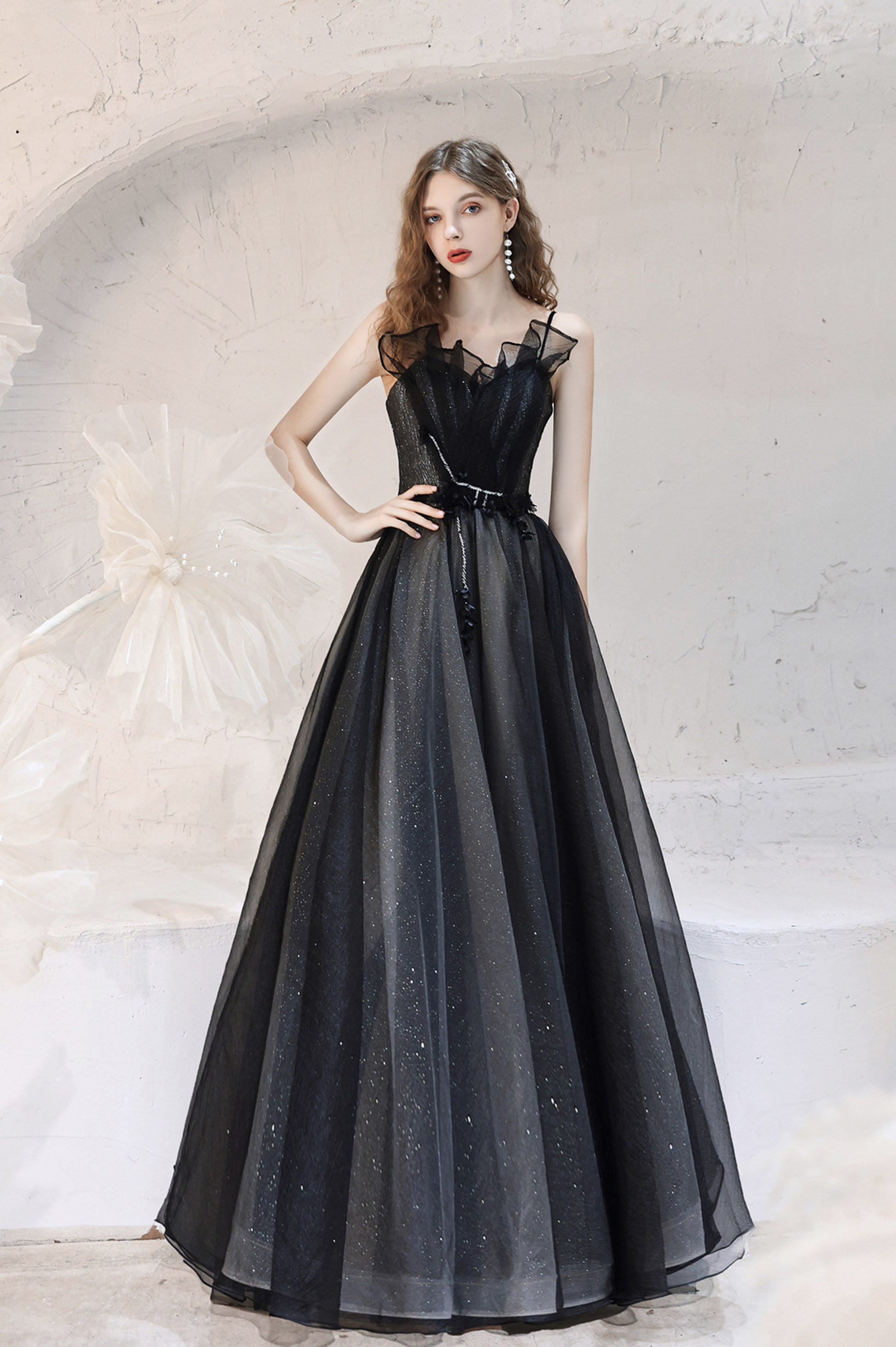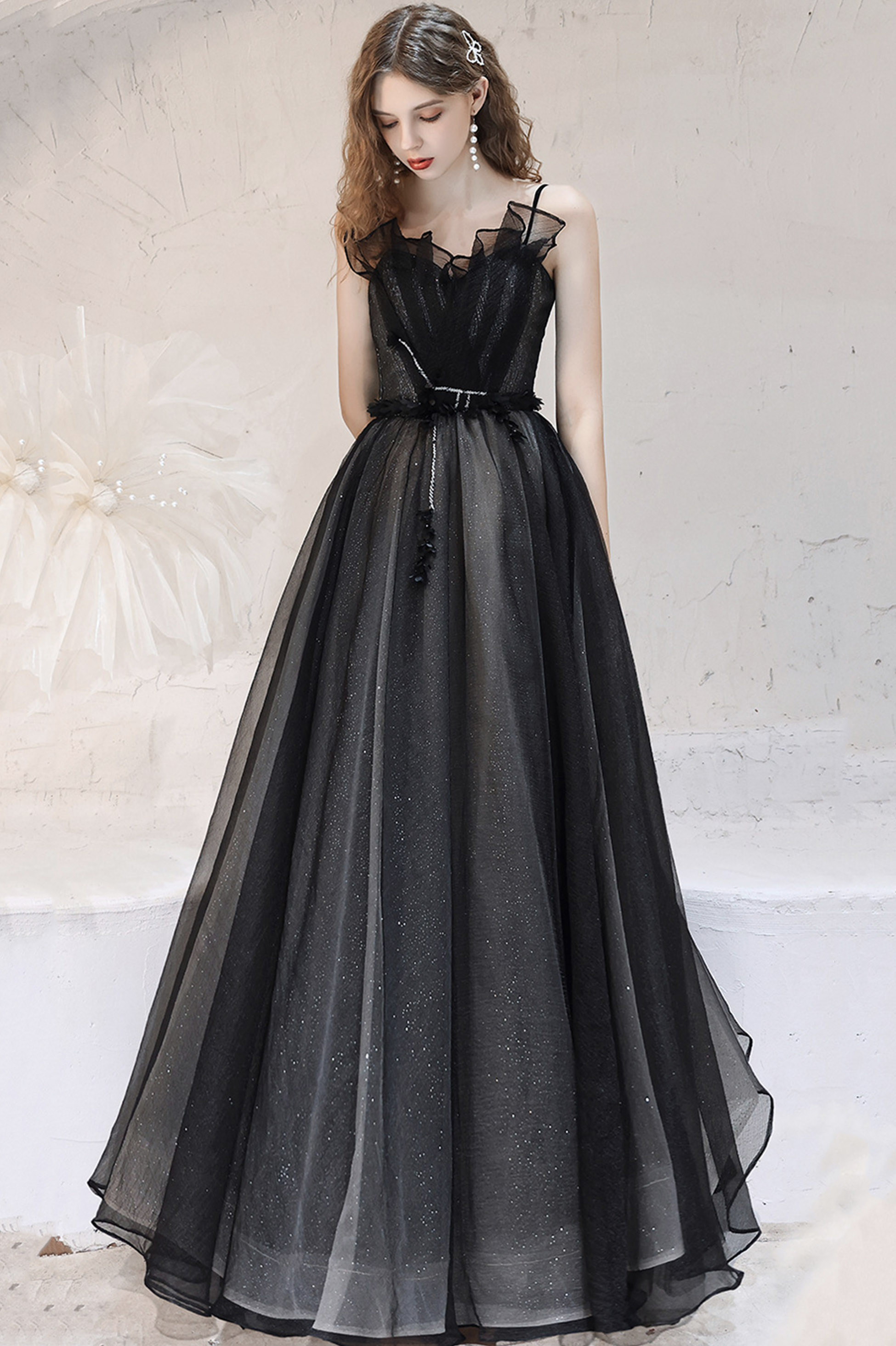 - A-Line Black tulle Spaghetti Straps Long Prom Dress -