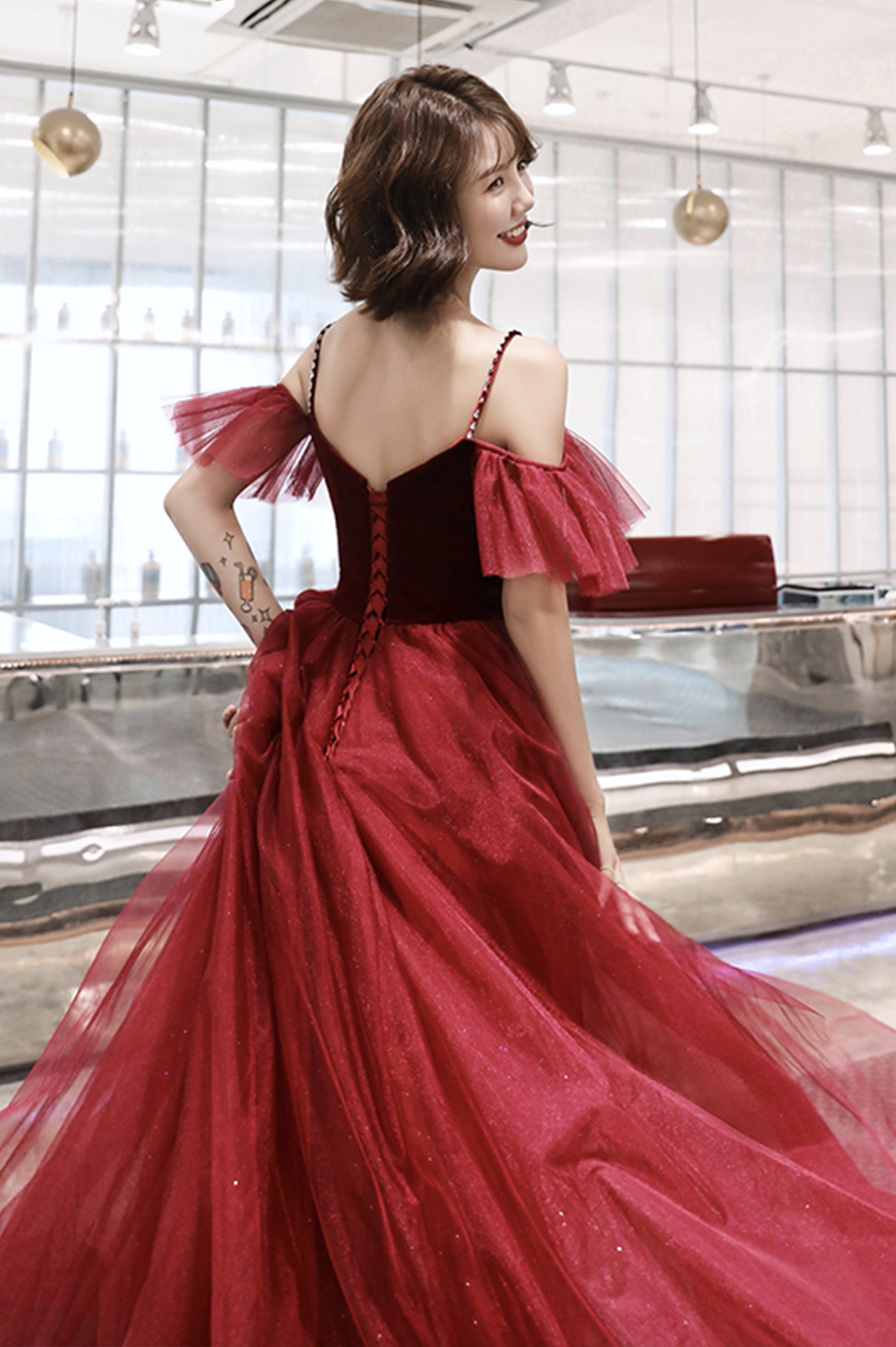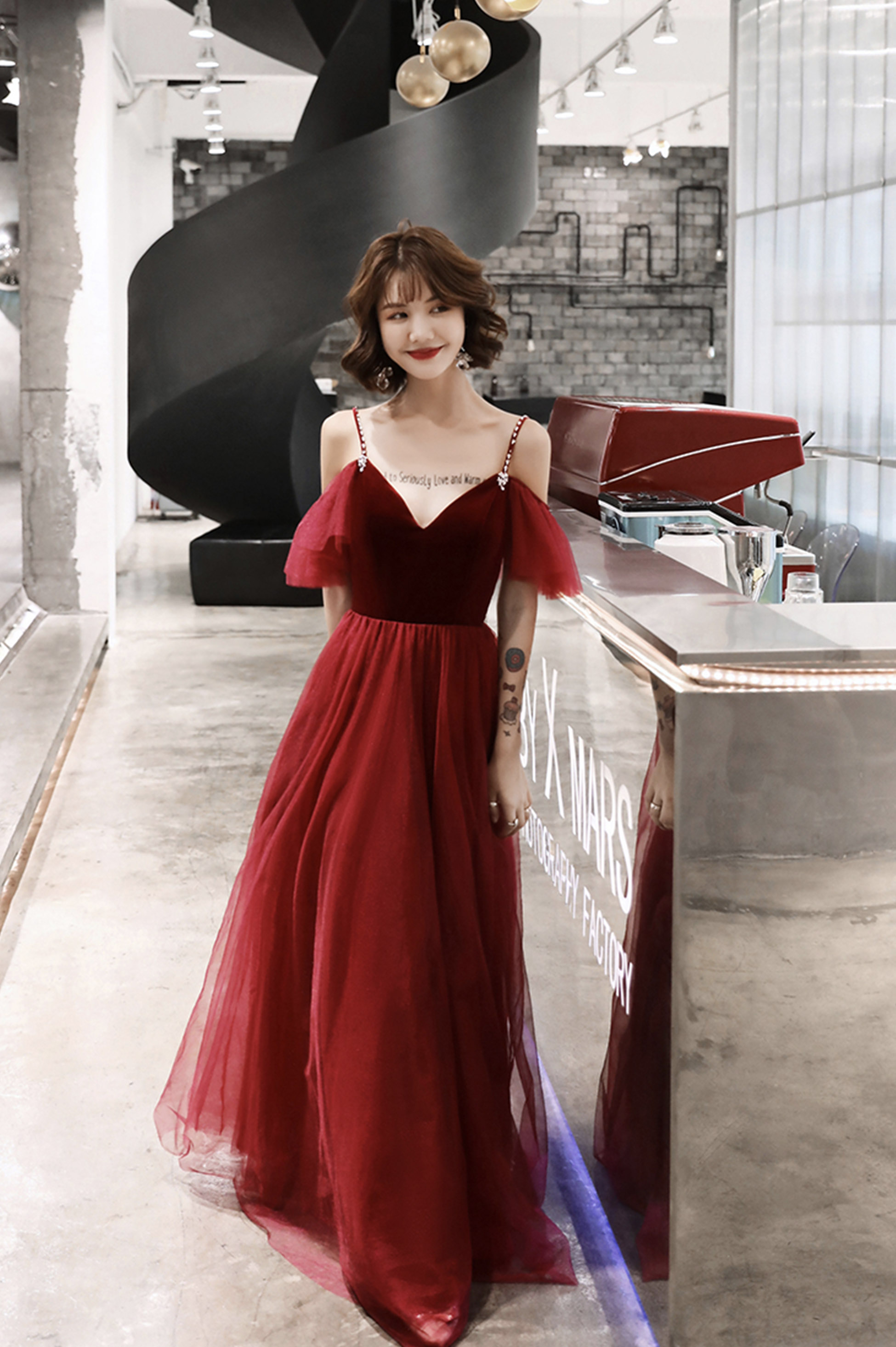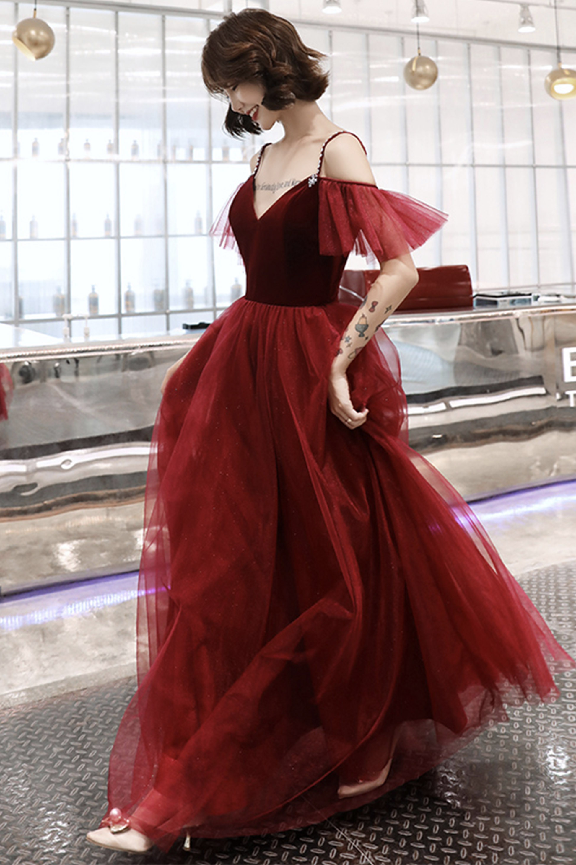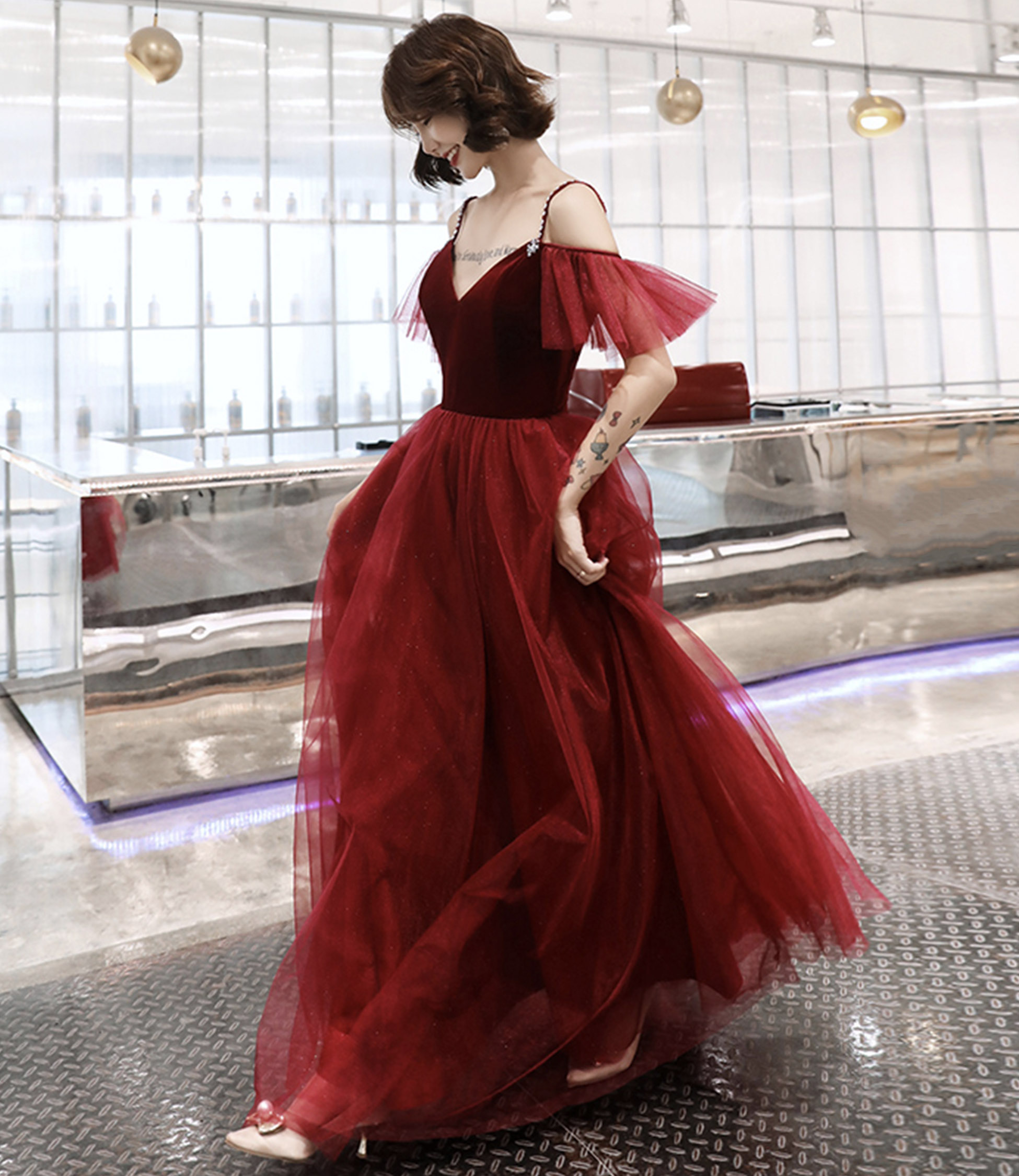 - Burgundy velvet tulle long prom dress A line evening dress -