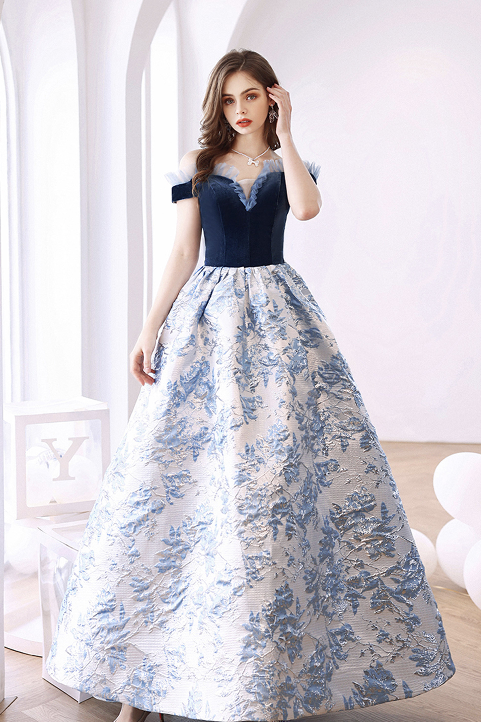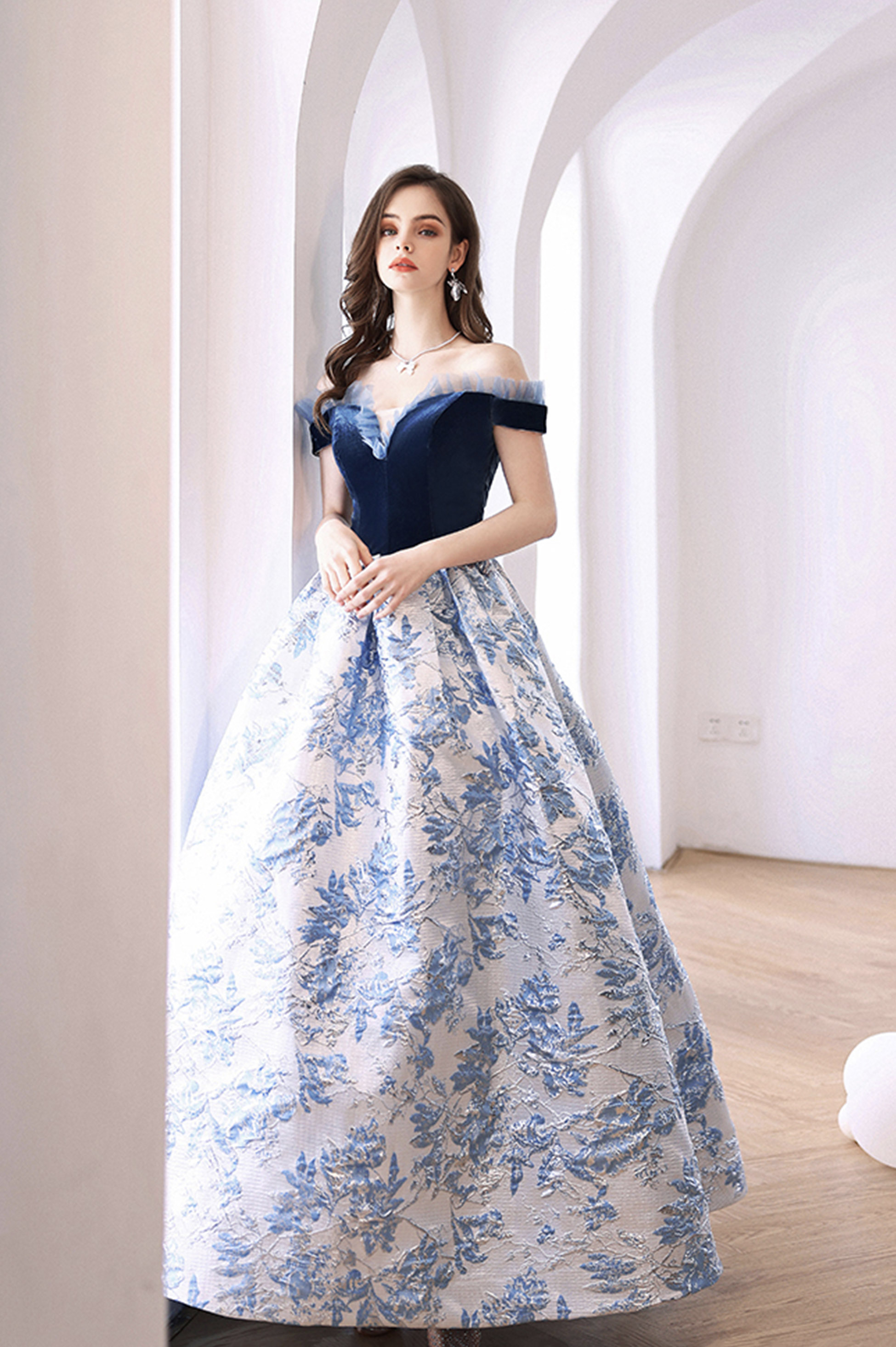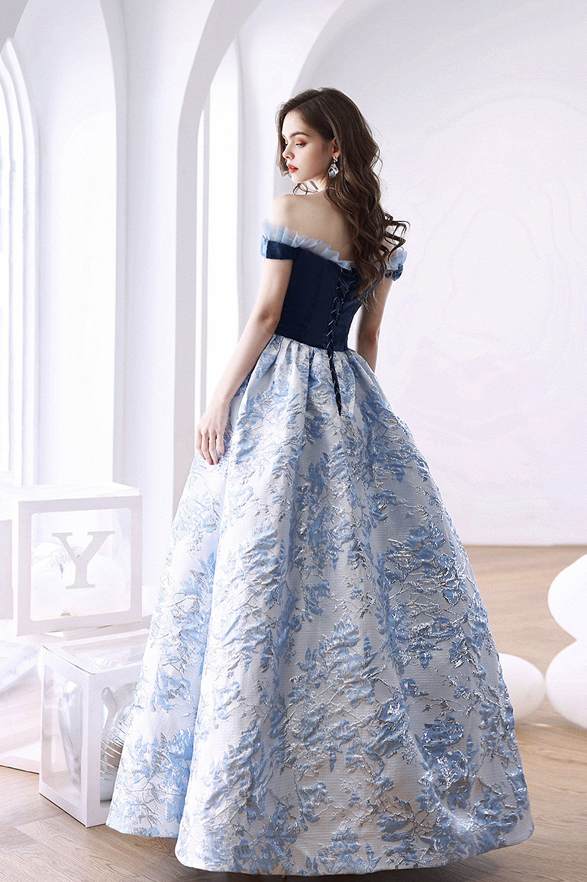 - Blue jacquard long ball gown blue evening dress -