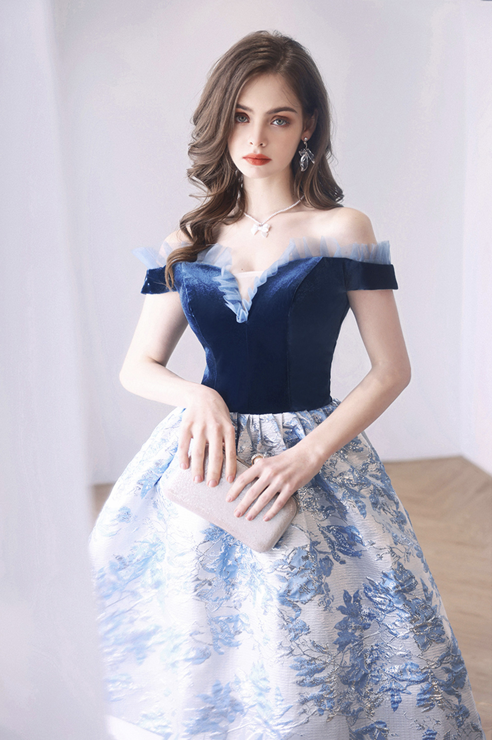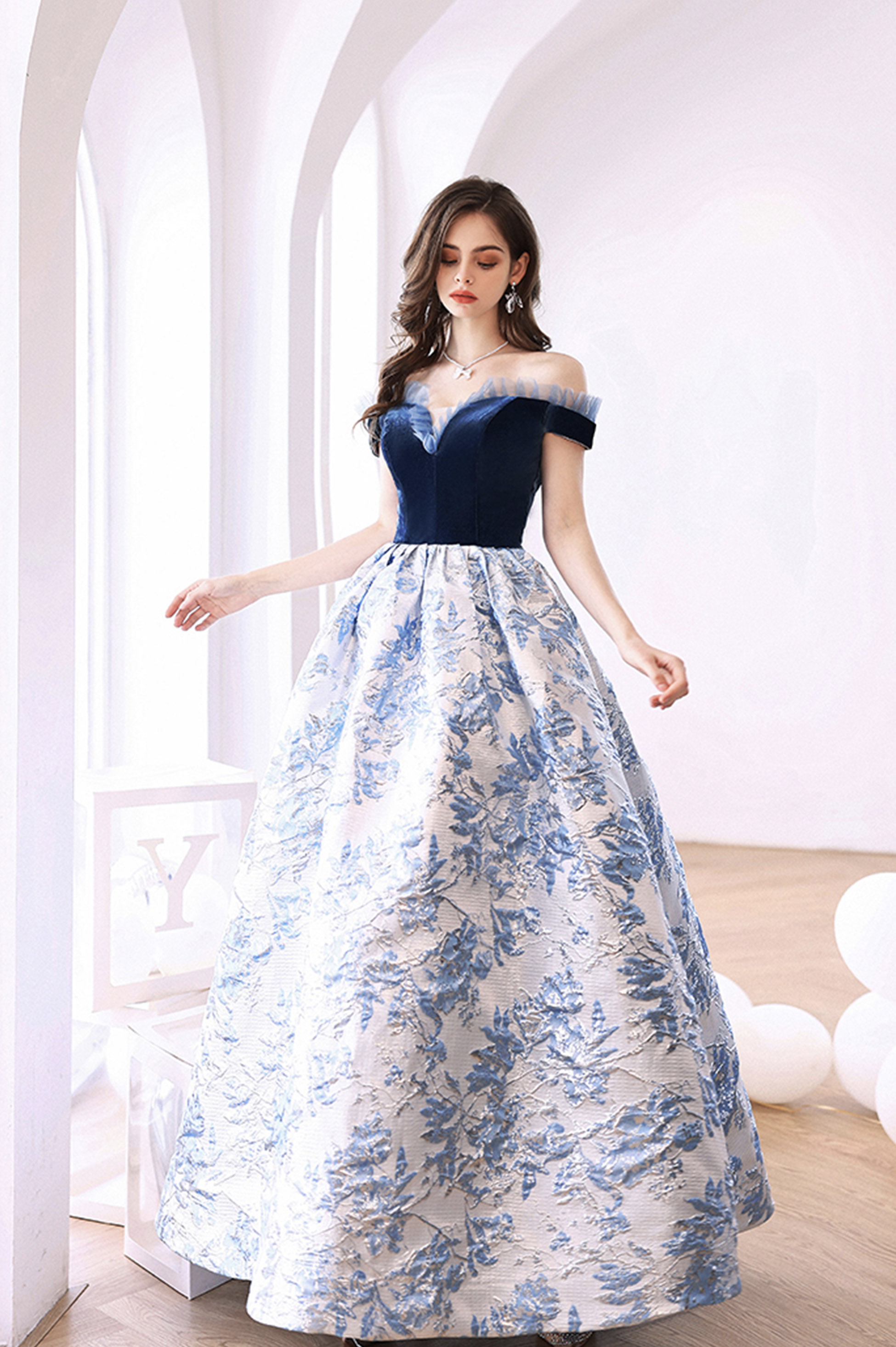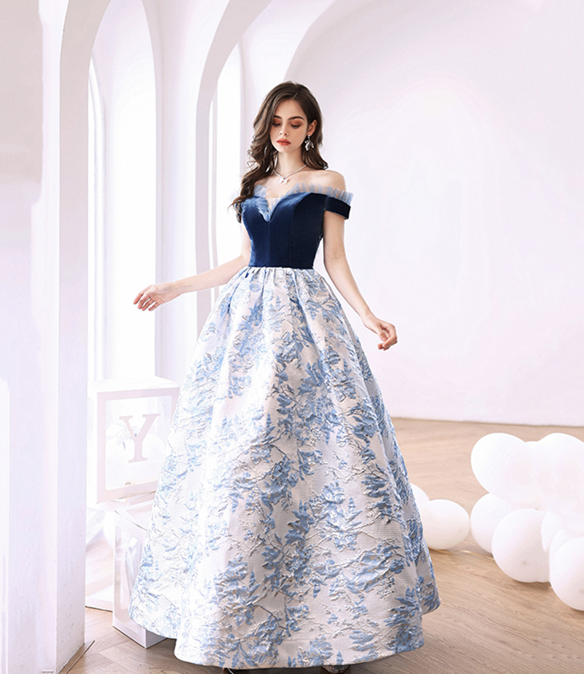 - Blue jacquard long ball gown blue evening dress -