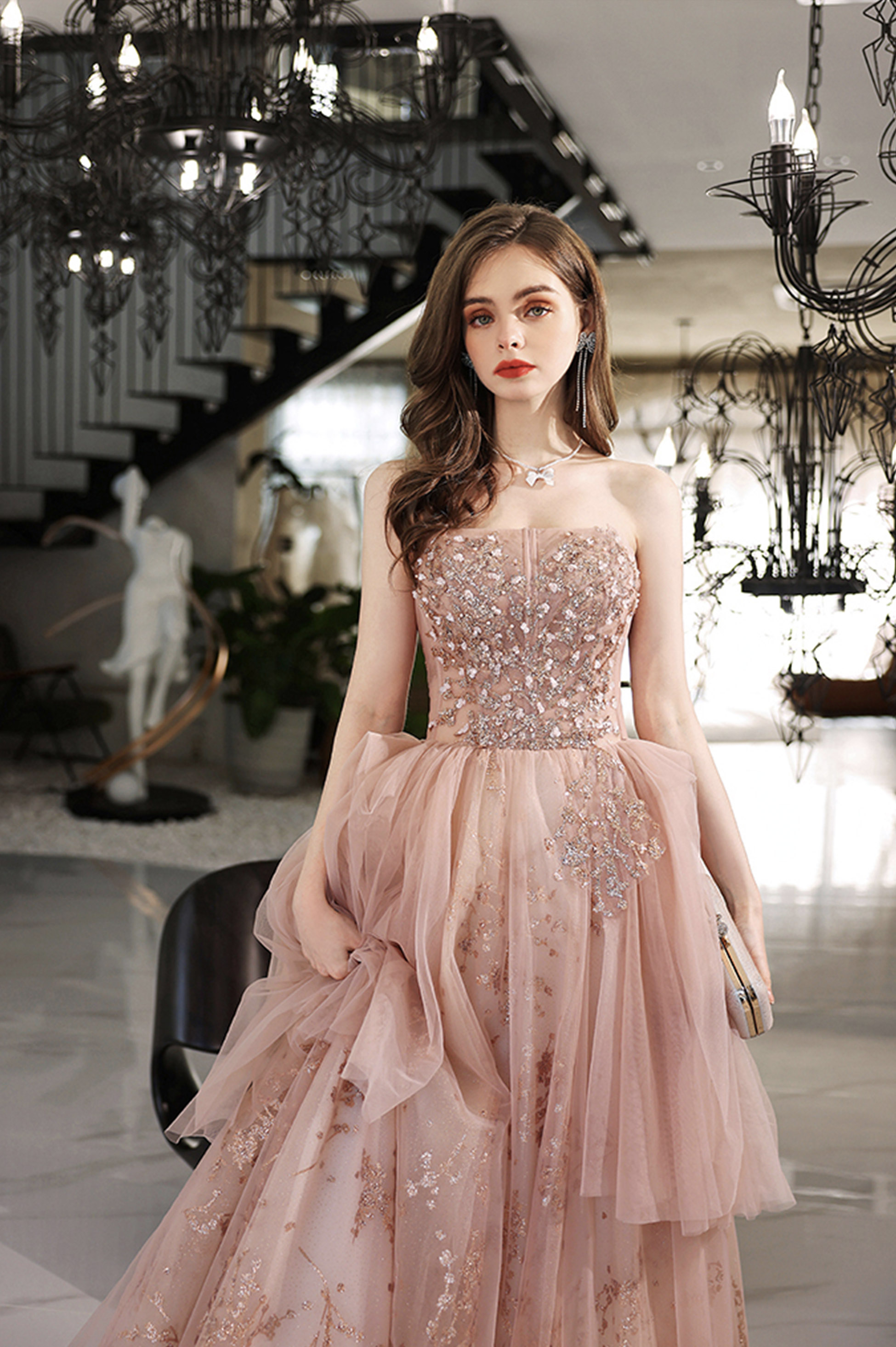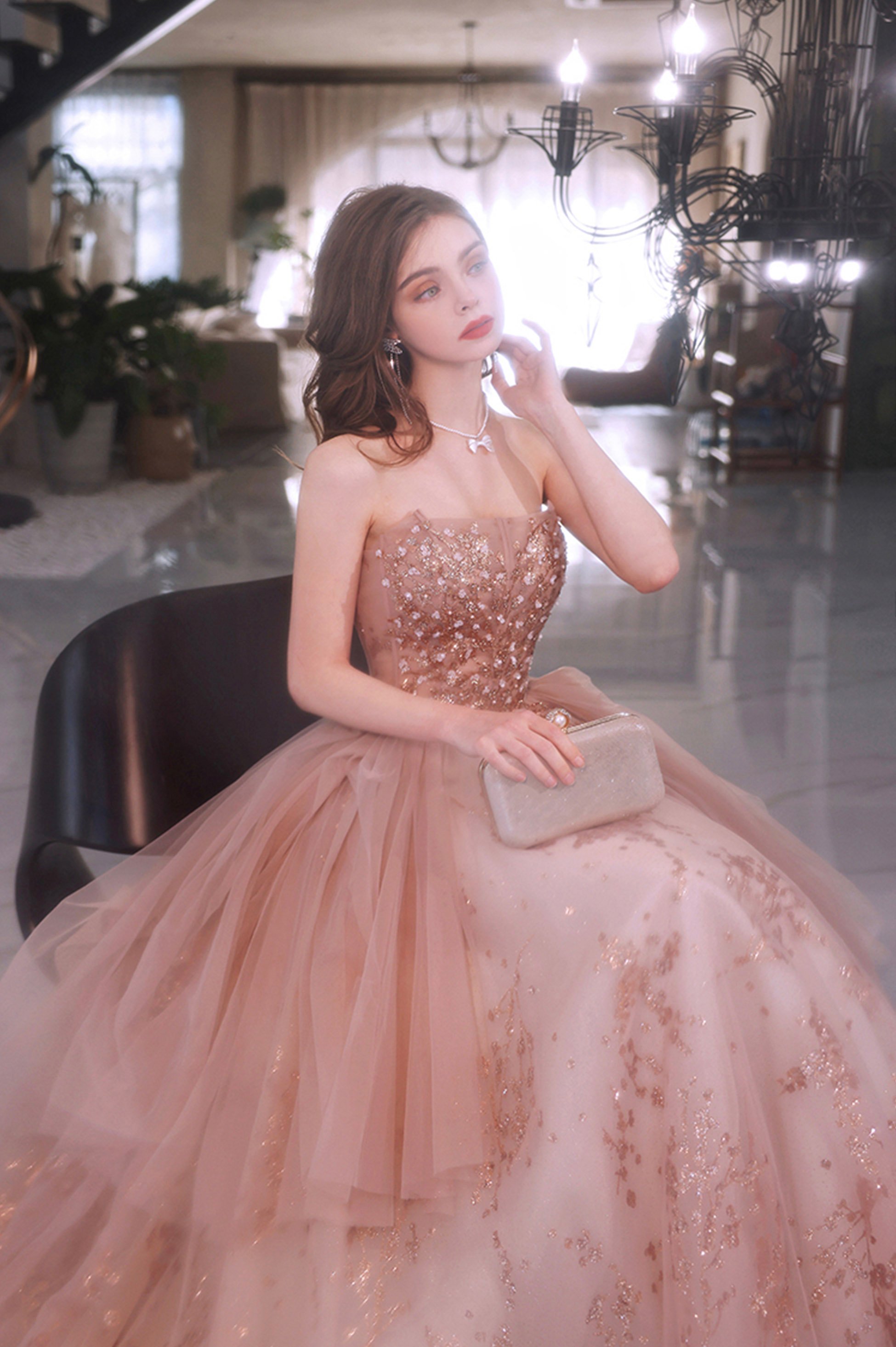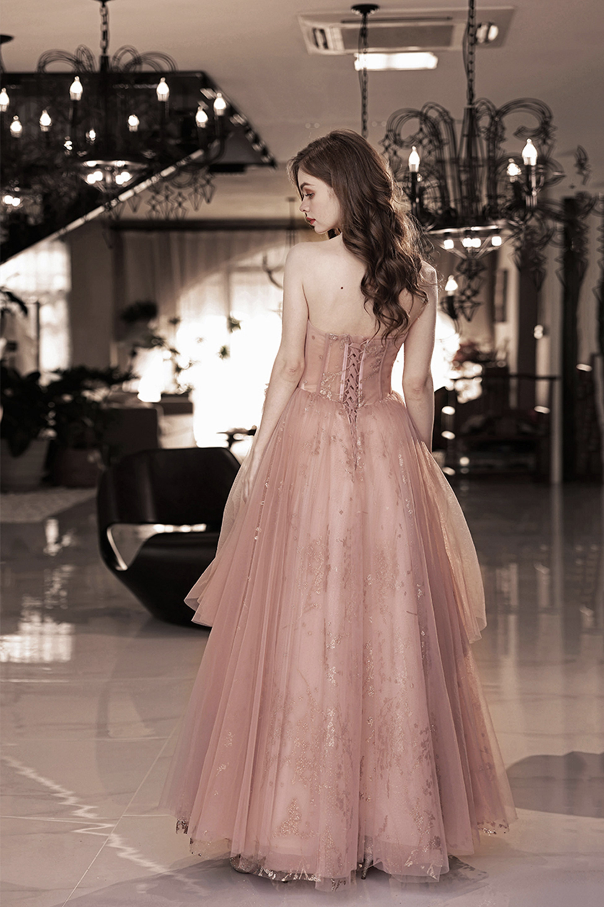 - Pink tulle sequins long prom dress pink evening dress -