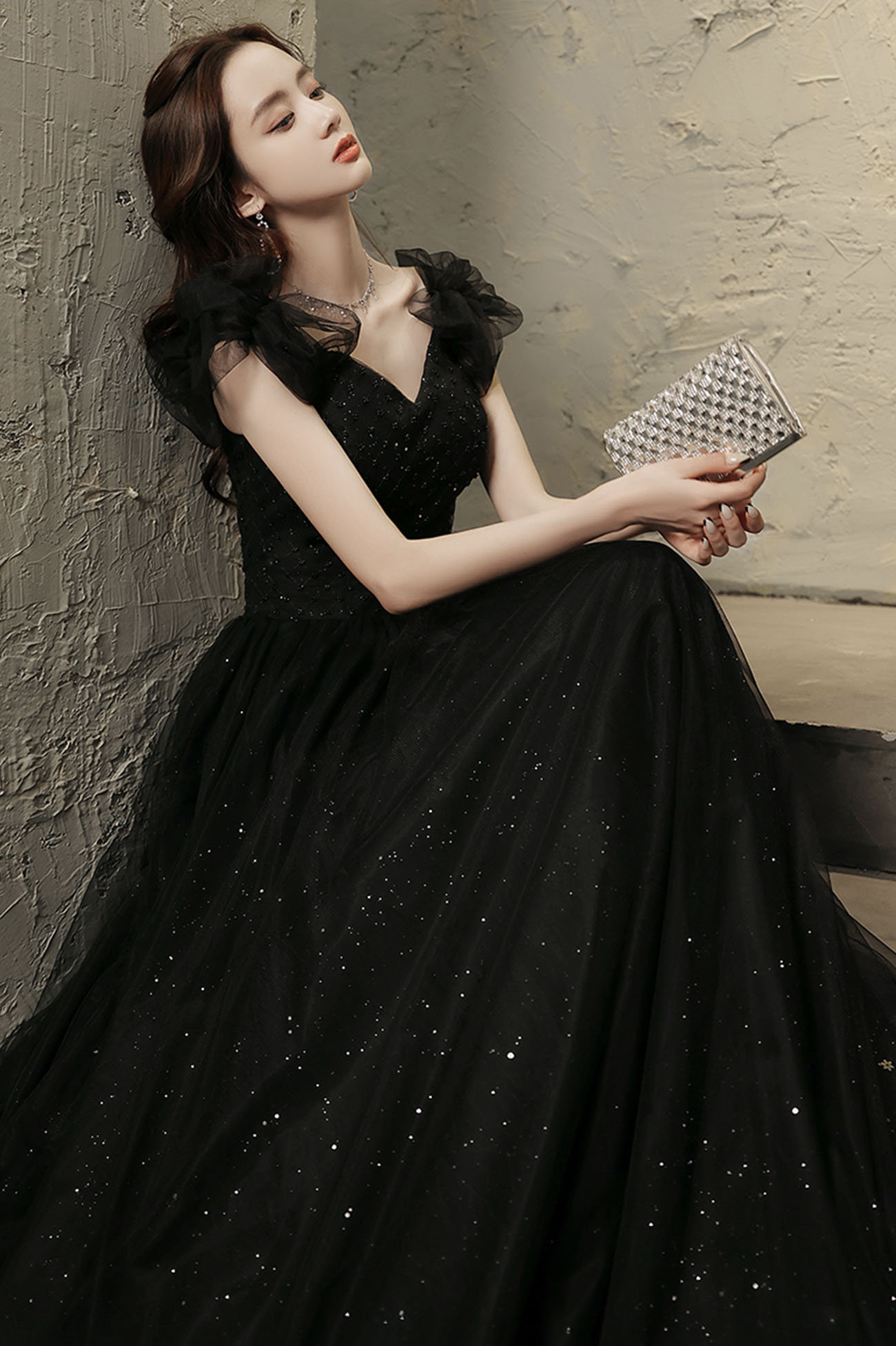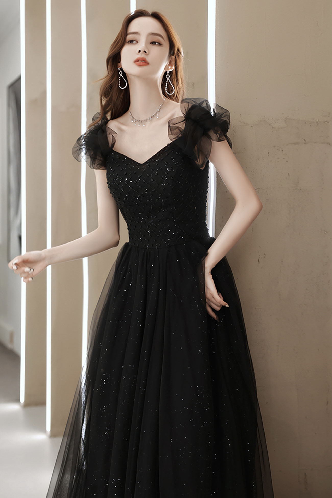 - Black tulle beaded long prom dress evening dress -