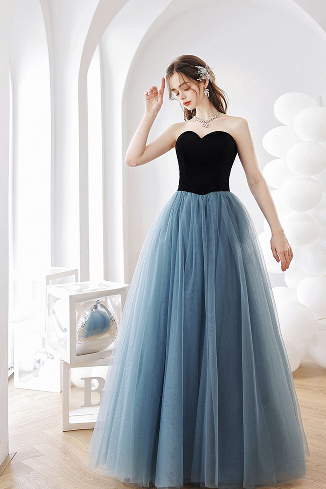 - Blue tulle long A-line prom dress blue evening dress -