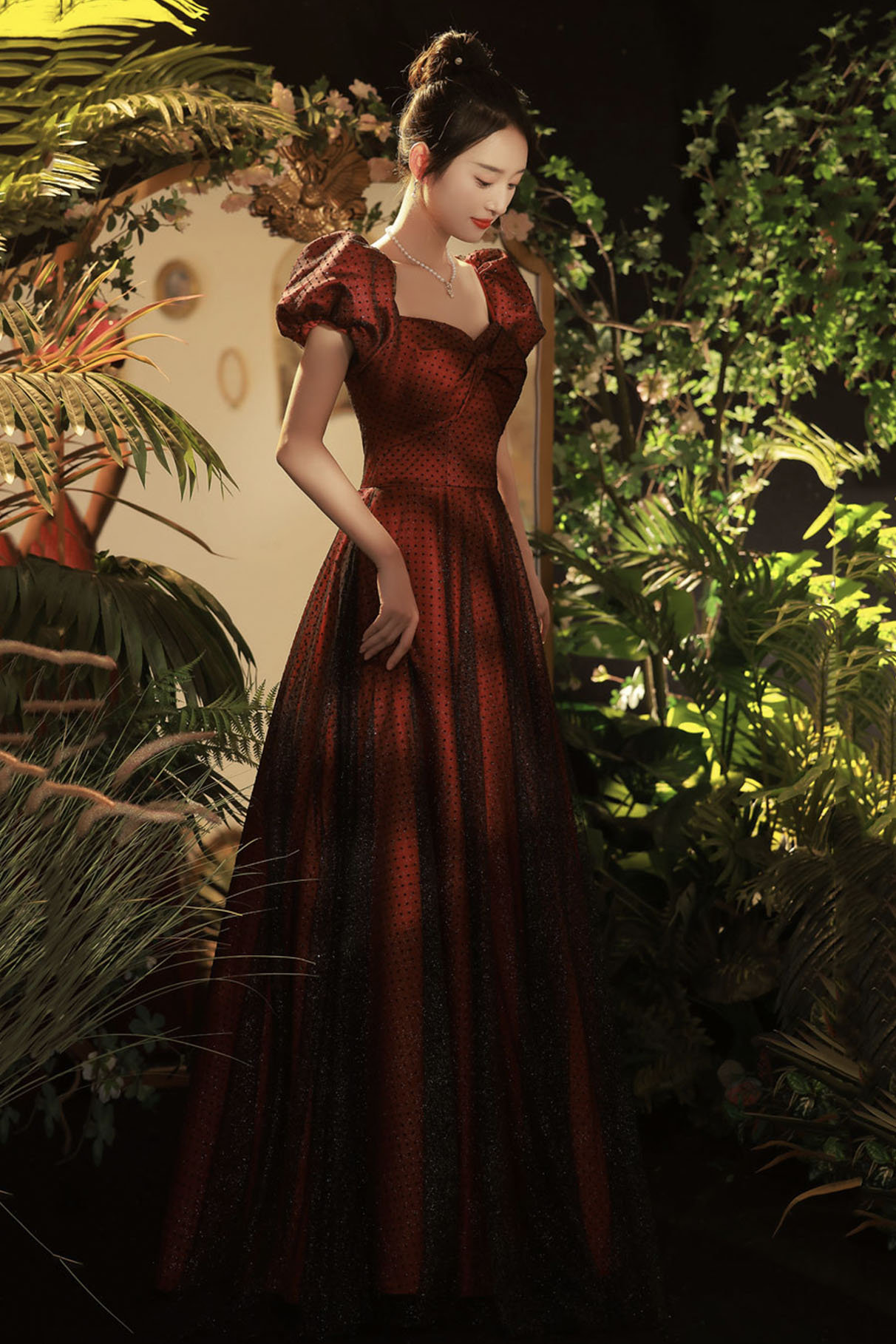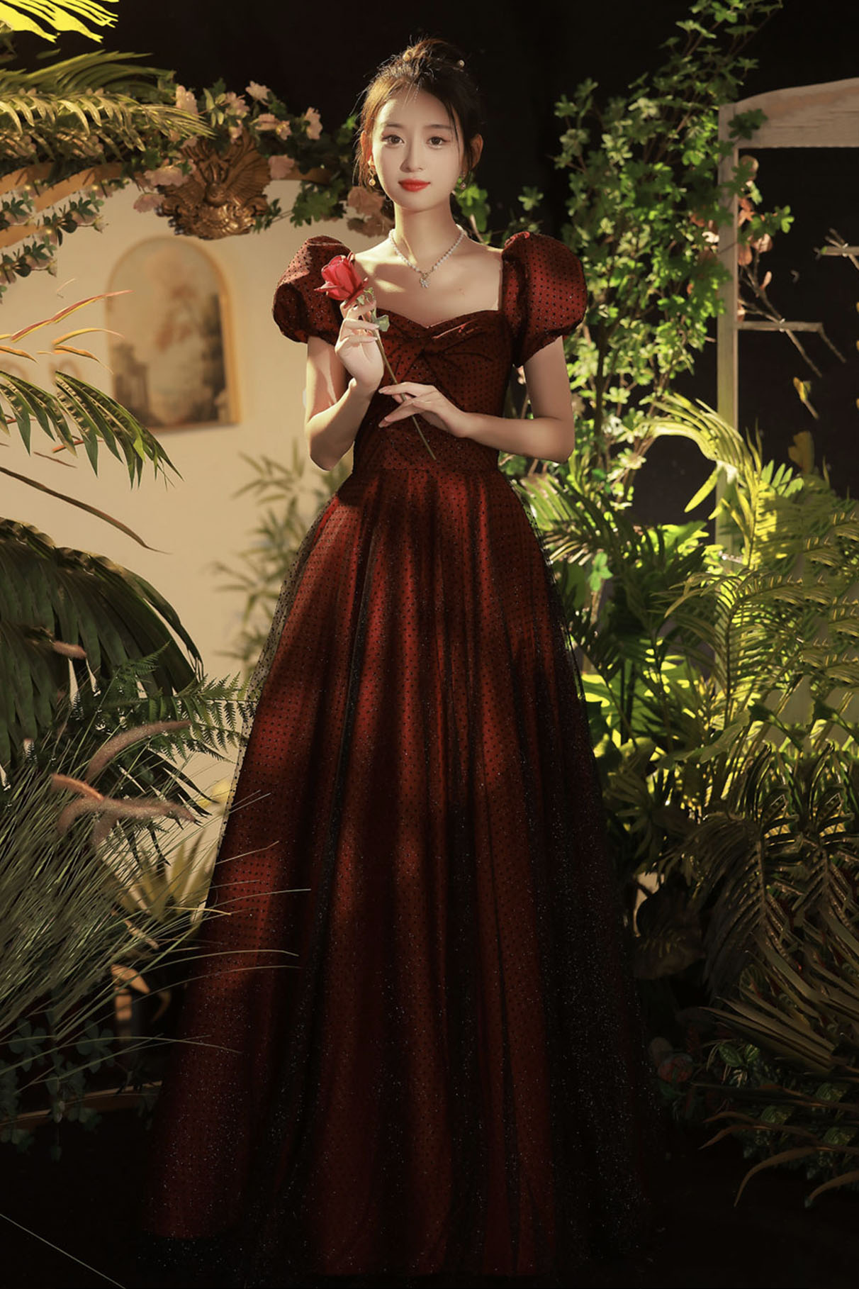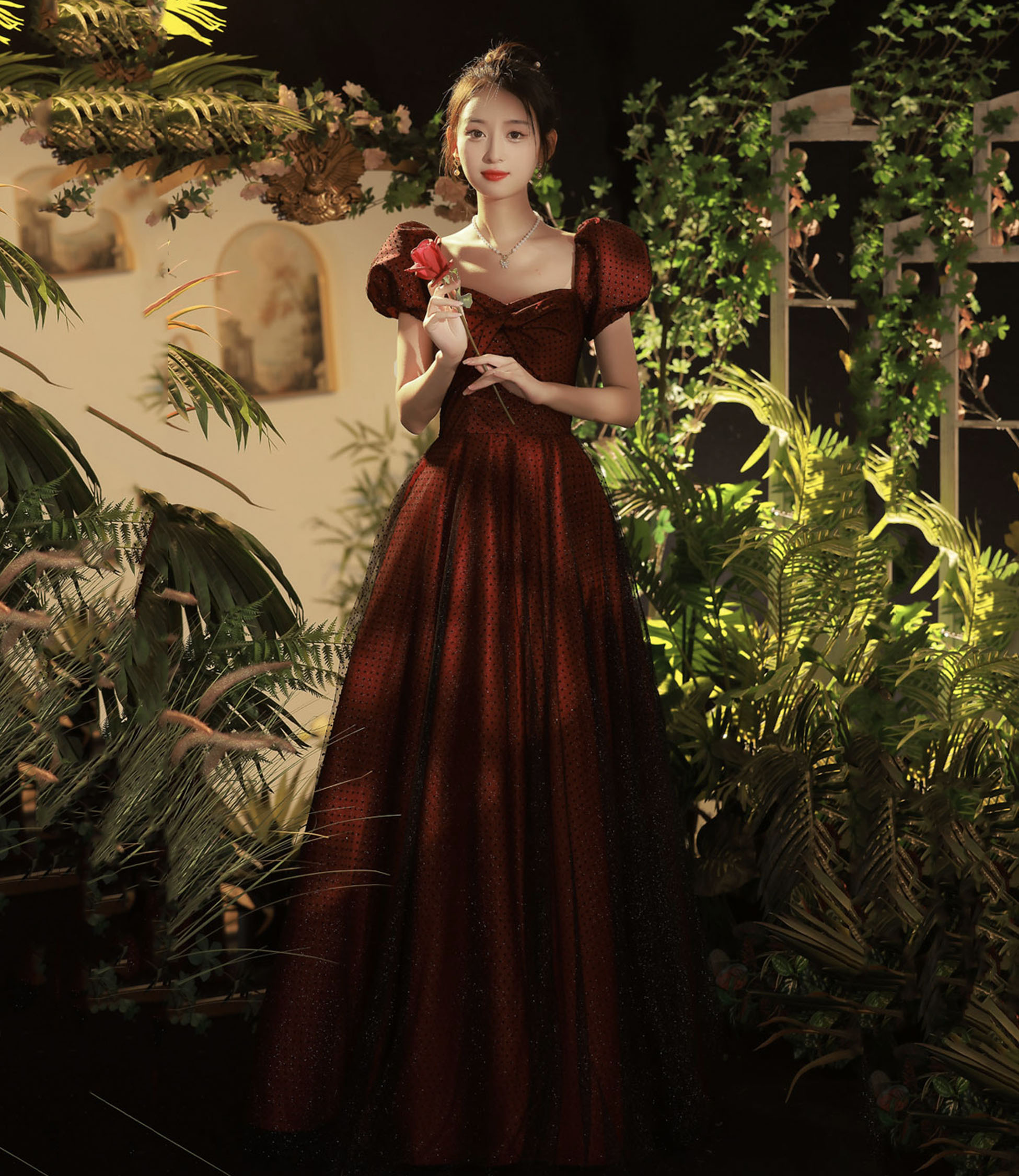 - Burgundy tulle long prom dress A-line evening dress -