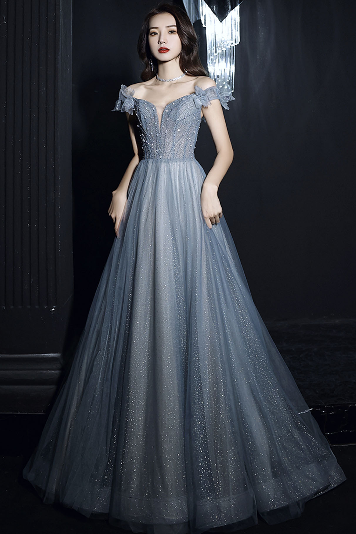 - Blue V-neck tulle beaded long prom dress A-line evening dress -