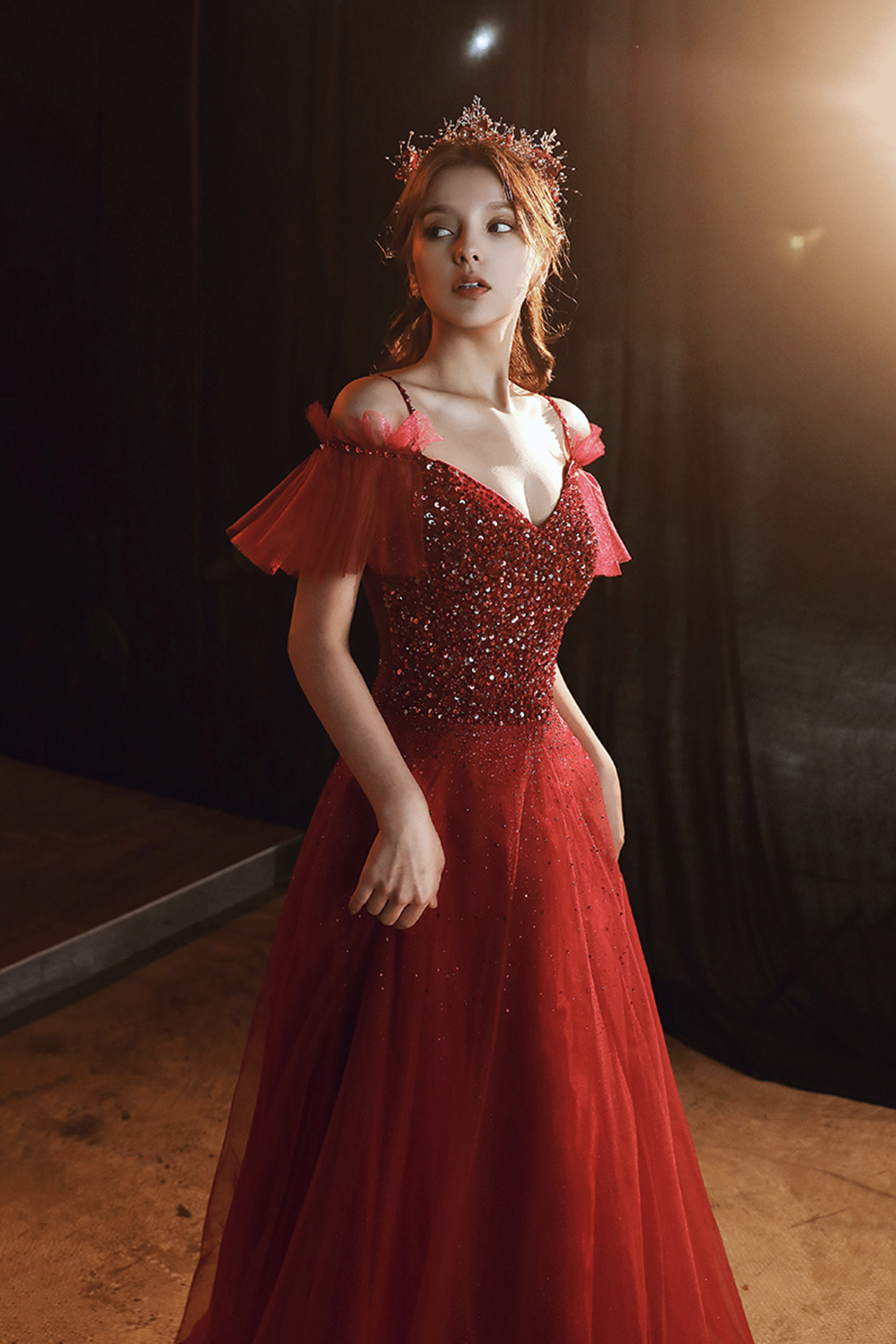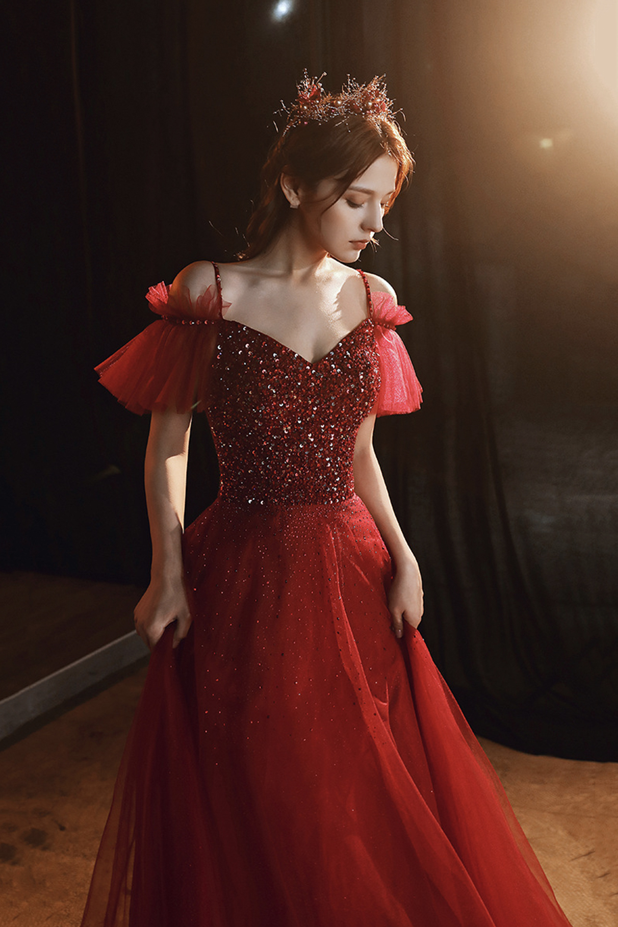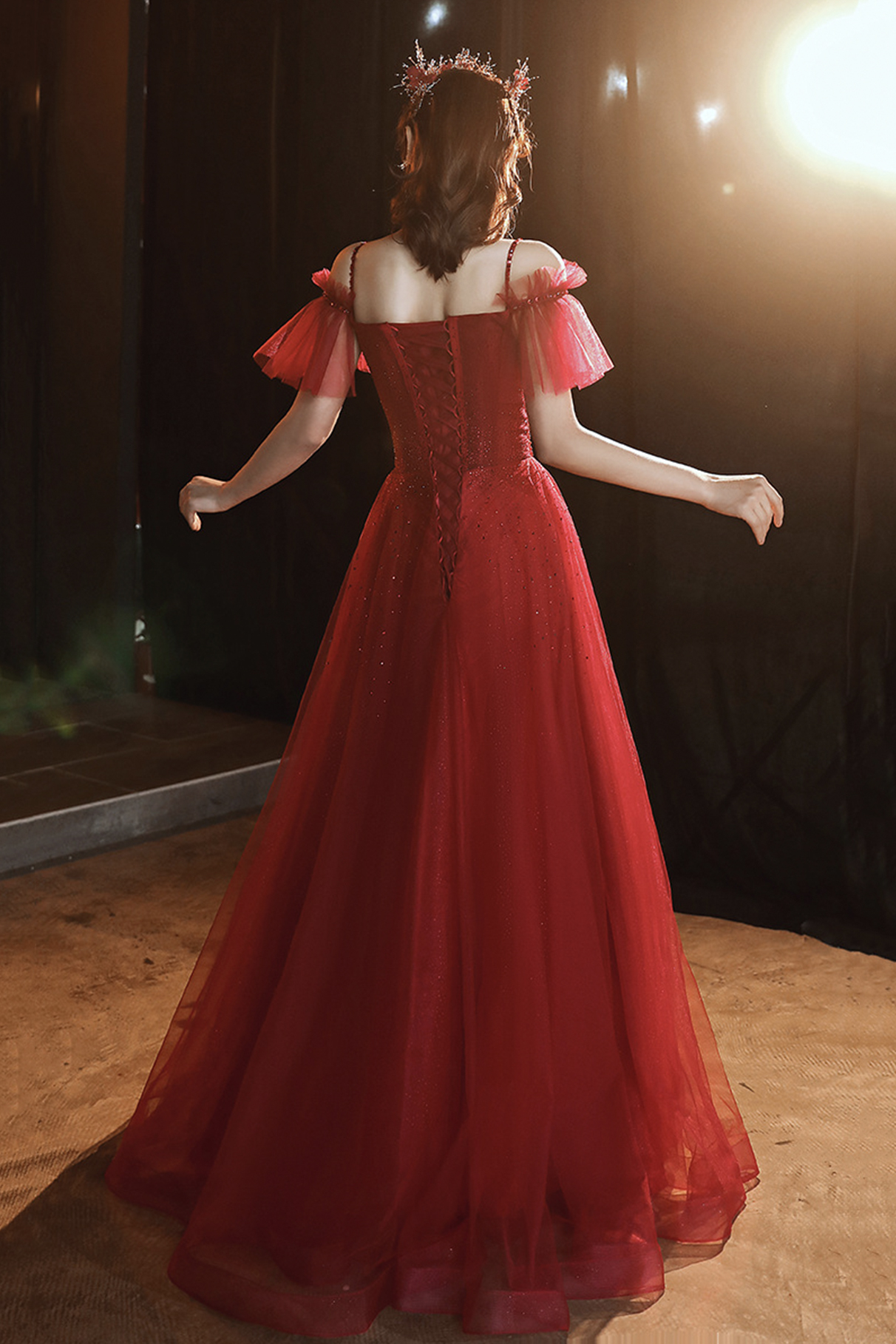 - Burgundy A-line tulle beaded long prom dress evening dress -