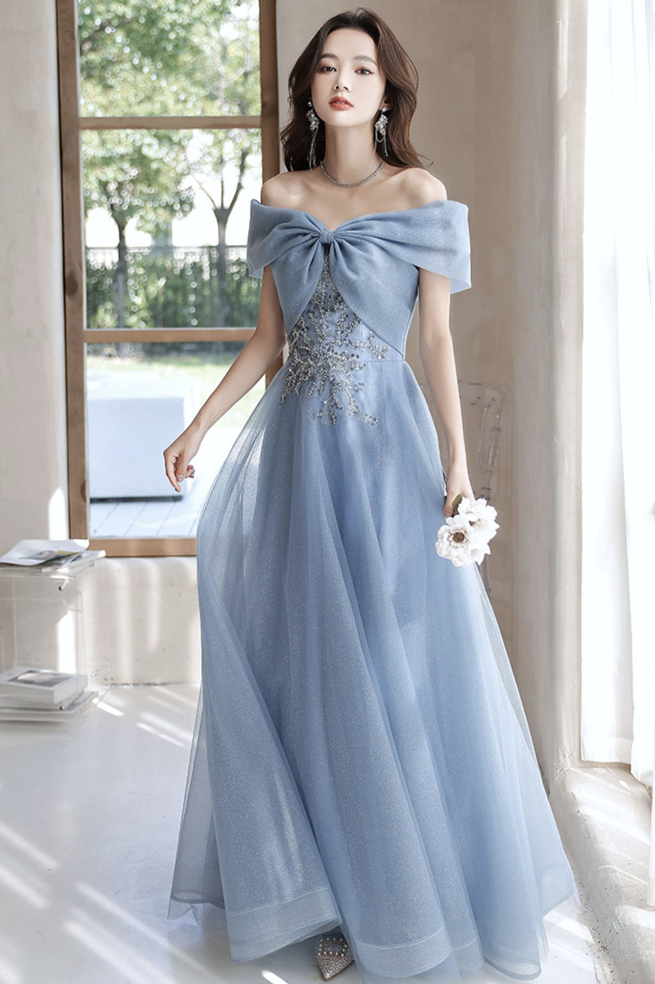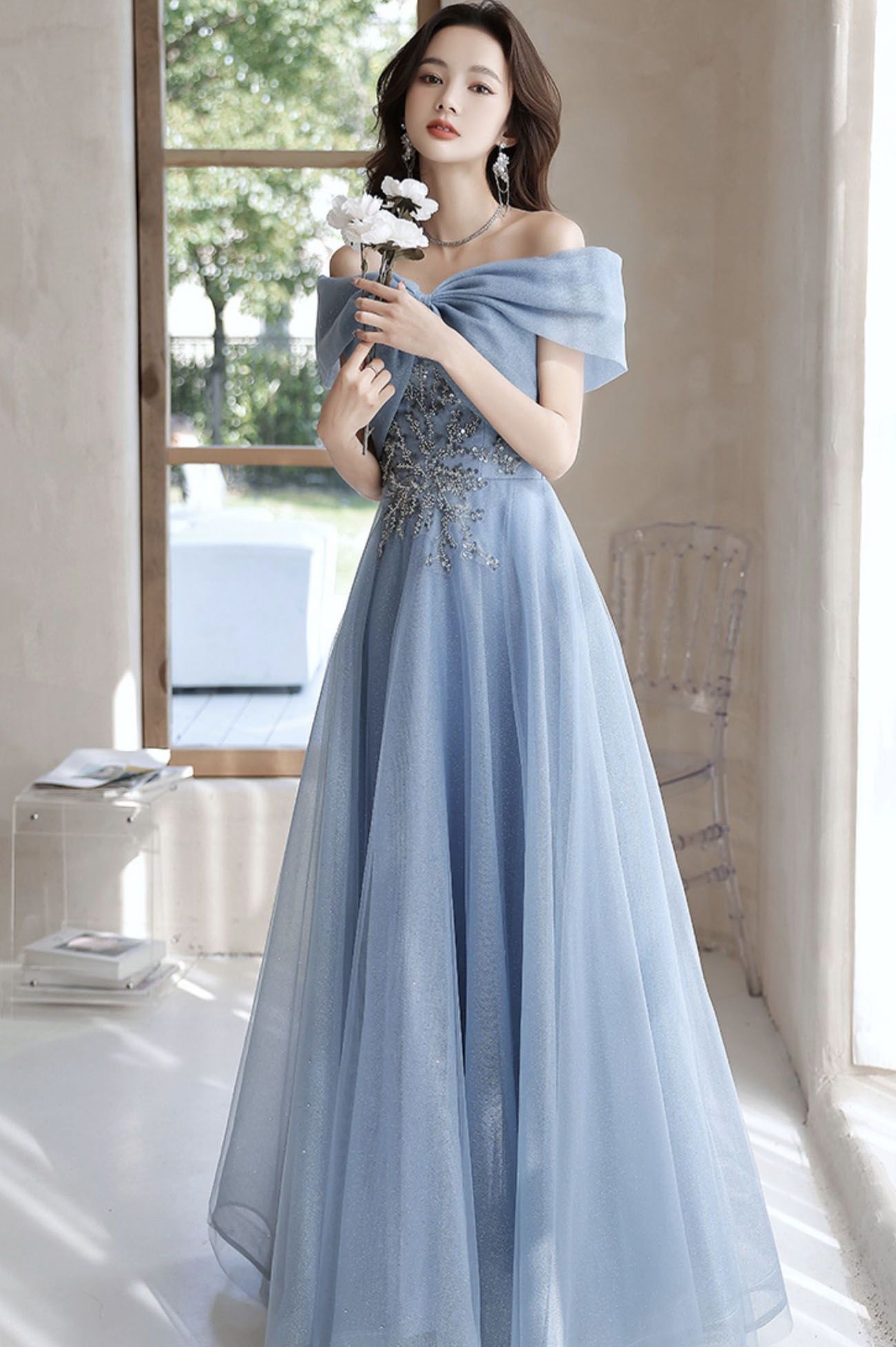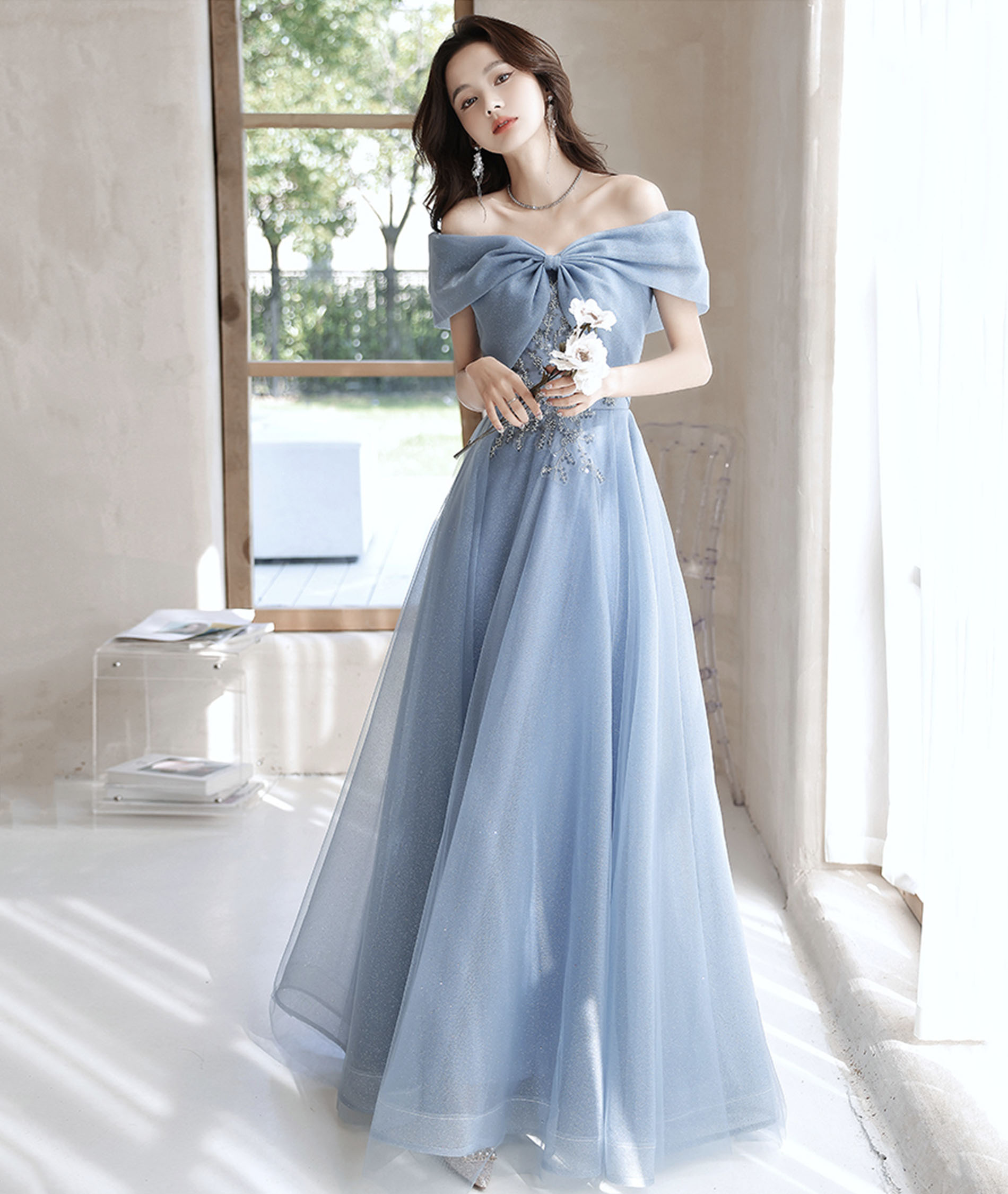 - Blue tulle long prom dress off shoulder evening dress -