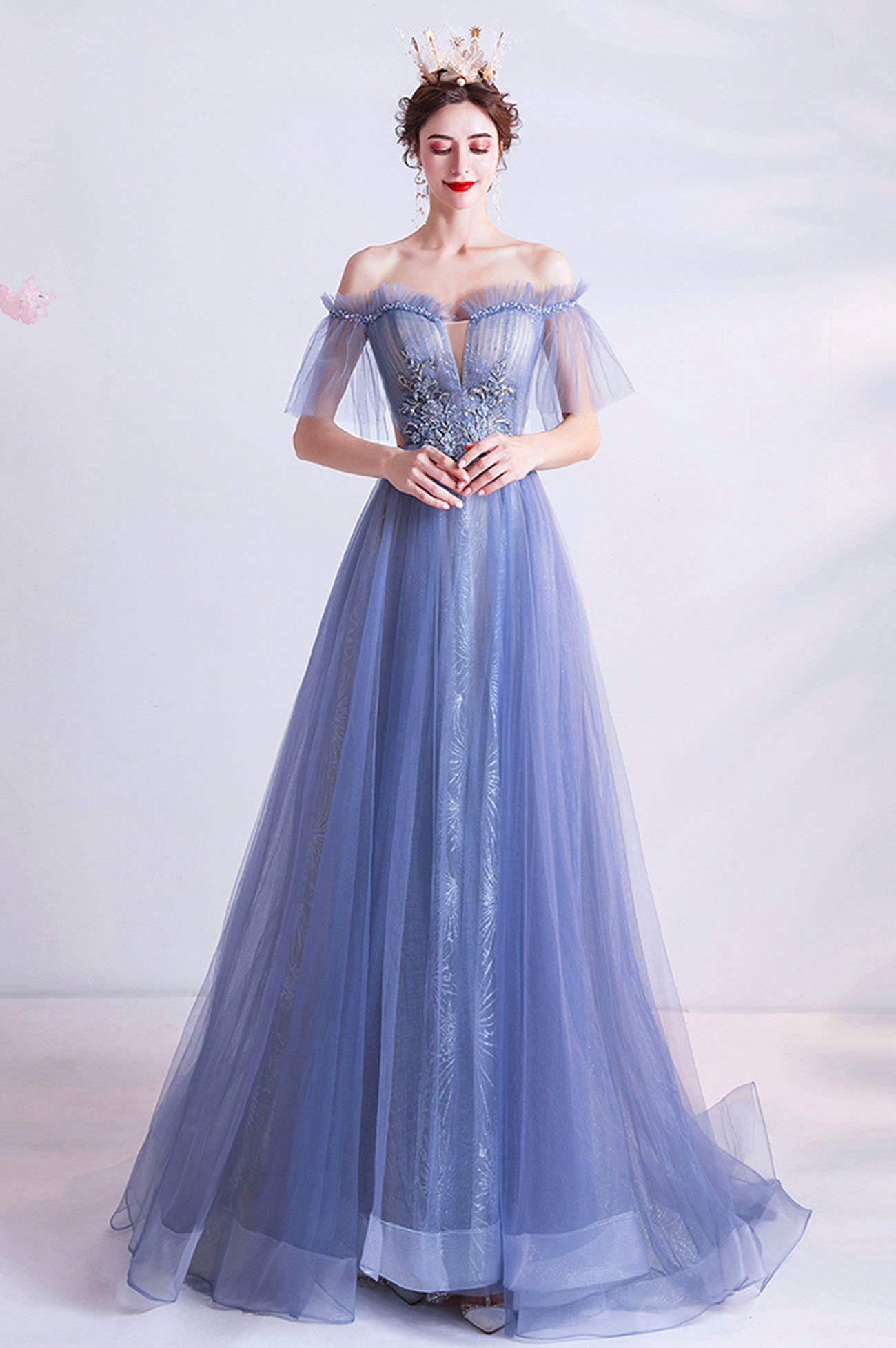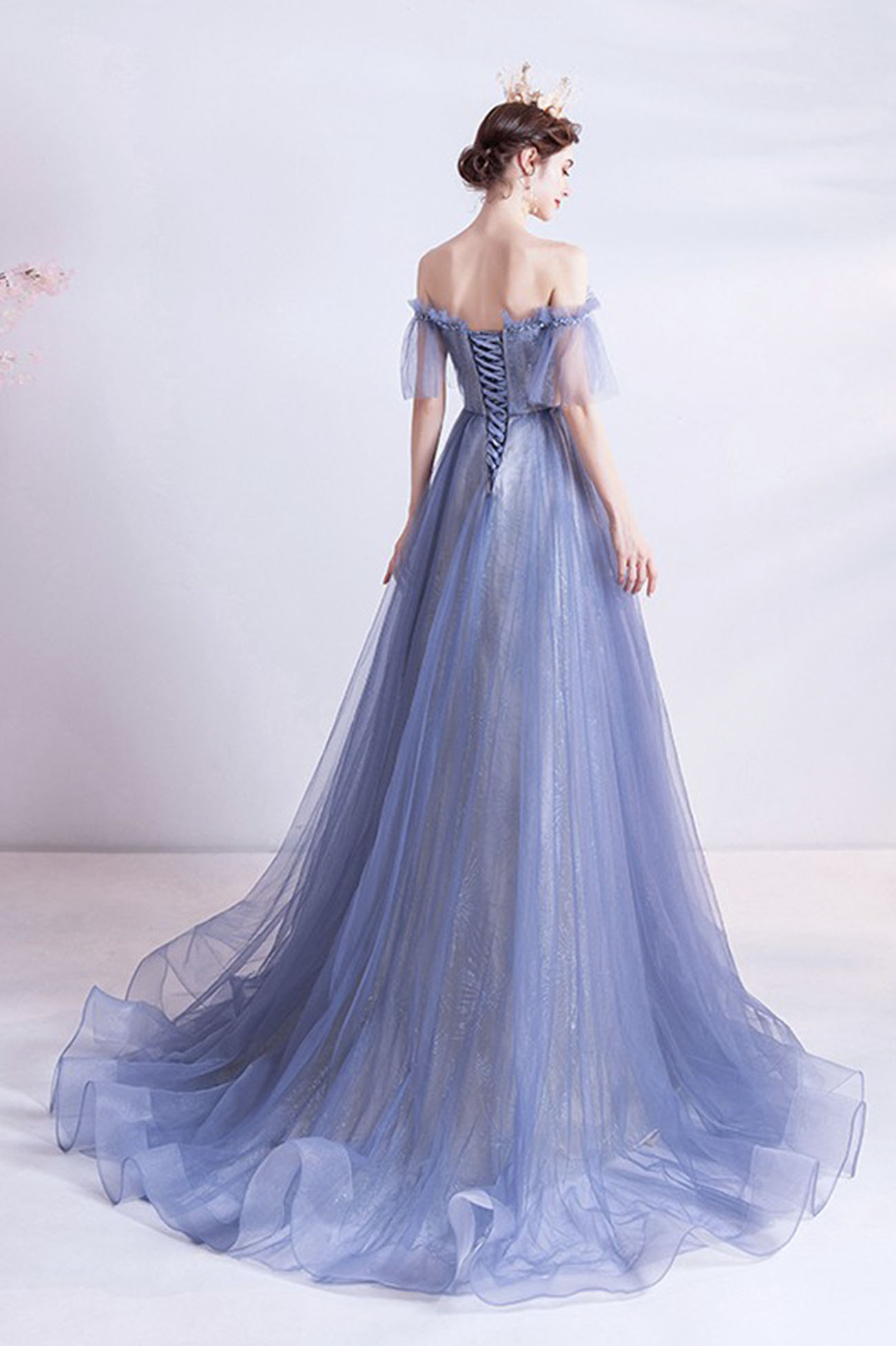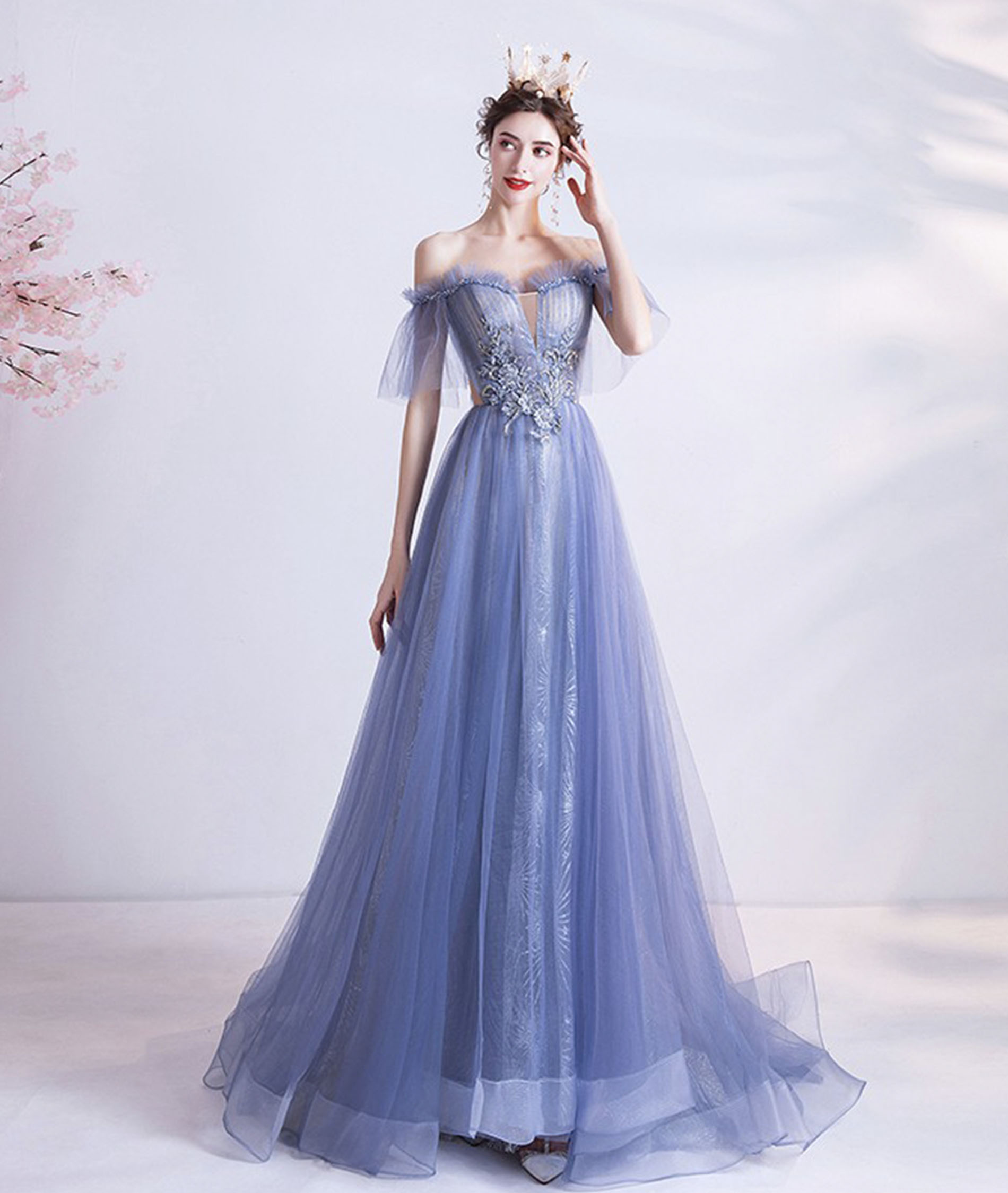 - Blue tulle lace long A-line prom dress blue evening dress -