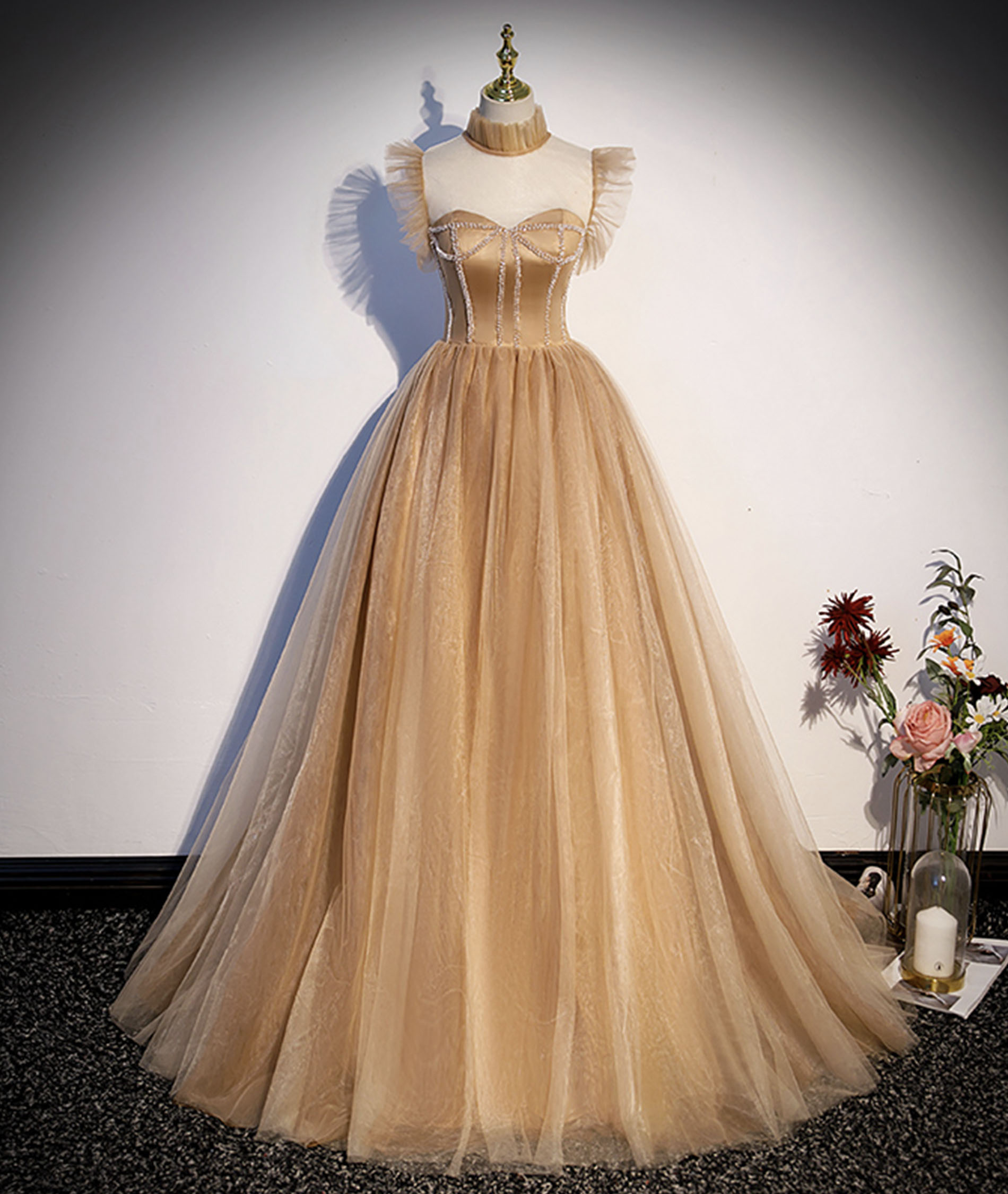 - Cute tulle beaded long A-line prom dress evening dress -